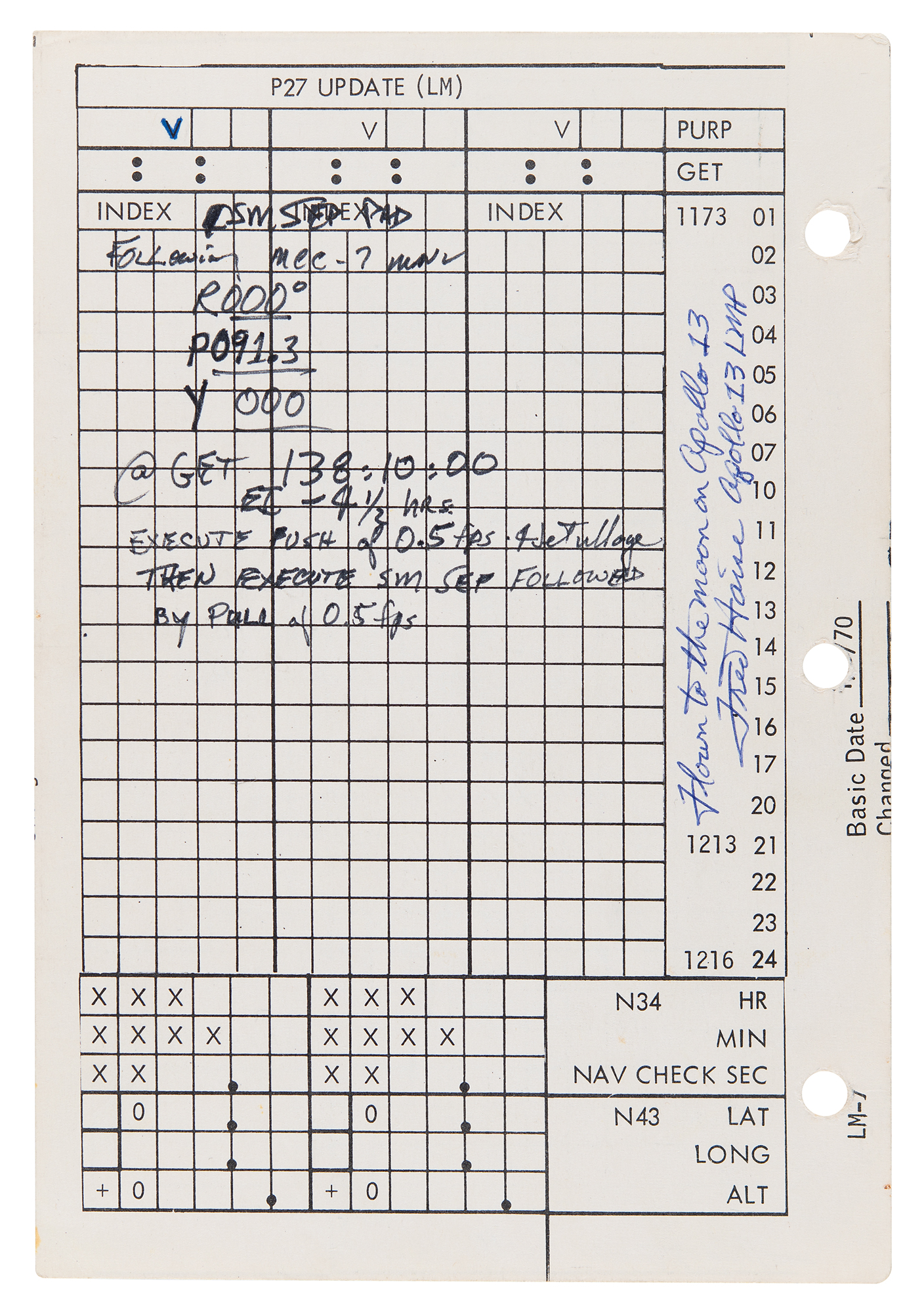 Accompanied by a signed letter of authenticity from Haise, who writes: “Accompanying this letter is a page from our LM Contingency Checklist carried on the flight of Apollo 13. I used this particular page to record critical flight data for both the Service Module and Lunar Module separation maneuvers. My actual flight notes read: ‘SM SEP PAD, Following MCC-7 mau, R 000 (degrees) P 091.3, Y 000. @ GET 138:10:00, EI - 4 1/2 hrs, execute push of 0.5 fps, 4 jet ullage then execute SM Sep followed by pull of 0.5 fps.’ These were the real-time procedures to separate the Service Module from the still-docked Command and Lunar Modules. This CM/LM configuration had never been flown during Apollo.