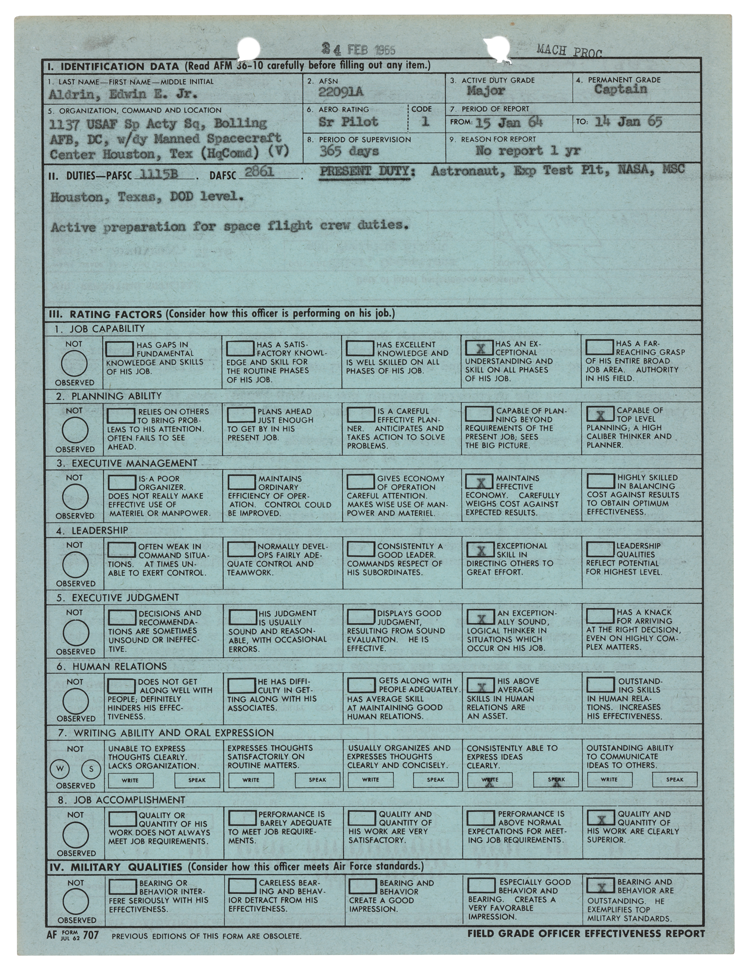 Partly-printed DS, signed “Neil Armstrong” and “D. K. Slayton,” one page both sides, 8 x 10.5, January 1965. A “Field Grade Officer Effectiveness Report” for Major Edwin E. ‘Buzz’ Aldrin, Jr., and his “Active preparation for space flight crew duties.” As the reporting official, Armstrong gives his future Apollo 11 crew member strong grades across the board, grading his ‘Over-All Evaluation' as 'Outstanding, Almost Never Equaled,’ and checking the highest possible mark for ‘Promotion Potential.’ The comments section reads: “Facts and Specific Achievements: This officer has completed an extensive and difficult academic program for astronauts. He maintained an excellent scholastic standing in each of a variety of advanced aerospace courses conducted by university professors, industry and government agency experts. He has worked well with other staff members of the Manned Spacecraft Center. He has maintained an active sрасе- flight readiness program.