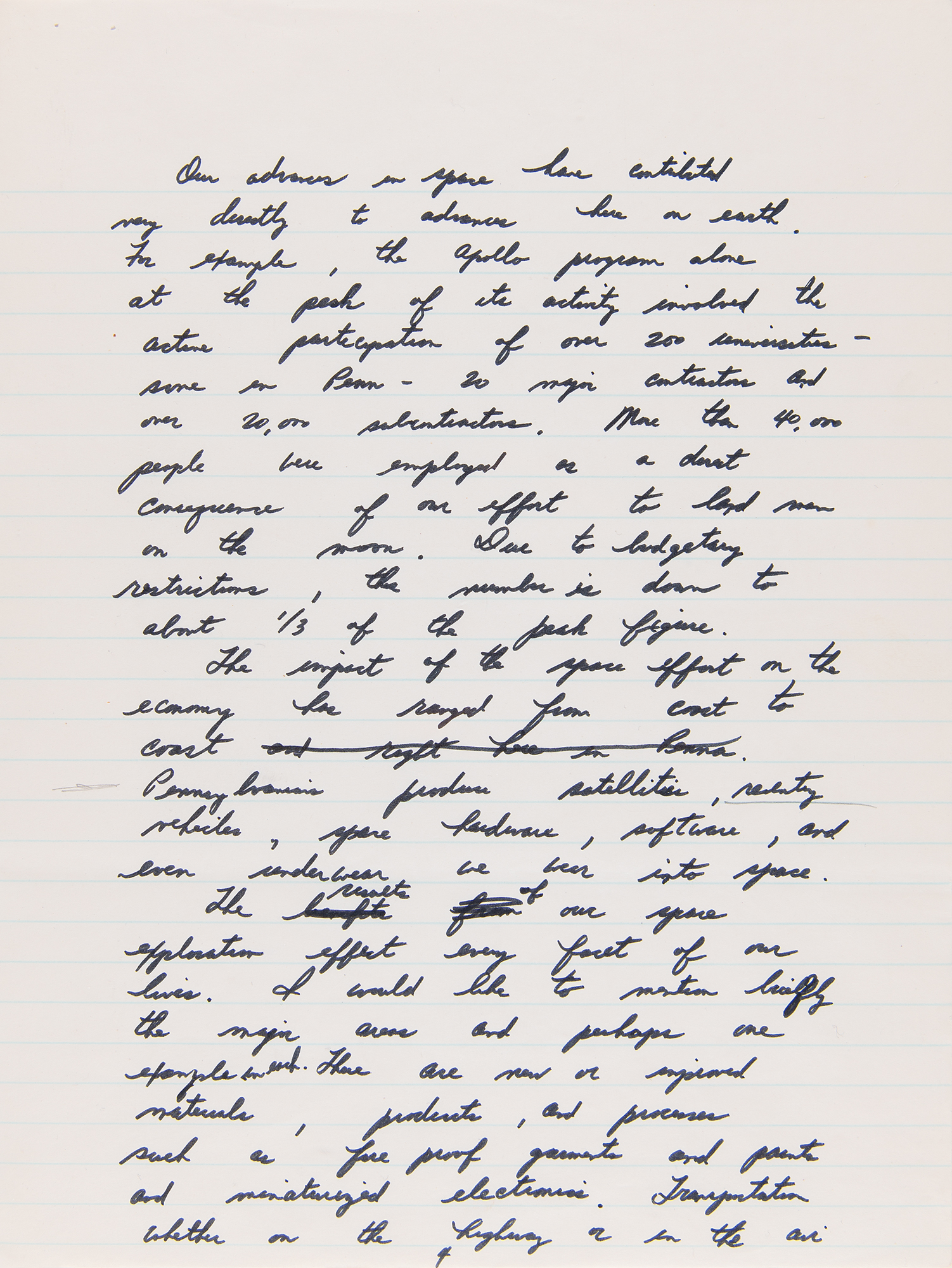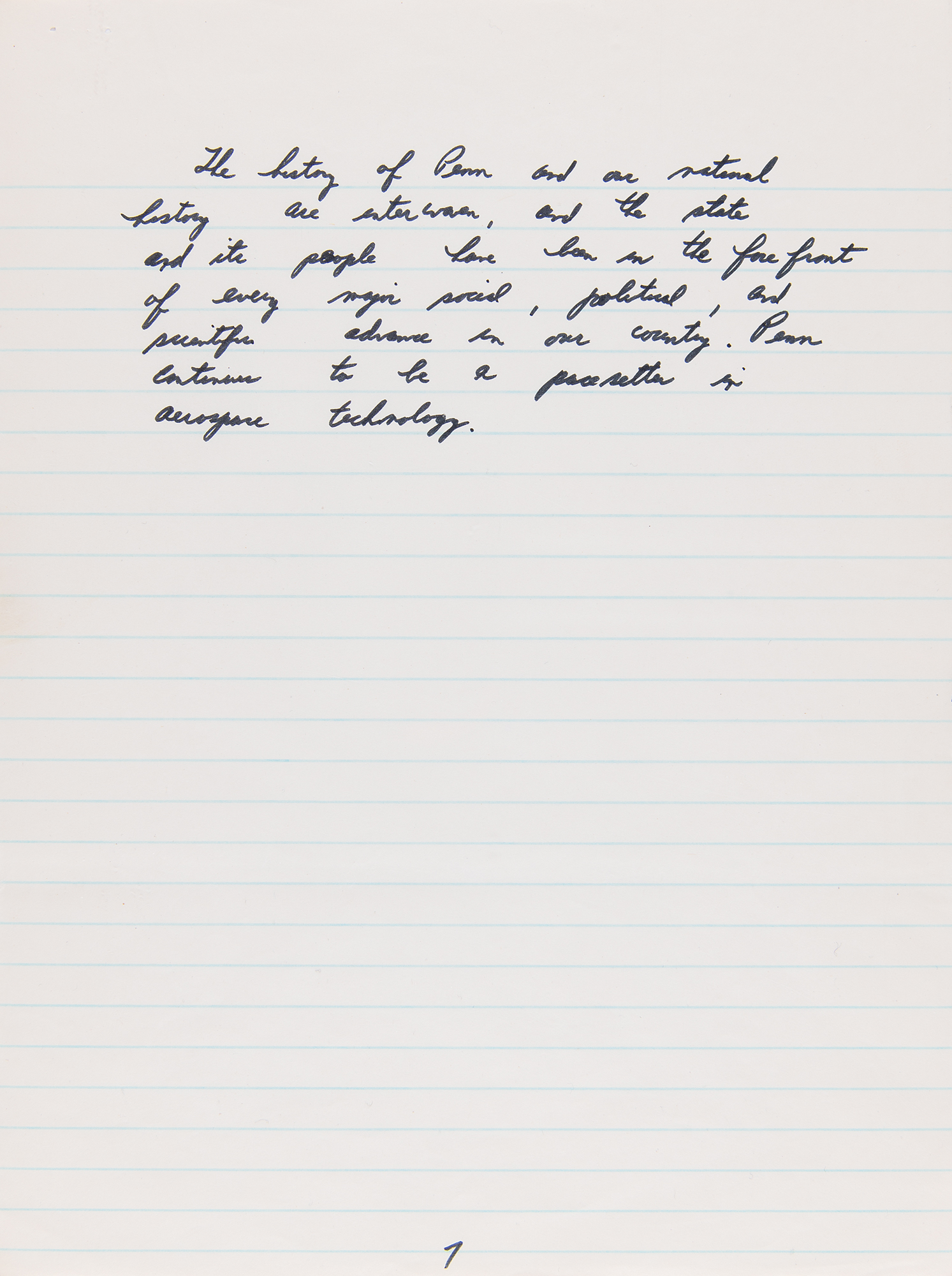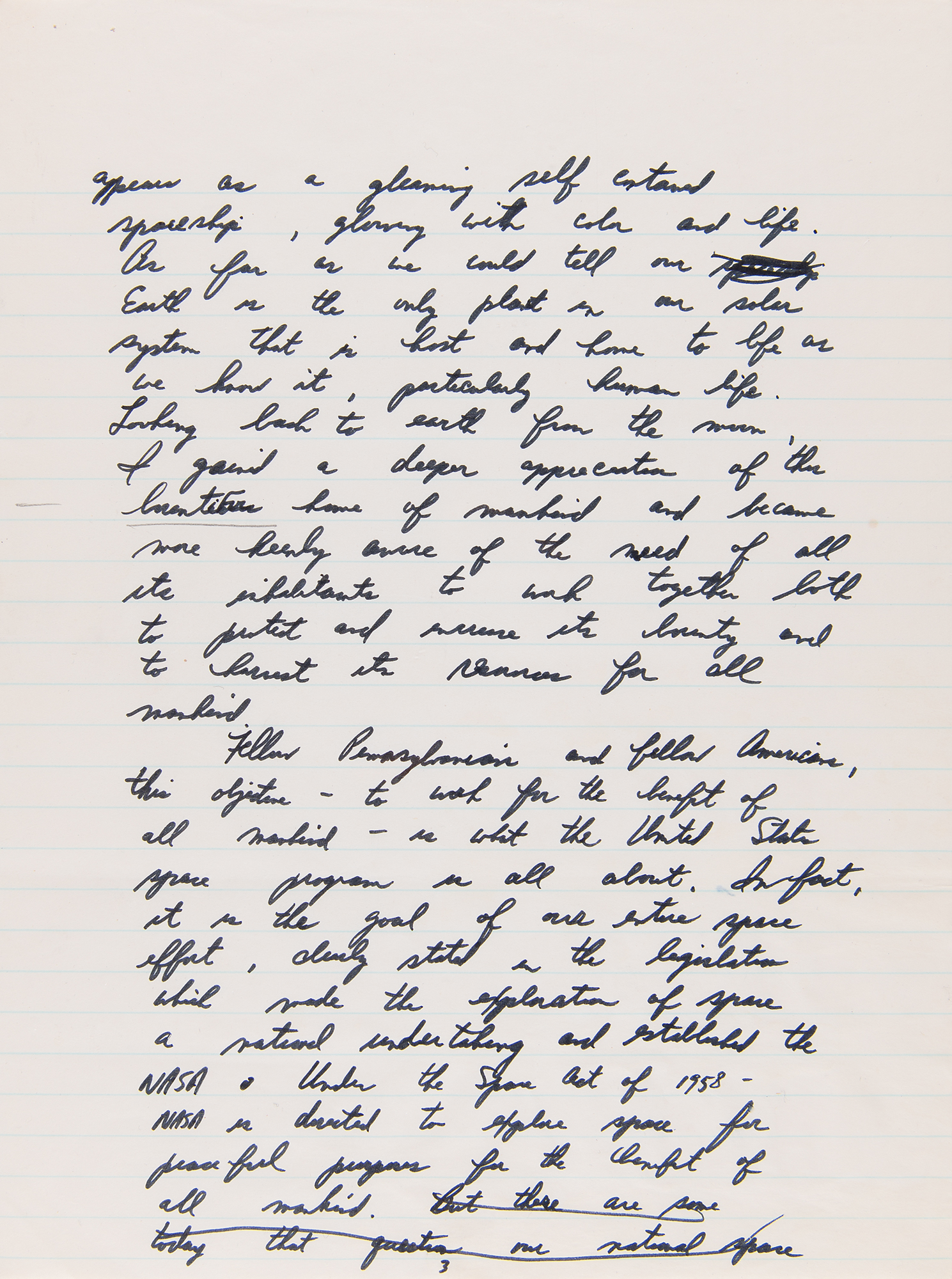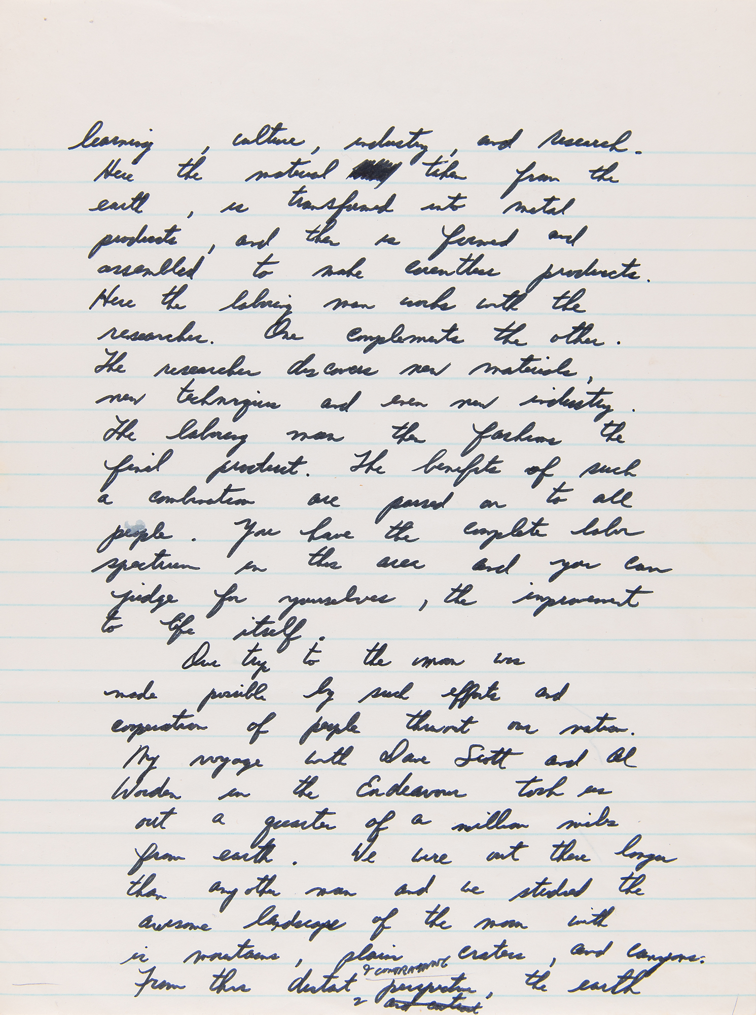 Autograph manuscript speech by Apollo 15 astronaut Jim Irwin, who delivered this speech in his hometown of Pittsburgh, Pennsylvania, on Labor Day, September 6, 1971, as part of the celebratory post-flight tour of Apollo 15, which had successfully splashed down one month earlier. The handwritten speech, unsigned, penned in black felt tip on seven 7.75 x 10.5 notebook sheets, is headed “Pittsburgh, PA” and reads, in part: “I have come home again. Back to earth and back to Pennsylvania…Our trip to the moon was made possible by such efforts and cooperation of people throughout our nation. My voyage with Dave Scott and Al Worden in the Endeavour took us out a quarter of a million miles from earth. We were out there longer than any other man and we studied the awesome landscape of the moon with its mountains, plains, craters and canyons. From this distant & constraining perception, the earth appears as a gleaming self contained spaceship, glowing with color and life. As far as we could tell our Earth is the only planet in our solar system that is host and home to life as we know it, particularly human life. Looking back to earth from the moon, I gained a deeper appreciation of the beautiful home of mankind and became more keenly aware of the need of all its inhabitants to work together both to protect and increase its bounty and to harvest its resources for all mankind.” In fine condition, with some trivial, faint stains on the first page.