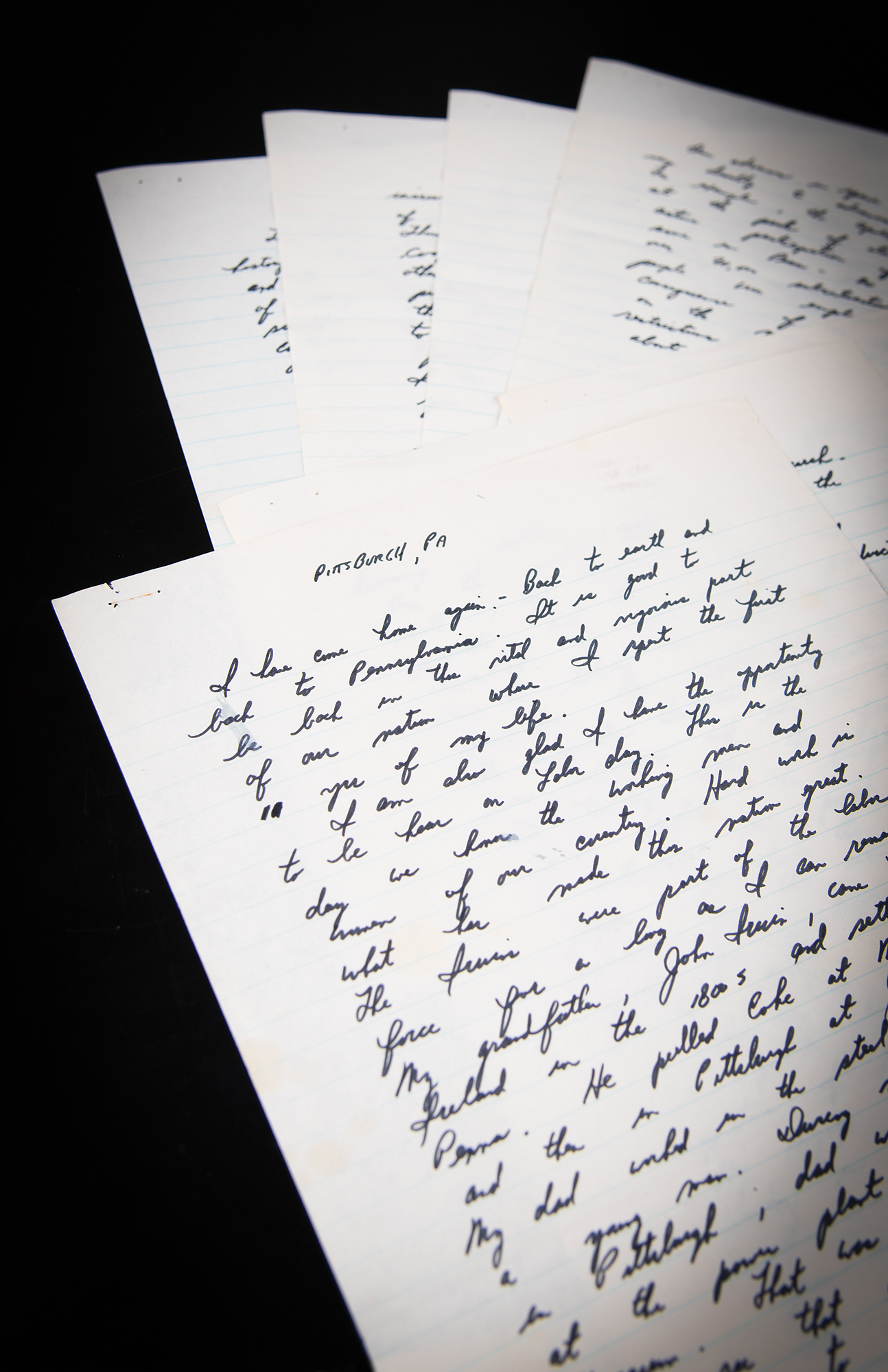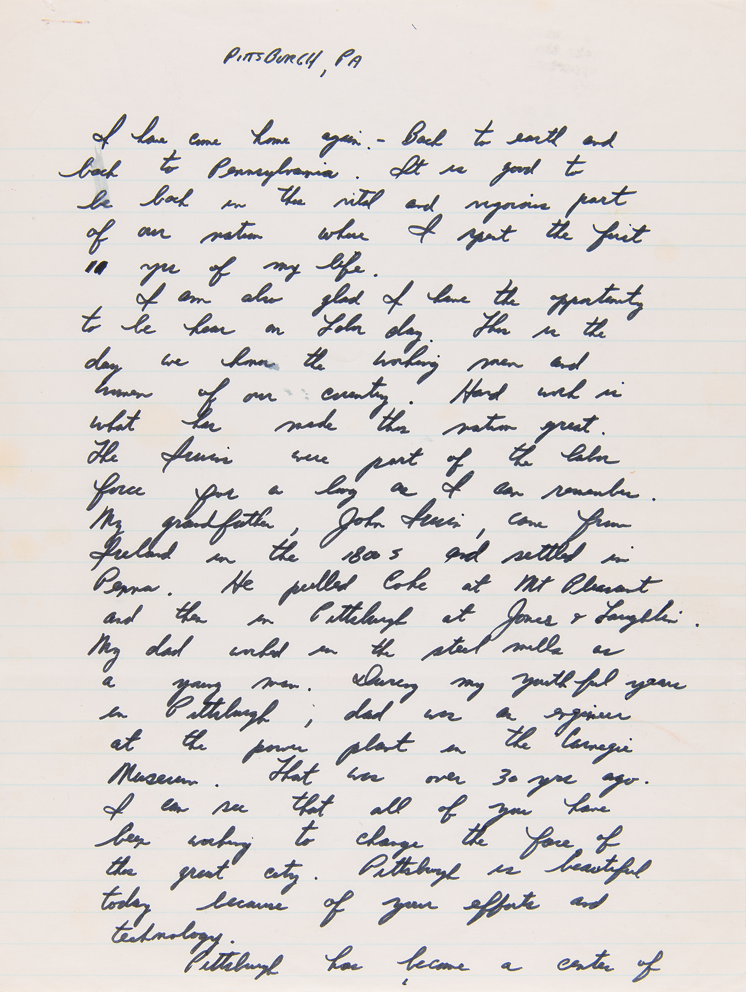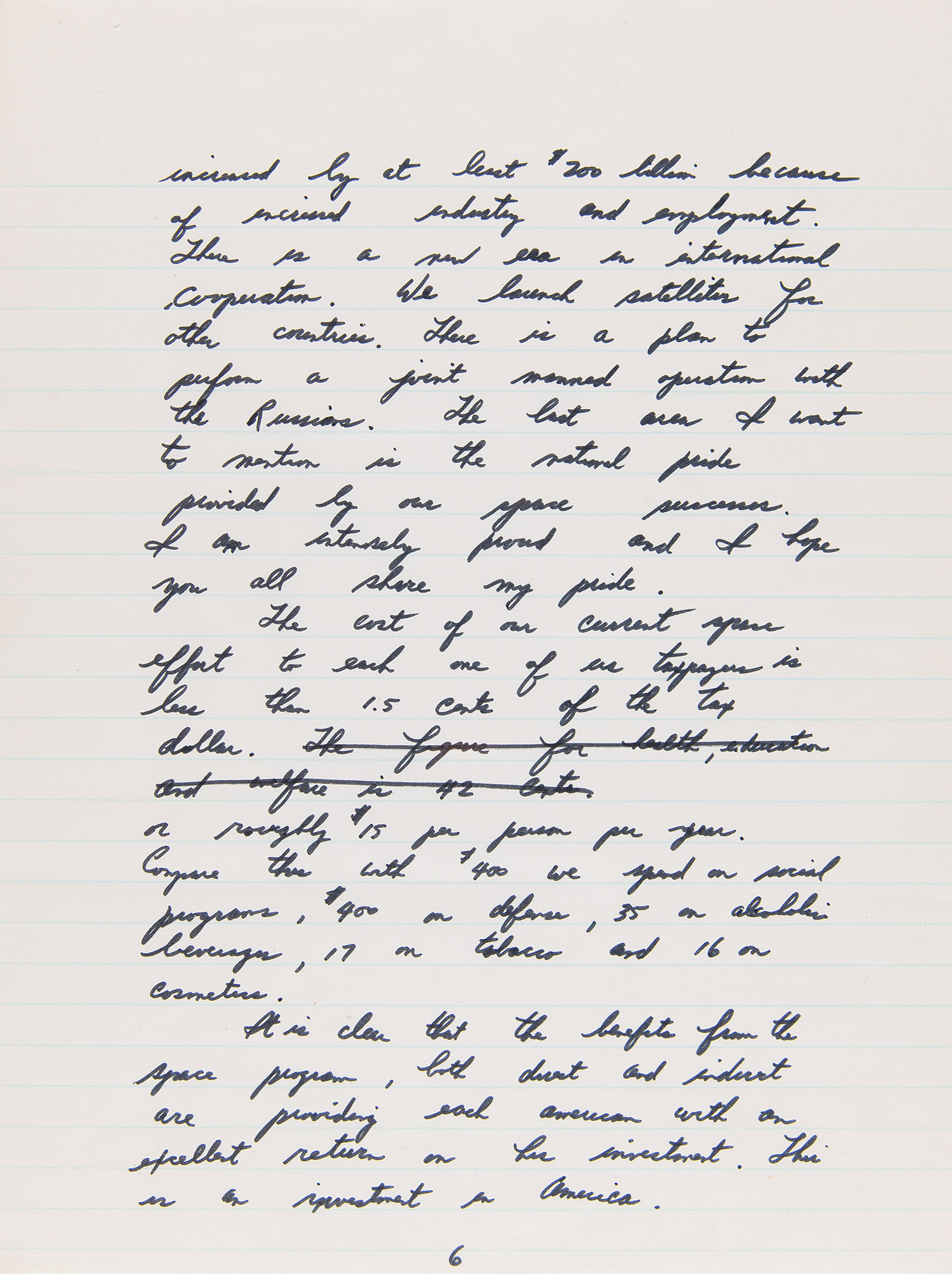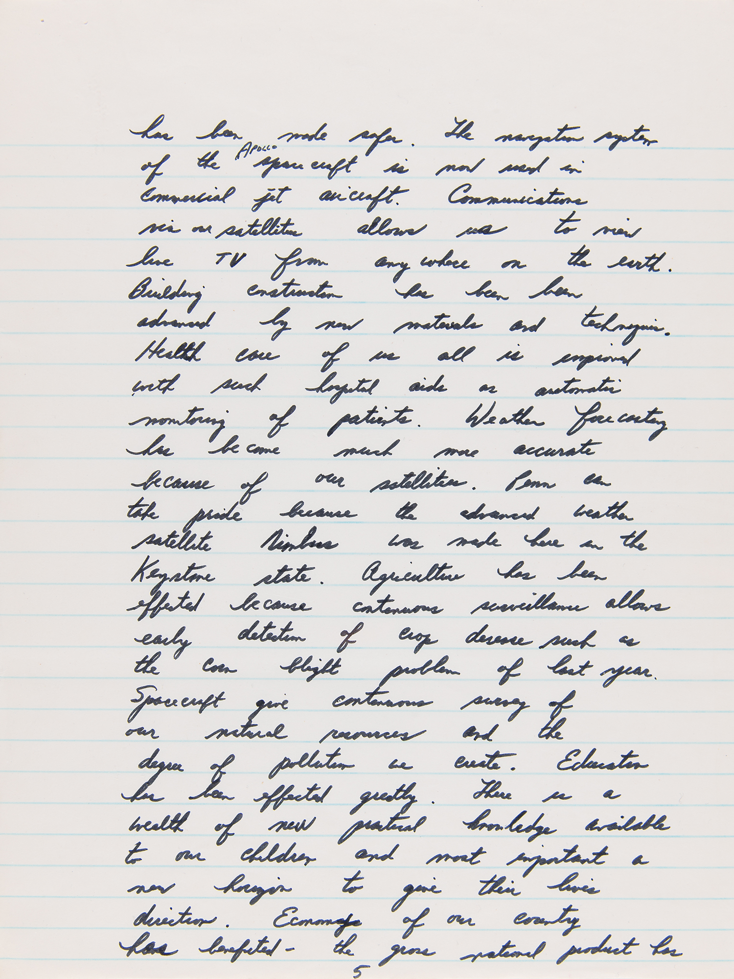 Autograph manuscript speech by Apollo 15 astronaut Jim Irwin, who delivered this speech in his hometown of Pittsburgh, Pennsylvania, on Labor Day, September 6, 1971, as part of the celebratory post-flight tour of Apollo 15, which had successfully splashed down one month earlier. The handwritten speech, unsigned, penned in black felt tip on seven 7.75 x 10.5 notebook sheets, is headed “Pittsburgh, PA” and reads, in part: “I have come home again. Back to earth and back to Pennsylvania…Our trip to the moon was made possible by such efforts and cooperation of people throughout our nation. My voyage with Dave Scott and Al Worden in the Endeavour took us out a quarter of a million miles from earth. We were out there longer than any other man and we studied the awesome landscape of the moon with its mountains, plains, craters and canyons. From this distant & constraining perception, the earth appears as a gleaming self contained spaceship, glowing with color and life. As far as we could tell our Earth is the only planet in our solar system that is host and home to life as we know it, particularly human life. Looking back to earth from the moon, I gained a deeper appreciation of the beautiful home of mankind and became more keenly aware of the need of all its inhabitants to work together both to protect and increase its bounty and to harvest its resources for all mankind.” In fine condition, with some trivial, faint stains on the first page.