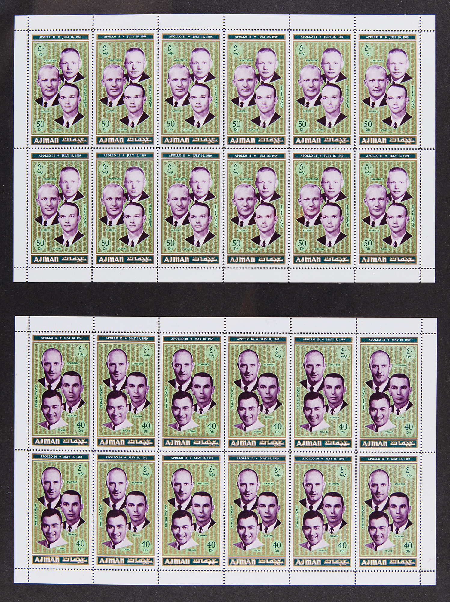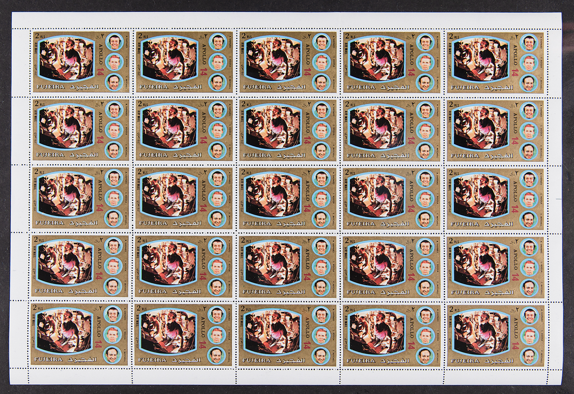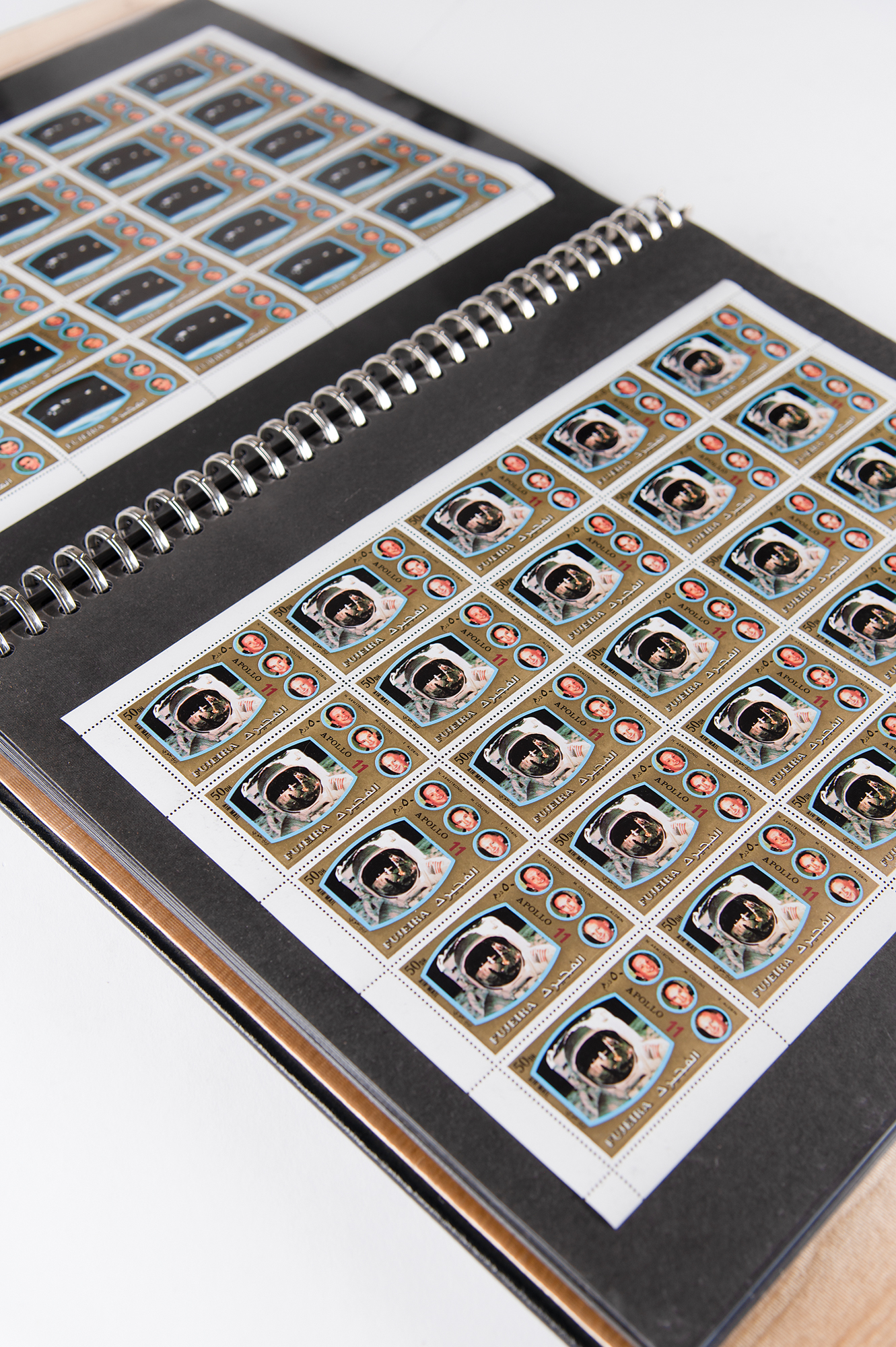 Stuart A. Roosa’s ring-bound binder of commemorative Middle Eastern stamp sheets honoring each manned Apollo mission. The binder contains 11 Fujeira (United Arab Emirates) 25-stamp sheets for Apollo missions 7 through 17; eight Manama (Bahrain) commemorative stamps and stamp sheets for the Apollo 15 mission; and eight Ajman (UAE) commemorative stamp sheets for Apollo missions 7 through 14. Each stamp features images of the Apollo crew members. Also included is an Ajman MA-6 stamp and a Fujeira mission control stamp. In overall fine condition. Accompanied by a letter of authenticity from Rosemary D. Roosa, the daughter of Apollo 14 CMP Stuart A. Roosa.