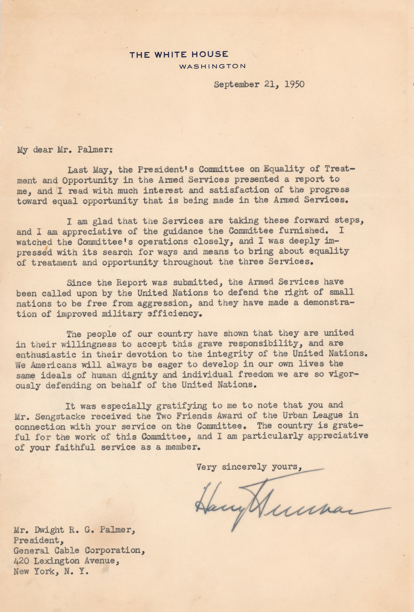 TLS as president, one page, 6.75 x 10, White House letterhead, September 21, 1950. Letter to Dwight R. G. Palmer, president of the General Cable Corporation, commenting on racial integration and the role of the United States in the Korean War. In full: "Last May, the President's Committee on Equality of Treatment and Opportunity in the Armed Services presented a report to me, and I read with much interest and satisfaction of the progress toward equal opportunity that is being made in the Armed Services.