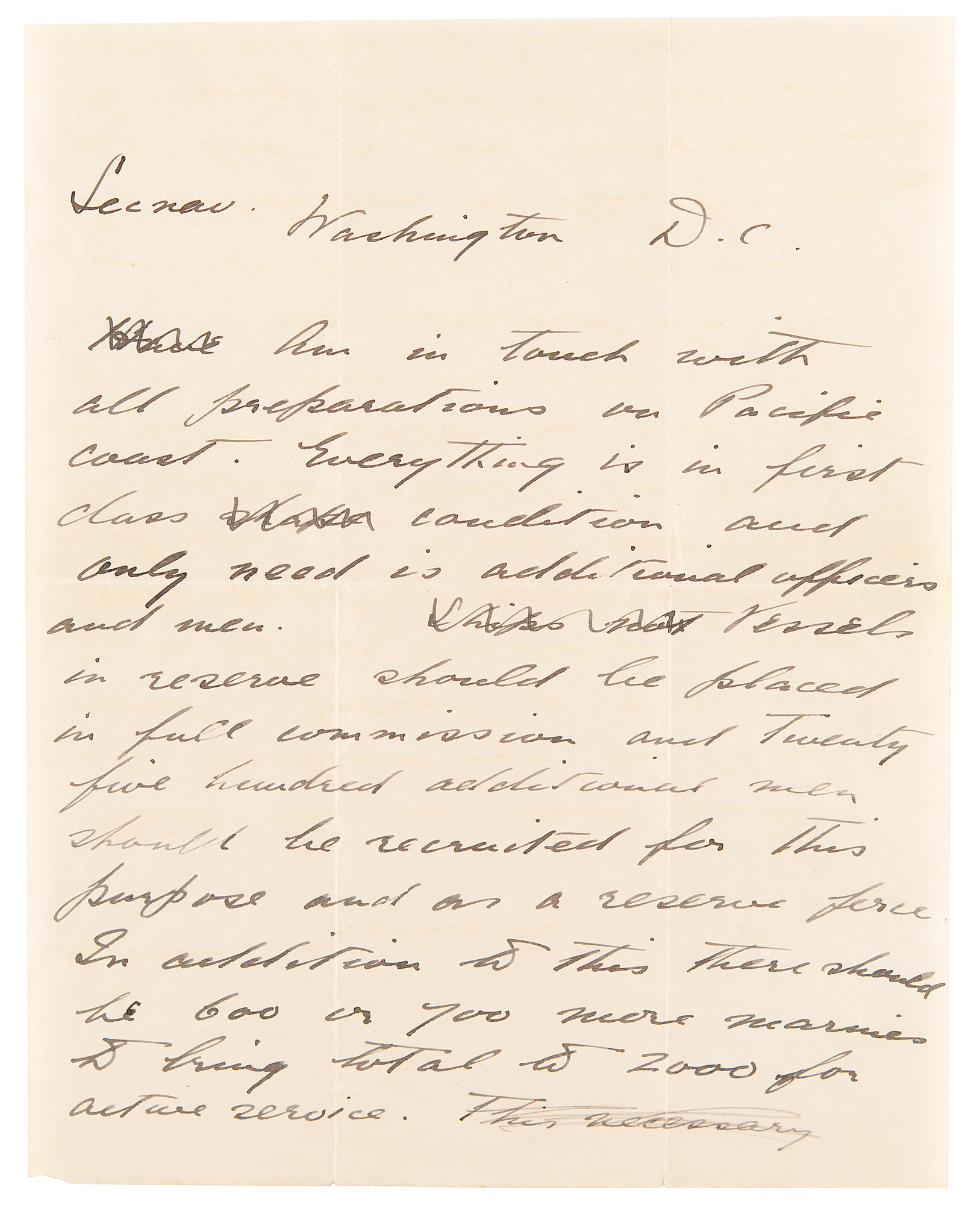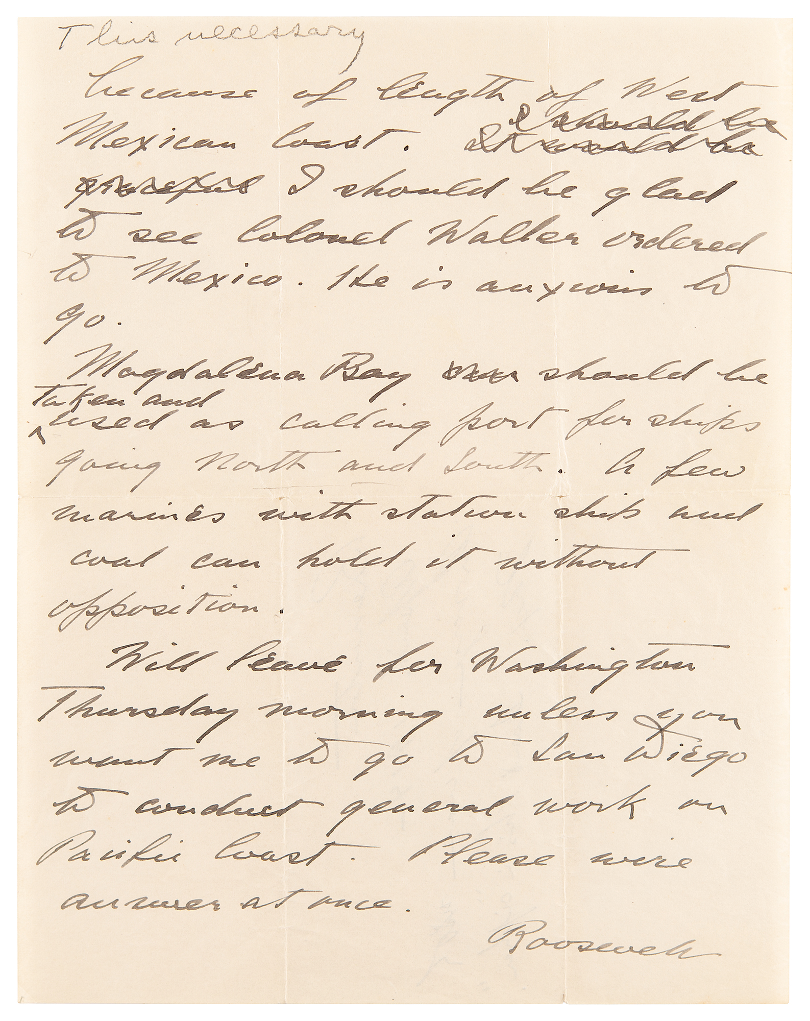 ALS signed "Roosevelt," two pages, 8 x 10, no date but April 21, 1914. Handwritten draft of a letter to Secretary of the Navy Josephus Daniels. In full: "Am in touch with all preparations on Pacific coast. Everything is in first class shape condition and only need is additional officers and men. Ships not Vessels in reserve should be placed in full commission and twenty five hundred additional men should be recruited for this purpose as a reserve force. In addition to this there should be 600 or 700 more marines to bring total to 2000 for active service. This necessary because of length of West Mexican Coast. I would be grateful I should be I should be glad to see Colonel Waller ordered to Mexico. He is anxious to go. Magdalena Bay can should be taken and used as calling port for ships going North and South. A few marines with station ship and coal can hold it without opposition. Will leave for Washington Thursday morning unless you want me to go to San Diego to conduct general work on Pacific Coast. Please wire answer at once." A pencil notation in another hand to the reverse of the second page reads: "Bremerton, April, 1914—On verge of war with Mex. I sent this in 'cipher.'" In fine condition.