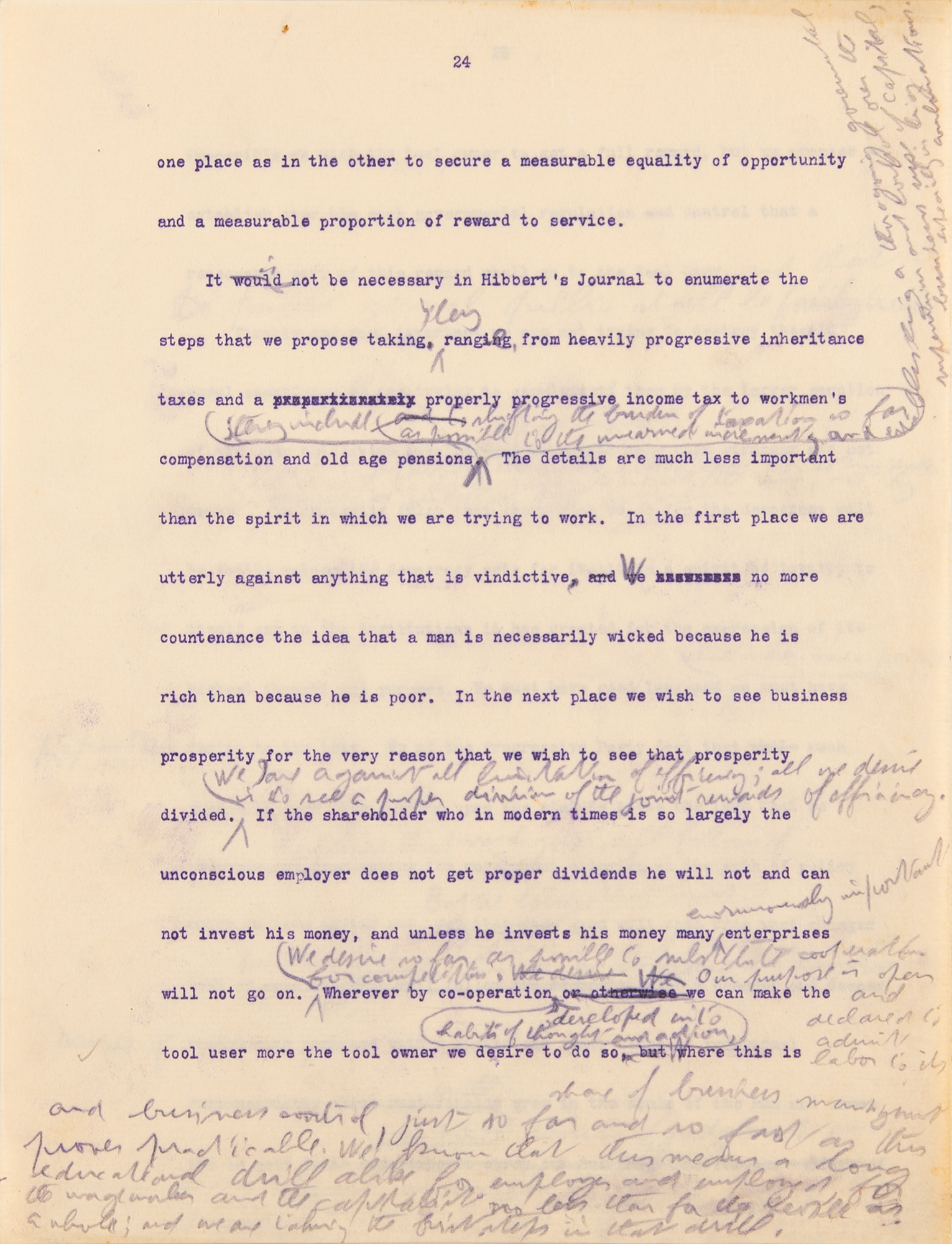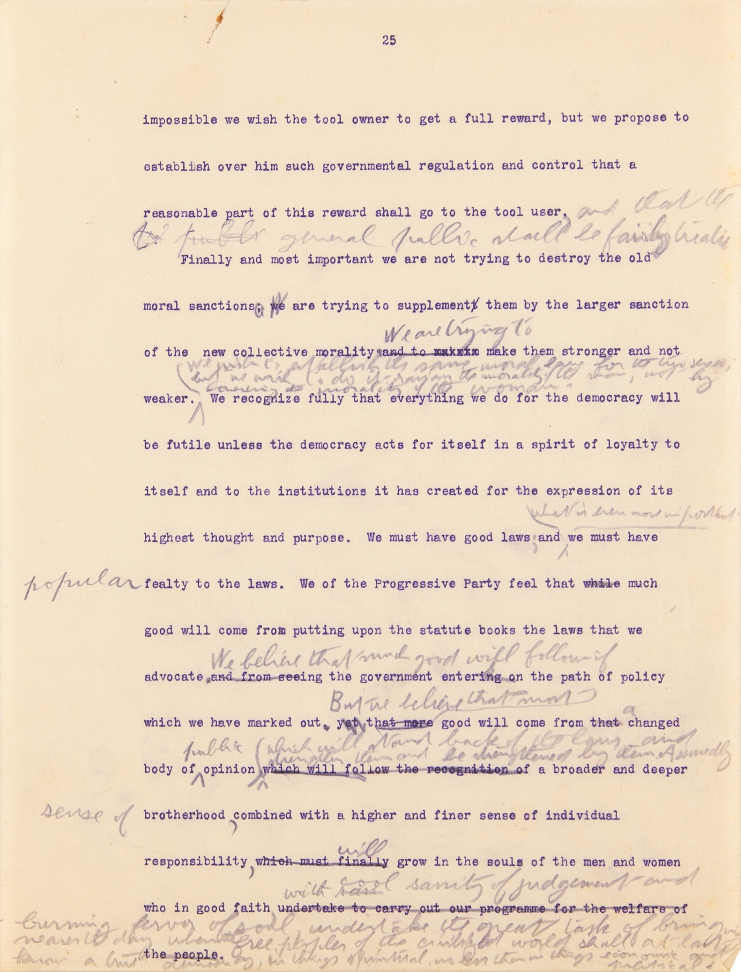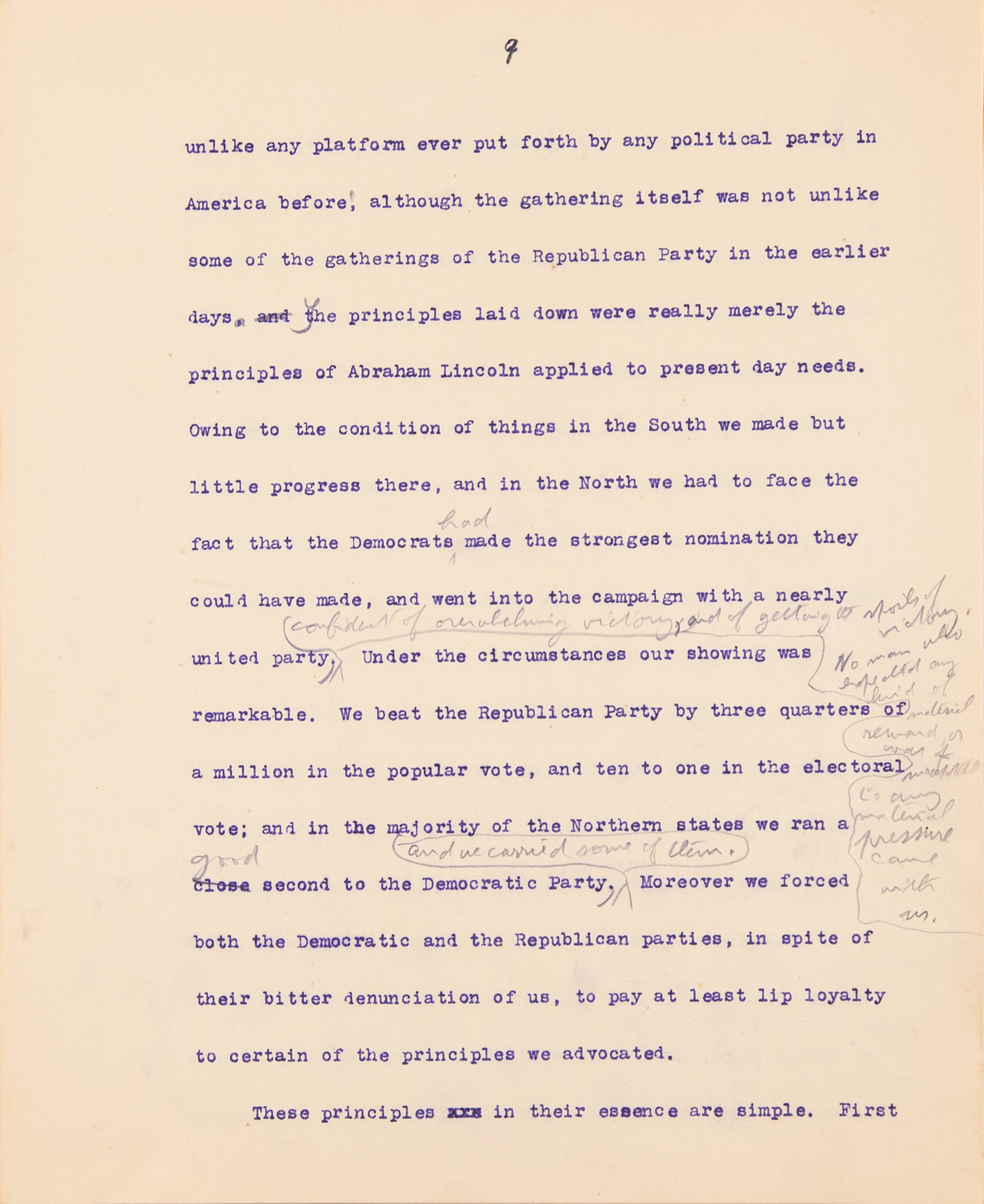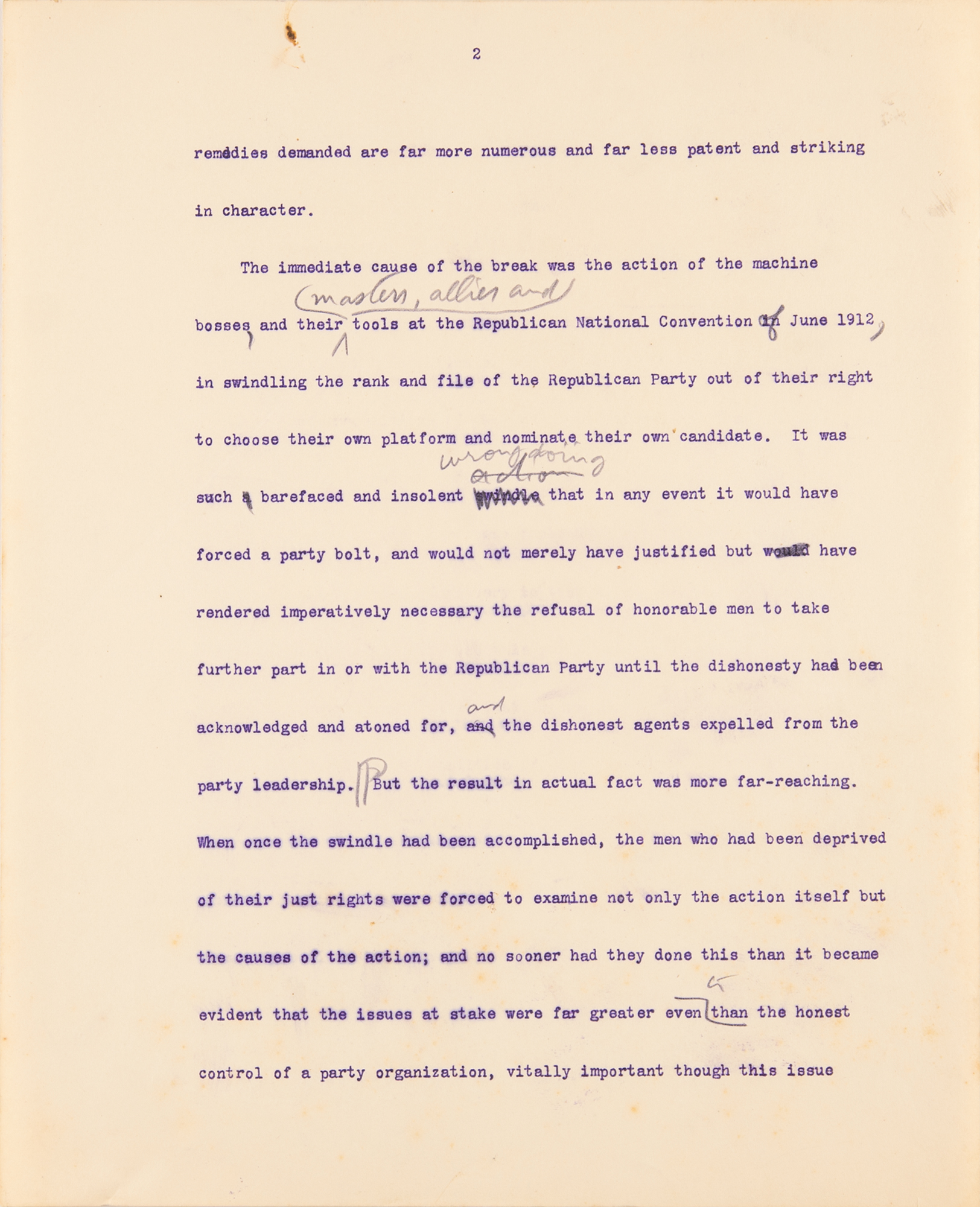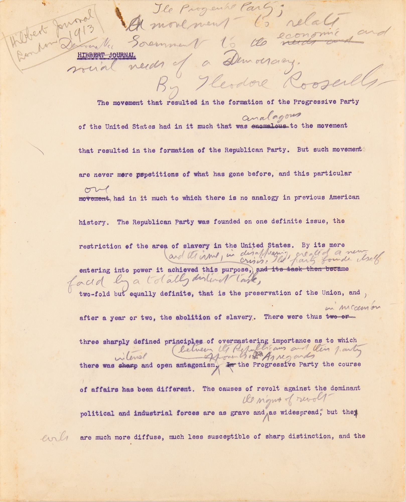 Exceptional typed manuscript draft for an article by Theodore Roosevelt, titled and signed at the head in pencil, "The Progressive Party; A movement to relate Democratic Government to the economic and social needs of a Democracy, By Theodore Roosevelt," 25 pages, 8.5 x 10.5, no date but circa 1913. A forceful article attacking the Republican Party and the decisions made at the 1912 Republican National Convention, also outlining the history, purpose, and ideals of his newly formed Progressive Party—popularly nicknamed the 'Bull Moose Party.' Roosevelt makes extensive corrections to the text in pencil, adding and deleting words, phrases, and complete sentences; only one page remains unamended. The article was ultimately published in London's The Hibbert Journal (Vol. XII, No. 1).