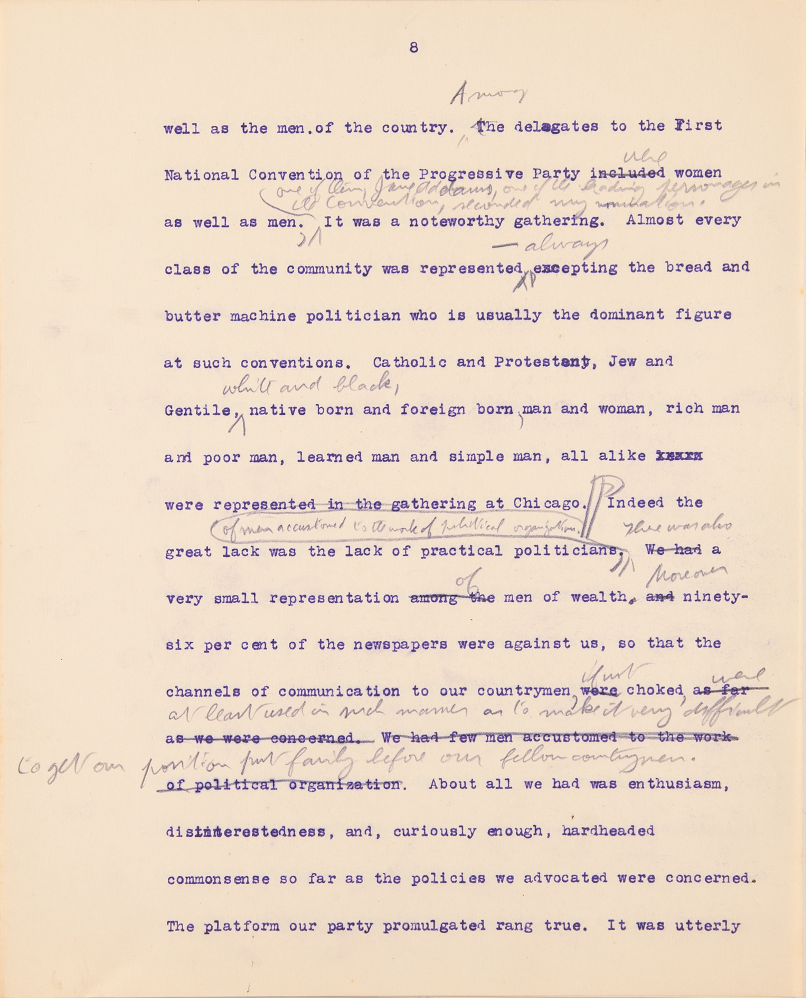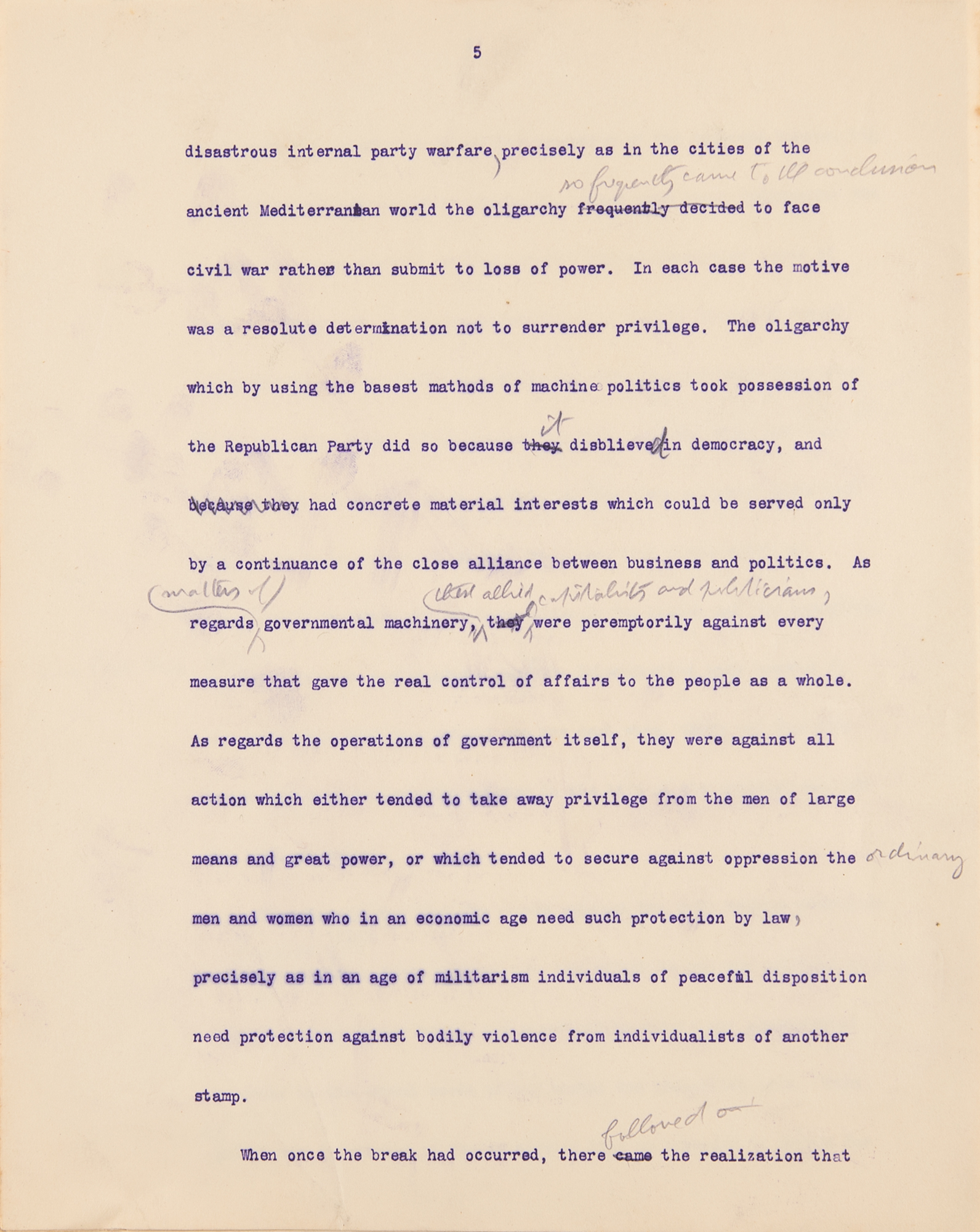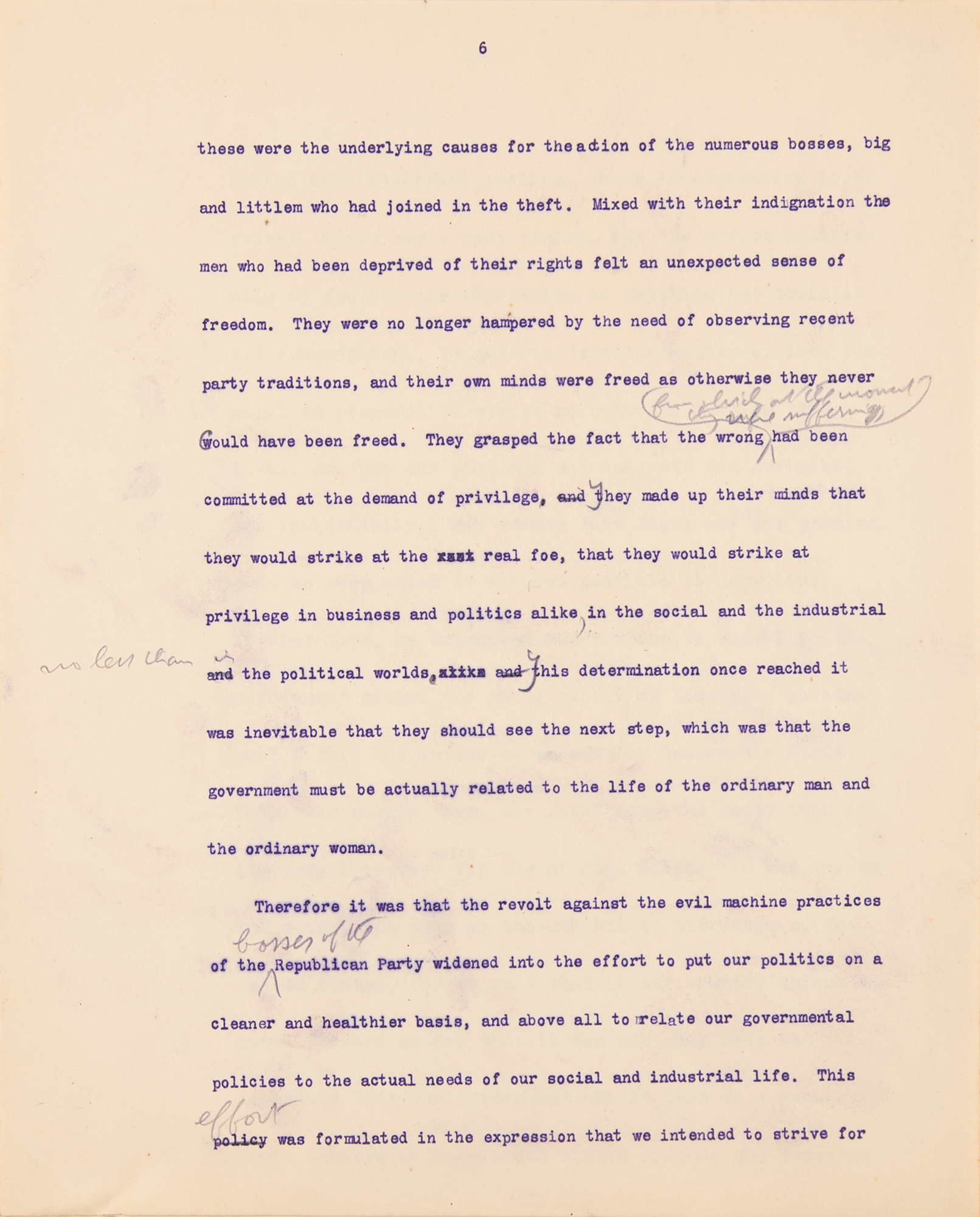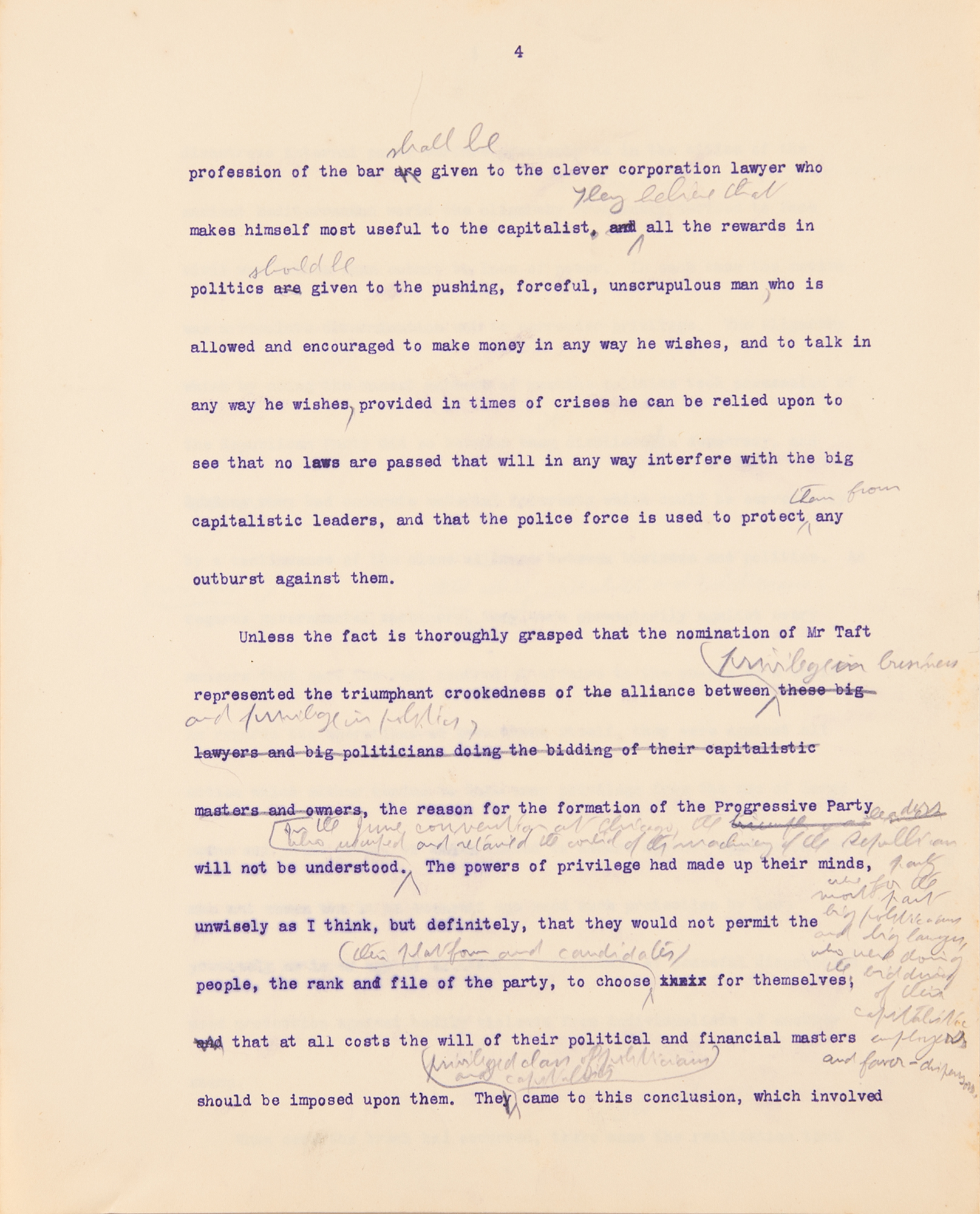Exceptional typed manuscript draft for an article by Theodore Roosevelt, titled and signed at the head in pencil, "The Progressive Party; A movement to relate Democratic Government to the economic and social needs of a Democracy, By Theodore Roosevelt," 25 pages, 8.5 x 10.5, no date but circa 1913. A forceful article attacking the Republican Party and the decisions made at the 1912 Republican National Convention, also outlining the history, purpose, and ideals of his newly formed Progressive Party—popularly nicknamed the 'Bull Moose Party.' Roosevelt makes extensive corrections to the text in pencil, adding and deleting words, phrases, and complete sentences; only one page remains unamended. The article was ultimately published in London's The Hibbert Journal (Vol. XII, No. 1).