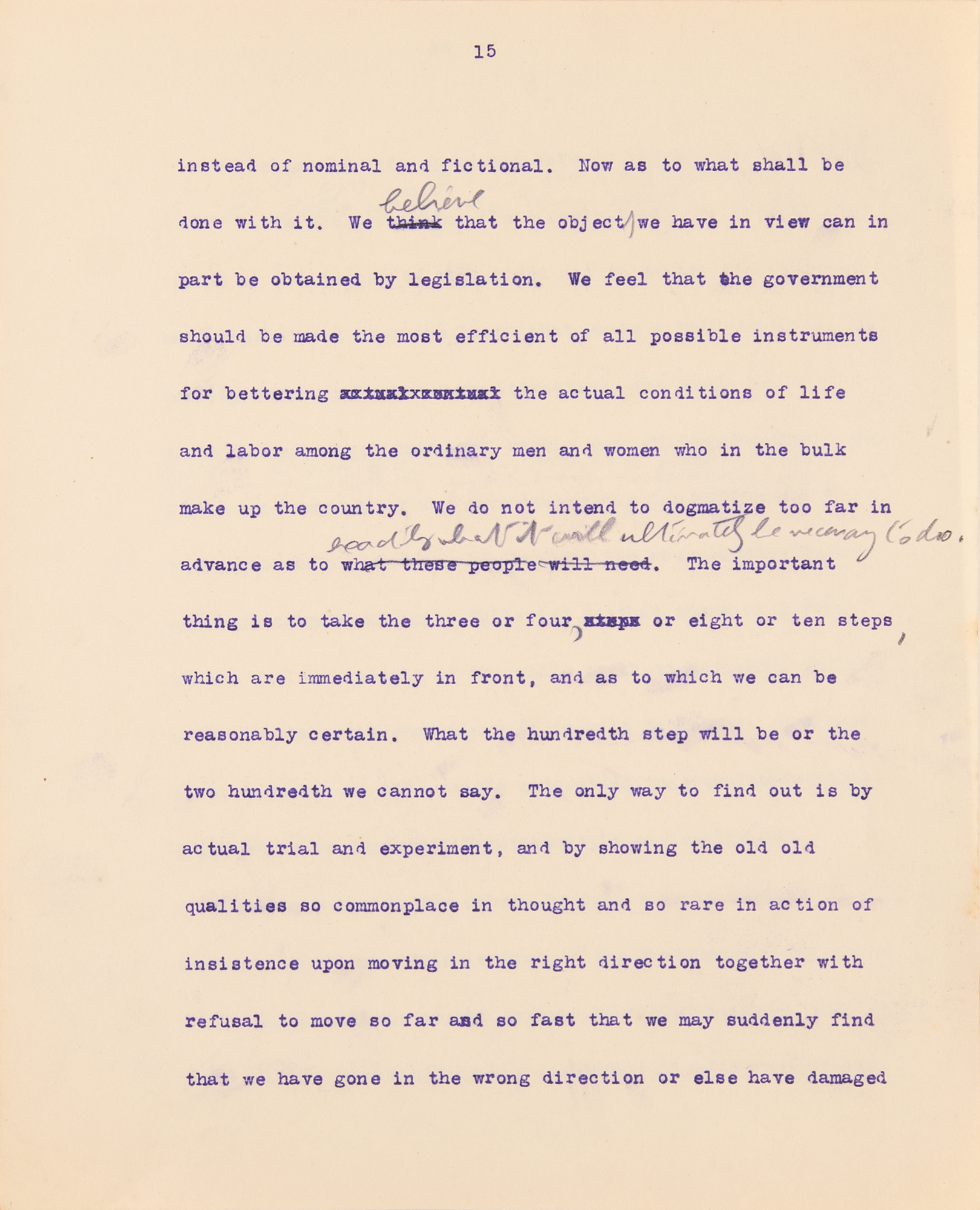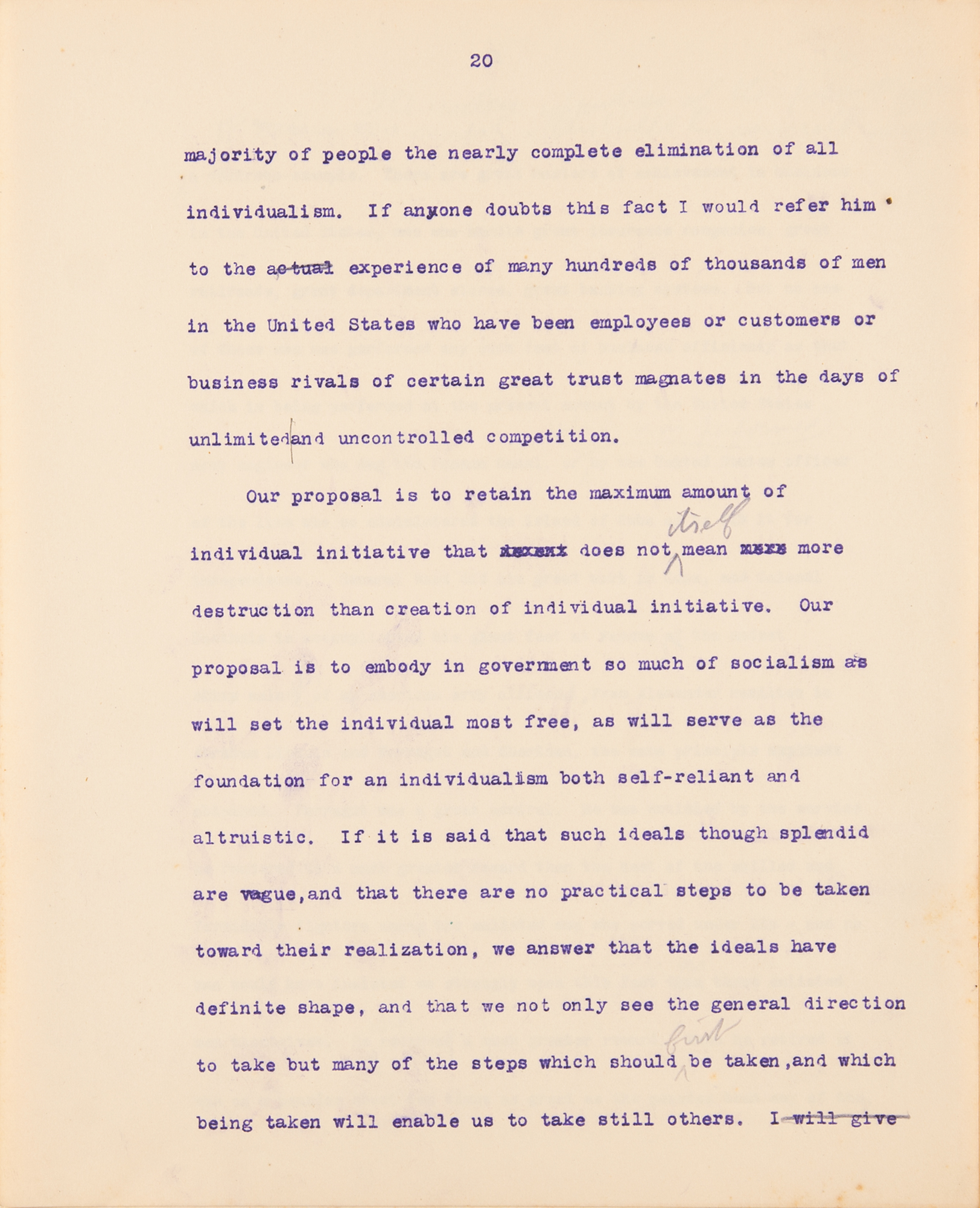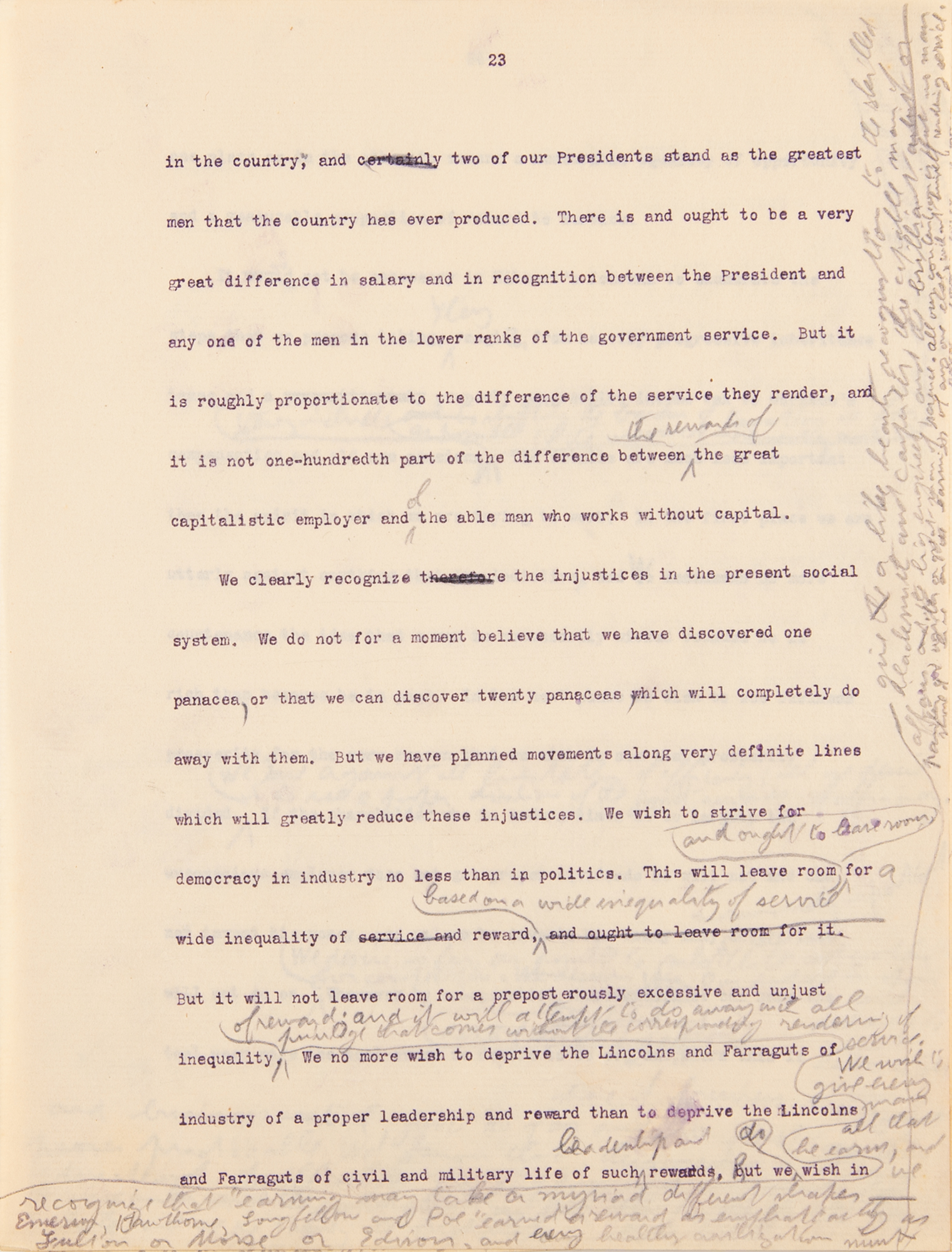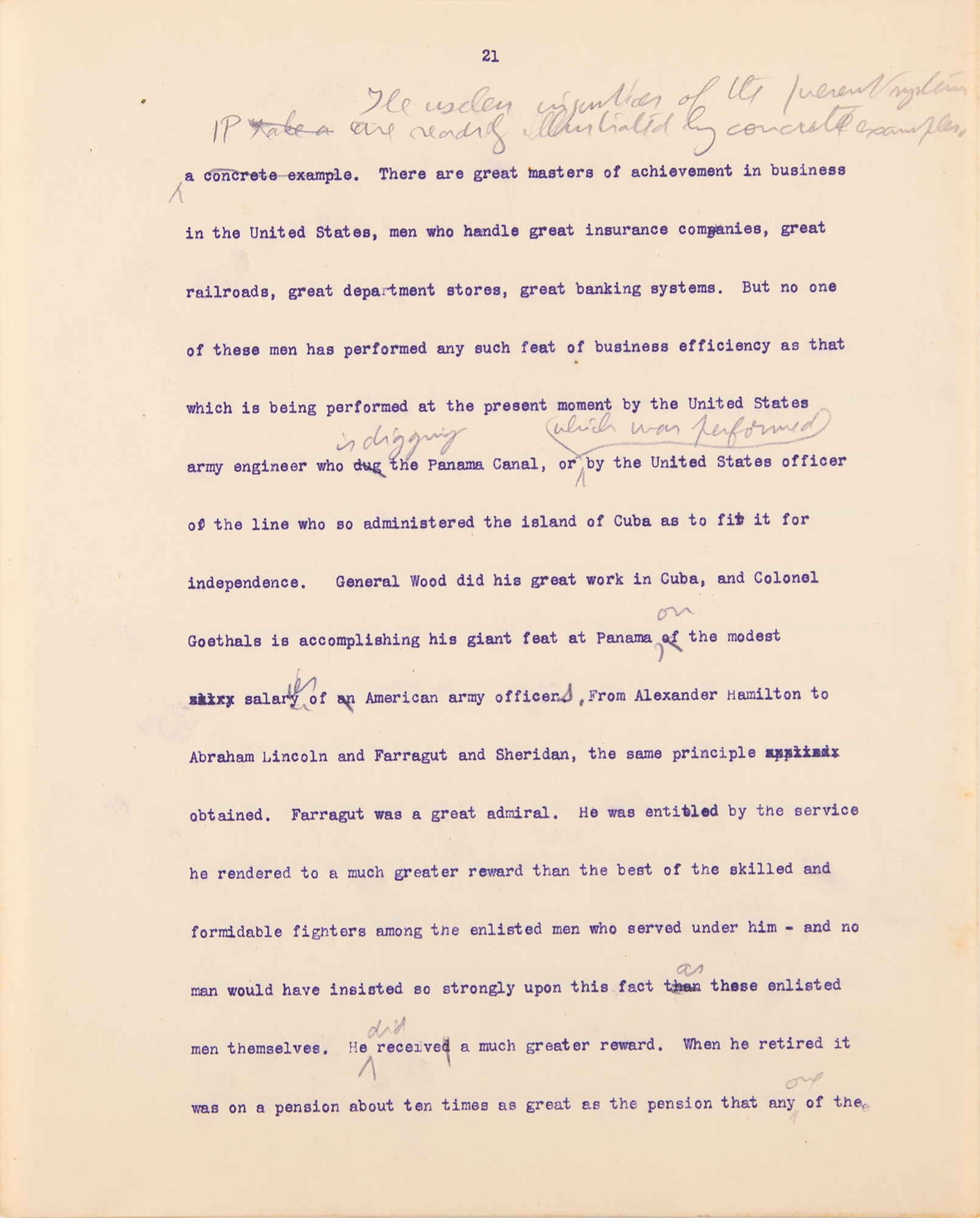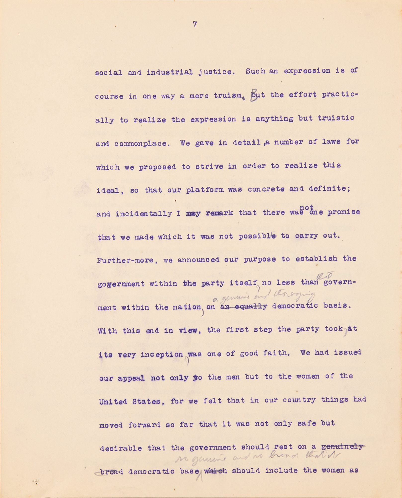Exceptional typed manuscript draft for an article by Theodore Roosevelt, titled and signed at the head in pencil, "The Progressive Party; A movement to relate Democratic Government to the economic and social needs of a Democracy, By Theodore Roosevelt," 25 pages, 8.5 x 10.5, no date but circa 1913. A forceful article attacking the Republican Party and the decisions made at the 1912 Republican National Convention, also outlining the history, purpose, and ideals of his newly formed Progressive Party—popularly nicknamed the 'Bull Moose Party.' Roosevelt makes extensive corrections to the text in pencil, adding and deleting words, phrases, and complete sentences; only one page remains unamended. The article was ultimately published in London's The Hibbert Journal (Vol. XII, No. 1).