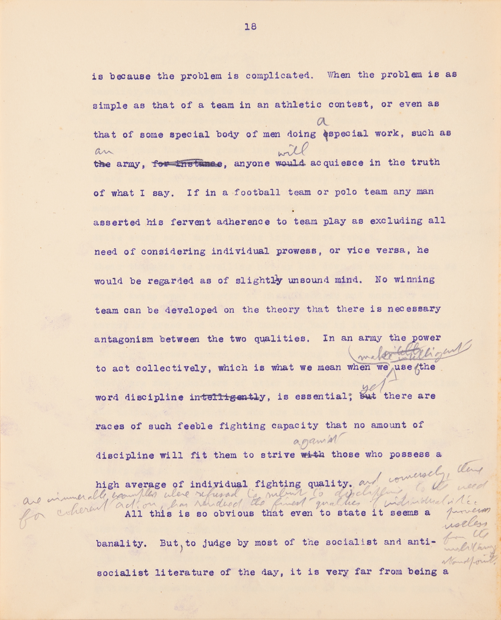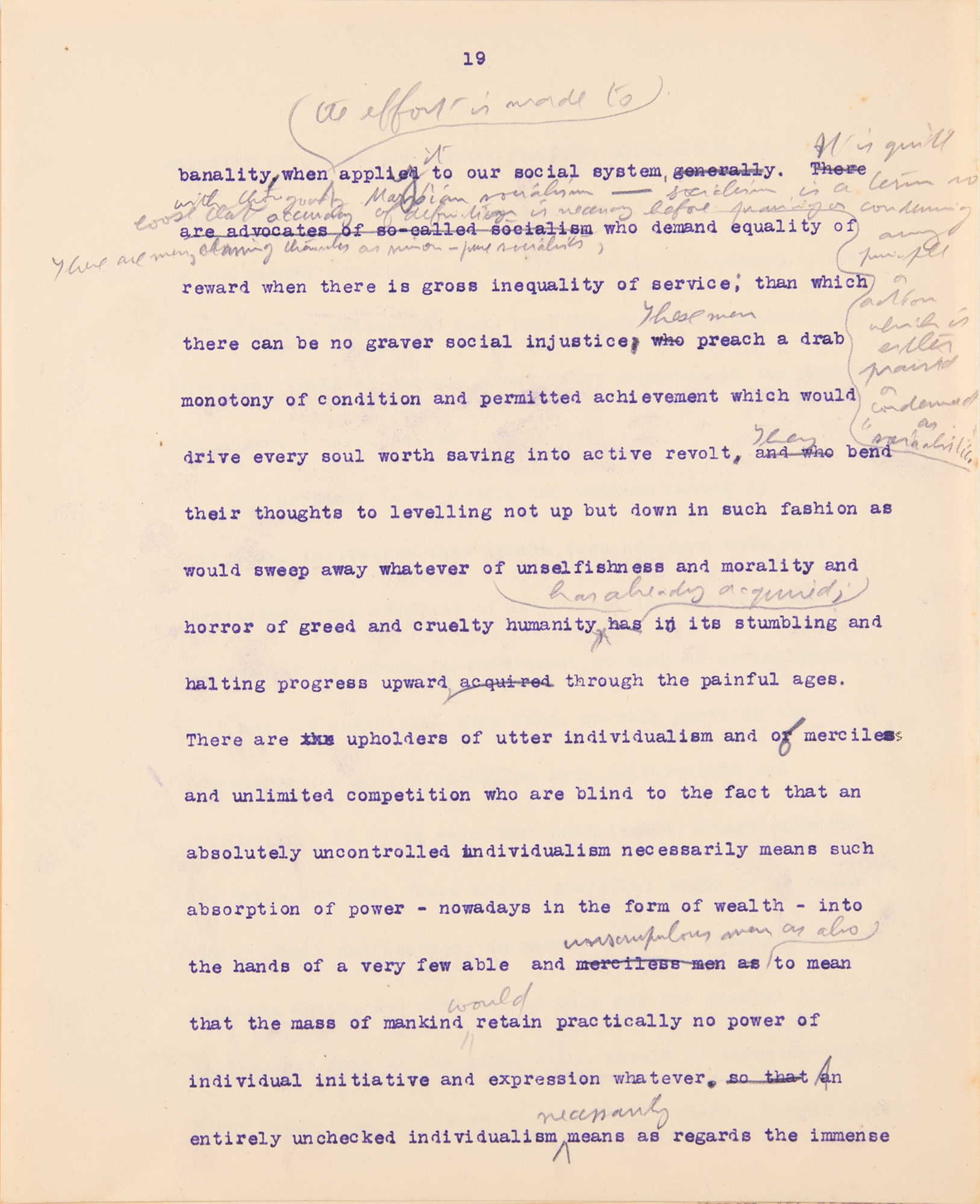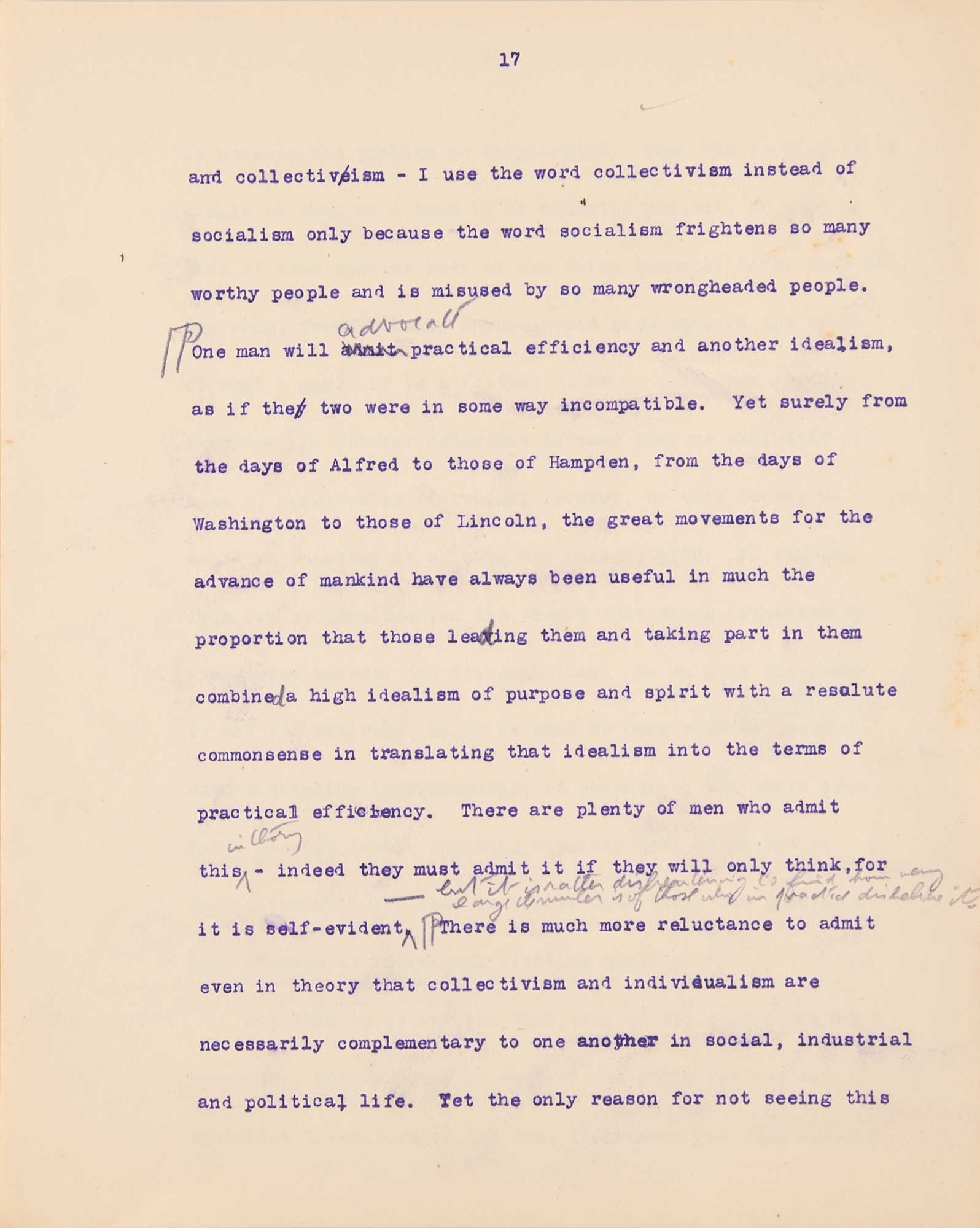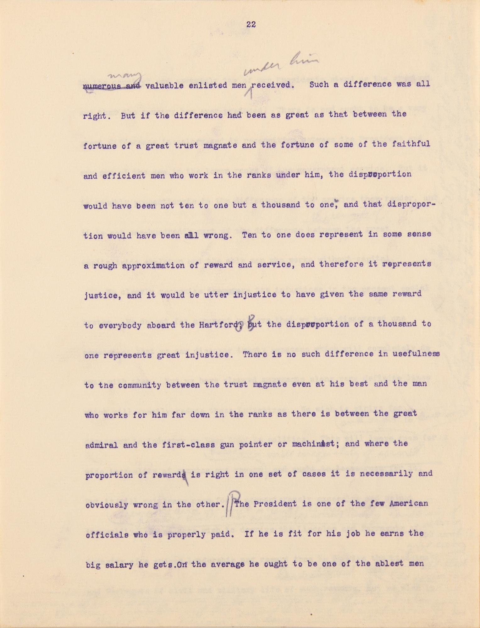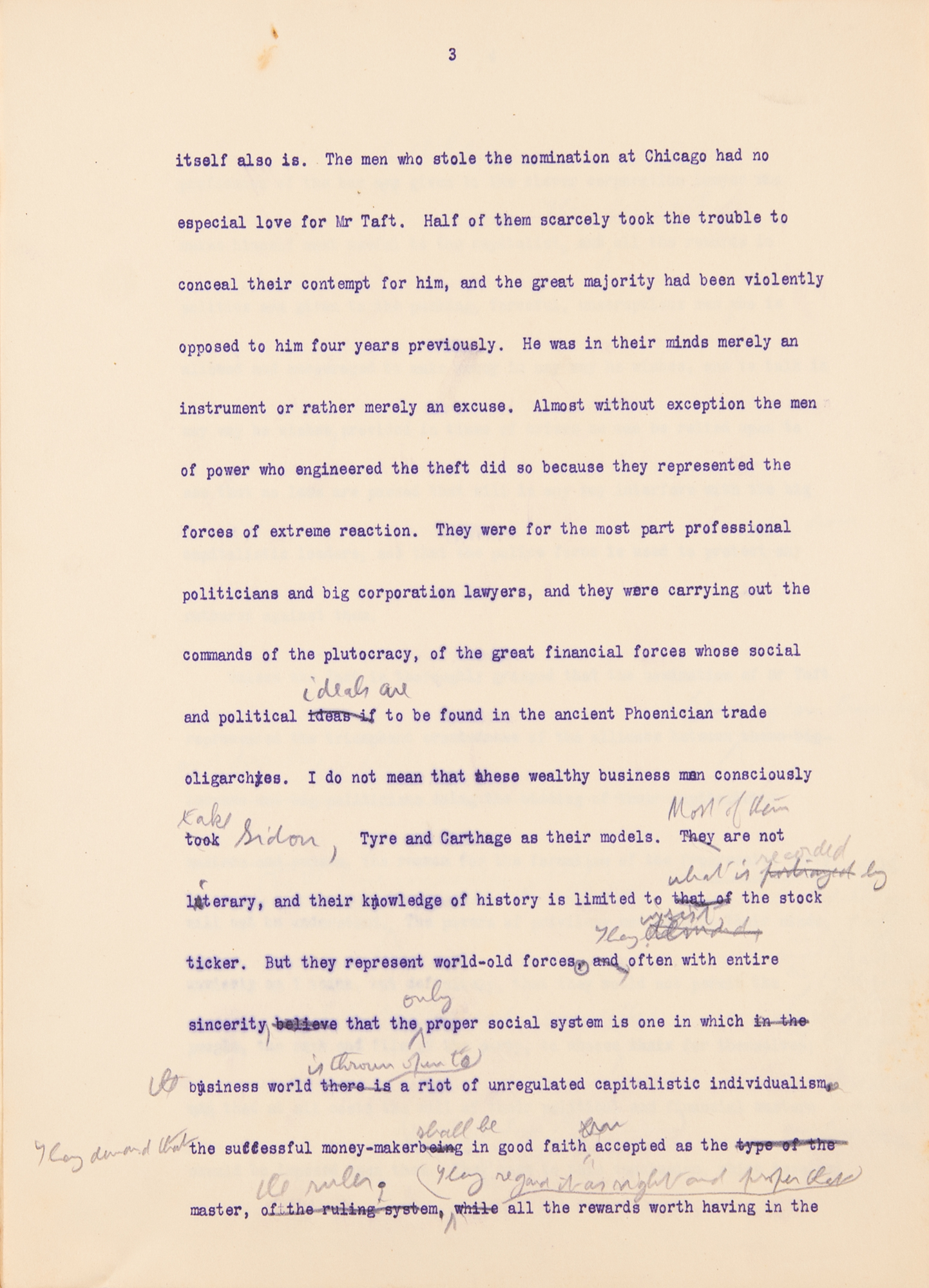 Exceptional typed manuscript draft for an article by Theodore Roosevelt, titled and signed at the head in pencil, "The Progressive Party; A movement to relate Democratic Government to the economic and social needs of a Democracy, By Theodore Roosevelt," 25 pages, 8.5 x 10.5, no date but circa 1913. A forceful article attacking the Republican Party and the decisions made at the 1912 Republican National Convention, also outlining the history, purpose, and ideals of his newly formed Progressive Party—popularly nicknamed the 'Bull Moose Party.' Roosevelt makes extensive corrections to the text in pencil, adding and deleting words, phrases, and complete sentences; only one page remains unamended. The article was ultimately published in London's The Hibbert Journal (Vol. XII, No. 1).