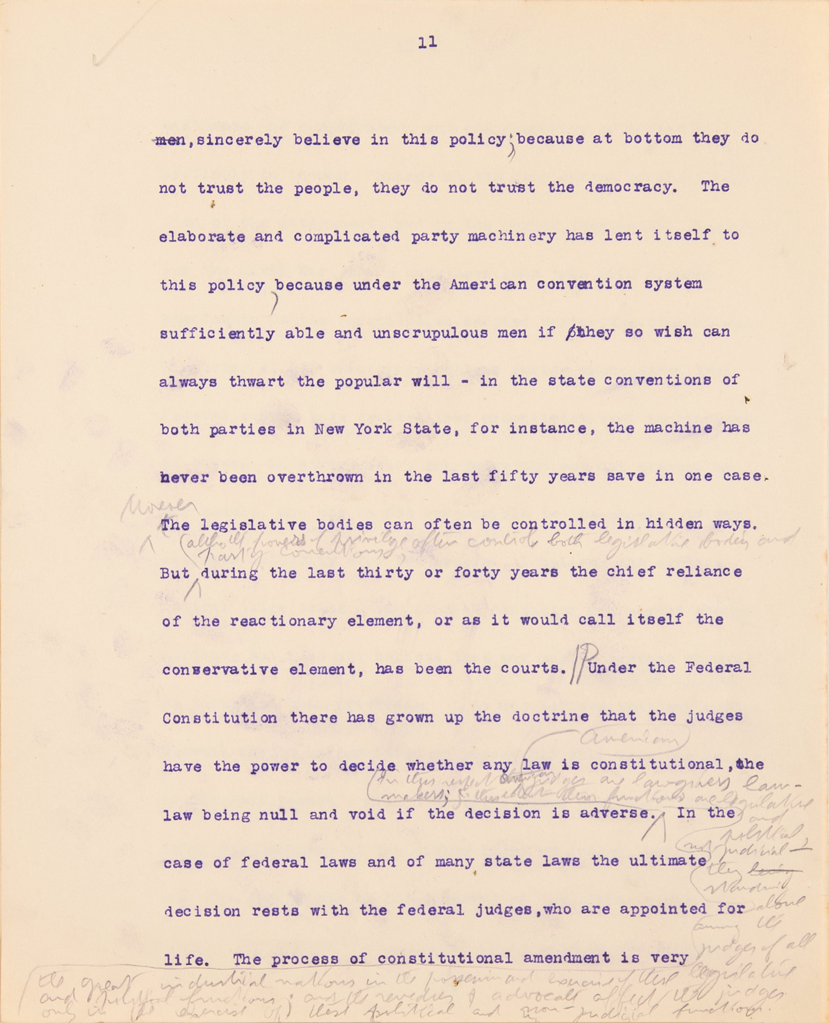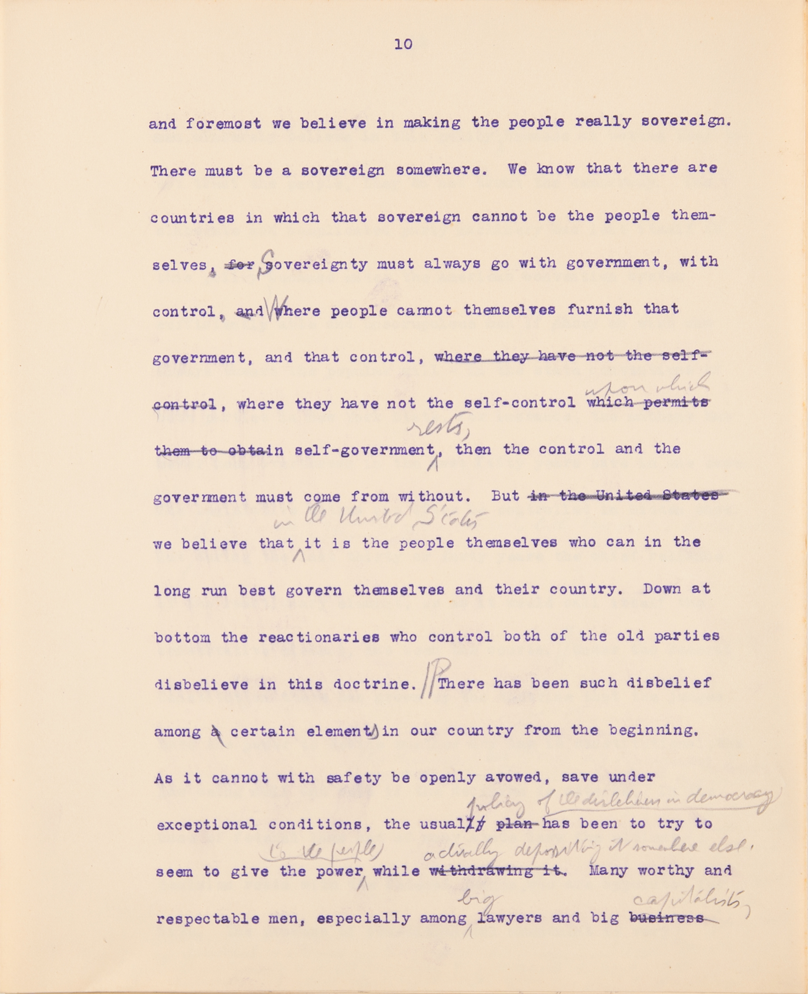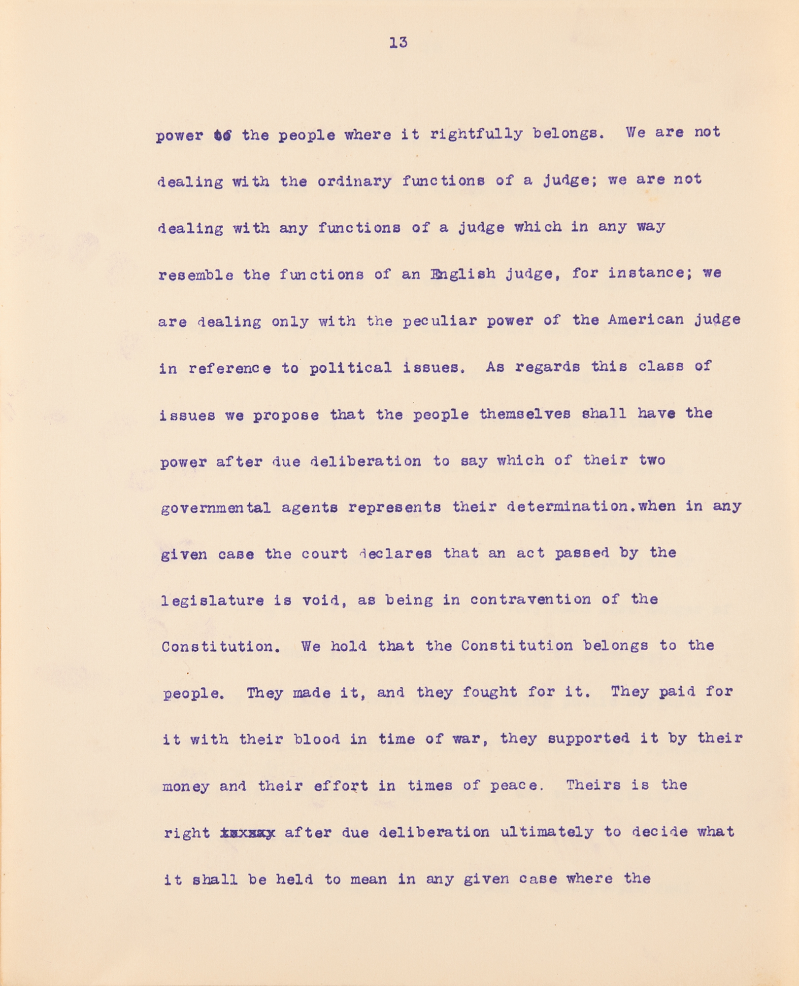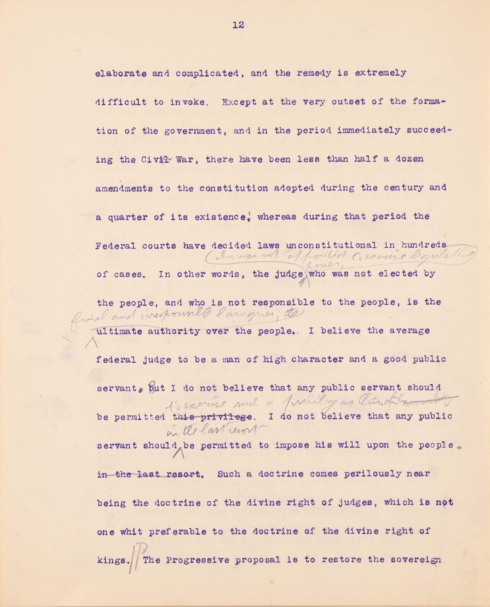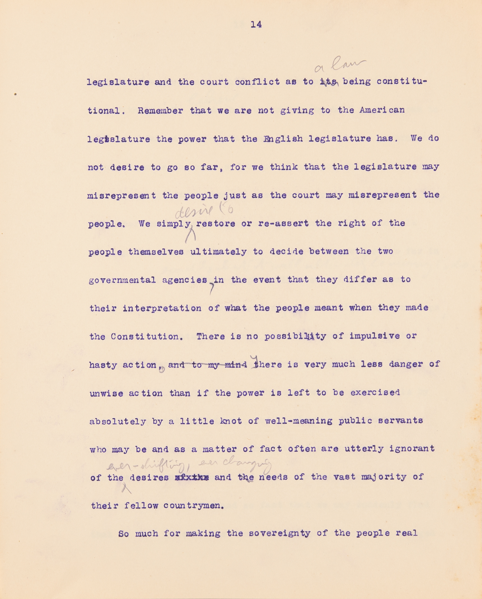 These principles in their essence are simple. First and foremost we believe in making the people really sovereign…Sovereignty must always go with government, with control. Where people cannot themselves furnish that government, and that control, where they have not the self-control upon which self-government rests, then the control and the government must come from without. But we believe that in the United States it is the people themselves who can in the long run best govern themselves and their country…The Progressive proposal is to restore the sovereign power to the people where it rightfully belongs…We hold that the Constitution belongs to the people. They made it, and they fought for it. They paid for it with their blood in time of war, they supported it by their money and their effort in times of peace. Theirs is the right after due deliberation ultimately to decide what it shall be held to mean in any given case where the legislature and the court conflict as to a law being constitutional…We simply desire to restore or re-assert the right of the people themselves ultimately to decide between the two governmental agencies, in the event that they differ as to their interpretation of what the people meant when they made the Constitution…