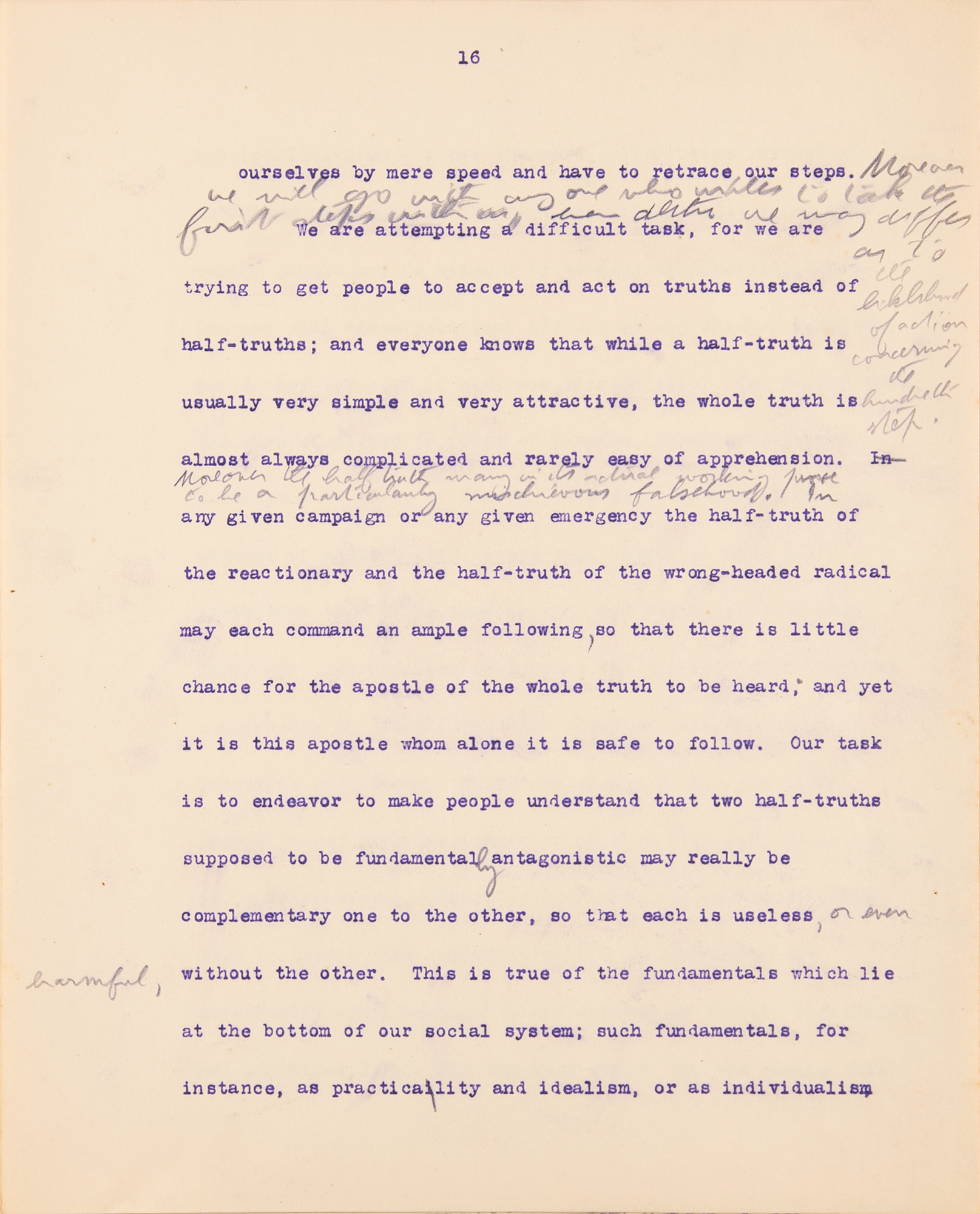 We are attempting a difficult task, for we are trying to get people to accept and act on truths instead of half-truths; and everyone knows that while a half-truth is usually very simple and very attractive, the whole truth is almost always complicated and rarely easy of apprehension…One man will advocate practical efficiency and another idealism, as if the two were in some way incompatible. Yet surely from the days of Alfred to those of Hampden, from the days of Washington to those of Lincoln, the great movements for the advance of mankind have always been useful in much the proportion that those leading them and taking part in them combined a high idealism of purpose and spirit with a resolute common sense in translating that idealism into the terms of practical efficiency…