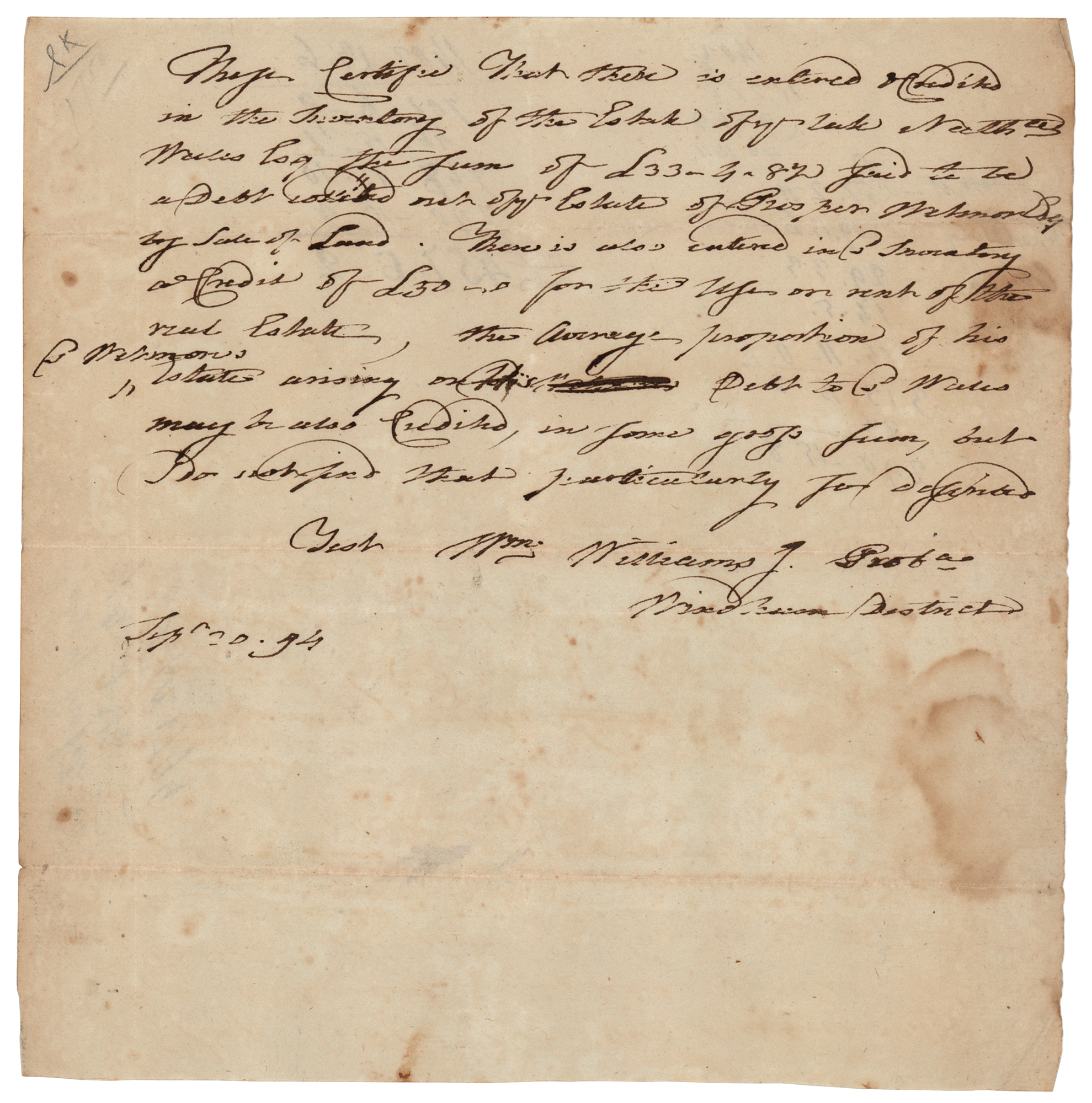 Signer of the Declaration of Independence from Connecticut (1731–1811). ADS, one page, 7.75 x 8, September 30, 1794. Handwritten document by William Williams as probate judge for the district of Windham, certifying funds pertaining to an estate. In fine condition, with scattered light staining.