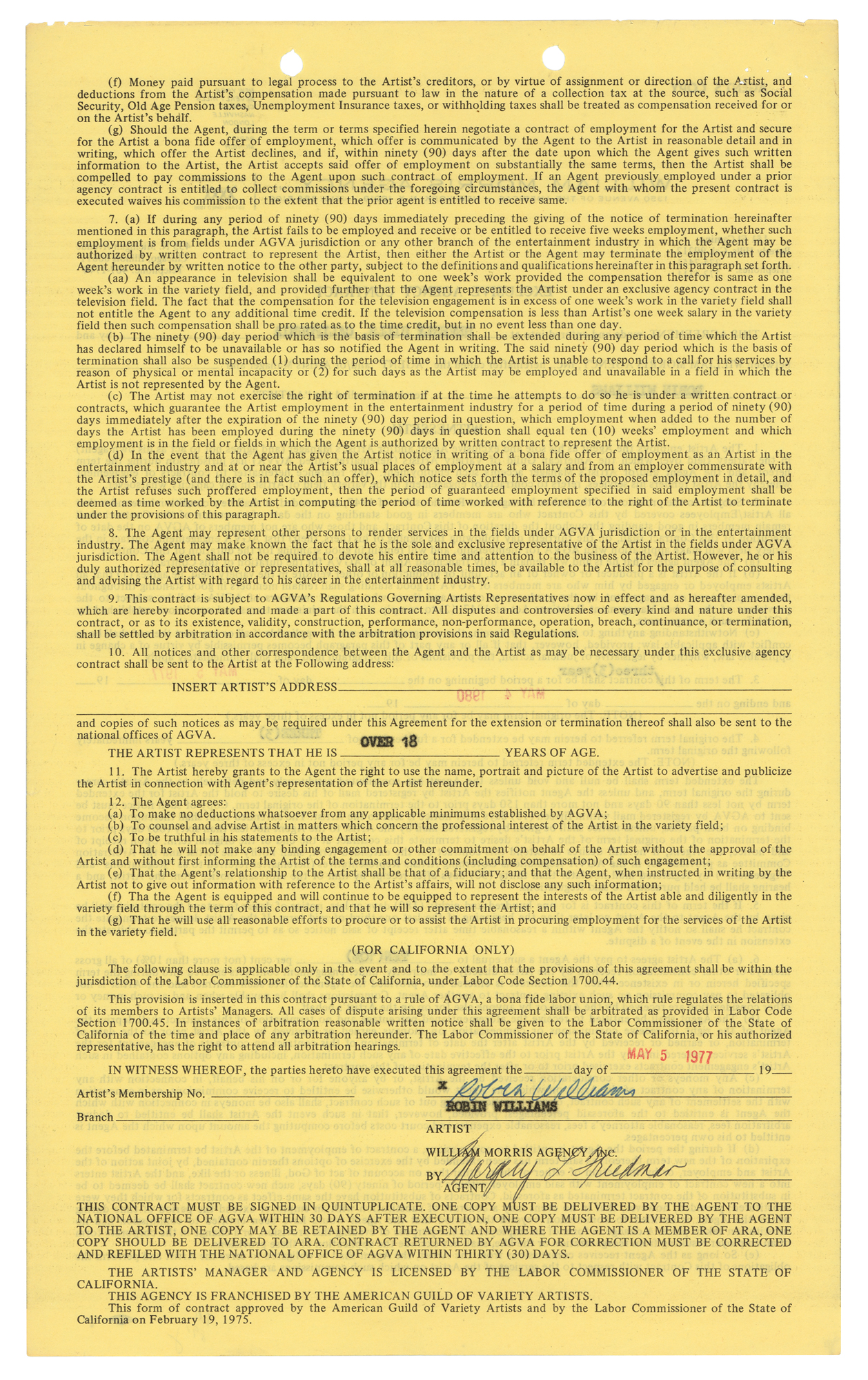 DS, one page both sides, 8.5 x 14, May 5, 1977. William Morris Agency contract by which Robin Williams agrees to employ the agency for a period of three years, to serve as his "sole and exclusive Agent and/or Artist's Manager…in the variety field over which the American Guild of Variety Artists (hereinafter called AGVA) has jurisdiction." Signed at the conclusion in blue ballpoint by Robin Williams, and countersigned by a William Morris agent. In fine condition.