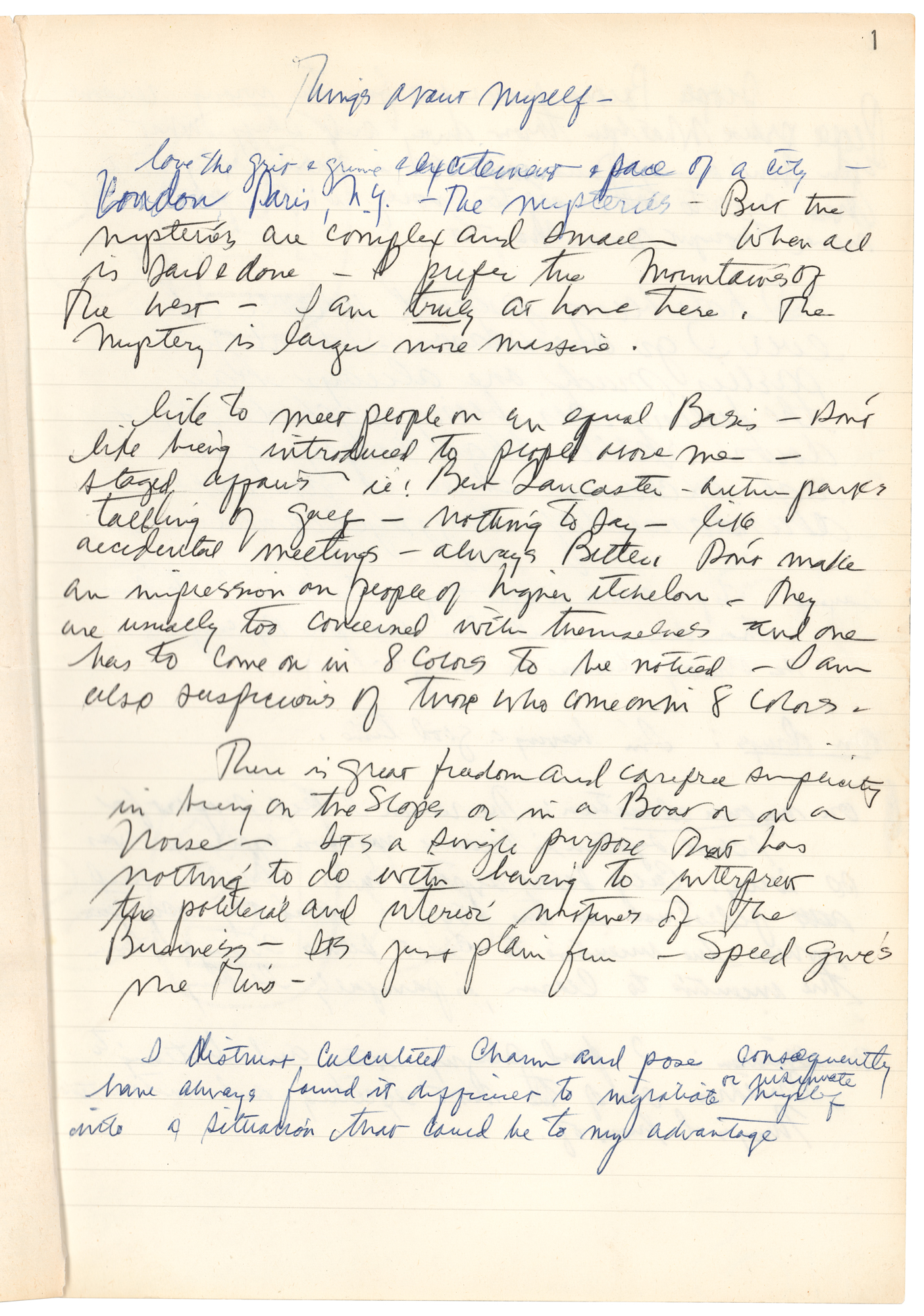 “Love the grit & grime & excitement & pace of a city — London, Paris, N.Y., — The mysteries — But the mysteries are complex and small — When all is said & done — I prefer the mountains of the West — I am truly at home there. The mystery is larger, more massive…