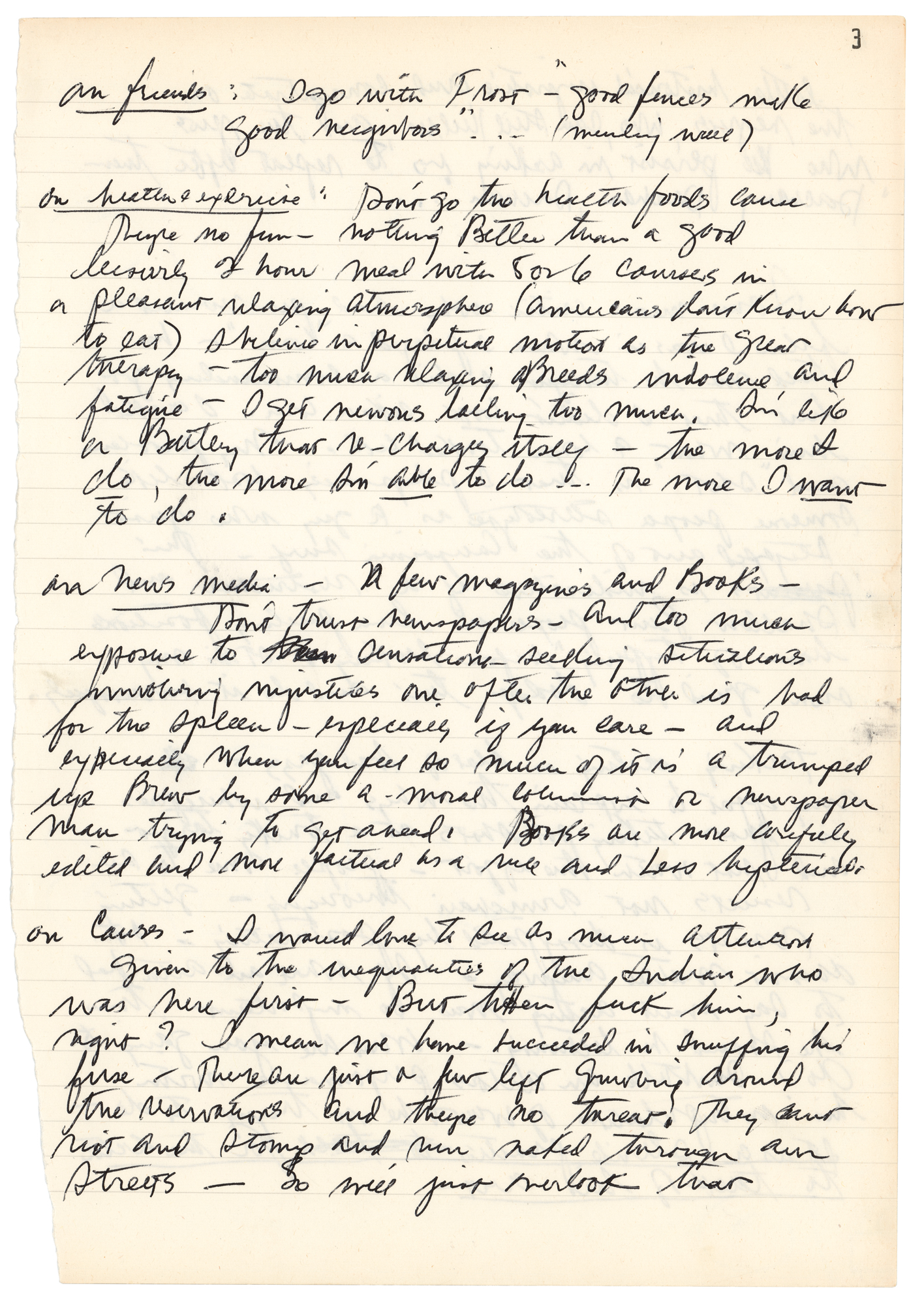 Health and exercise: “Don’t go the health foods cause they’re no fun — nothing better than a good leisurely 2 hour meal with 5 or 6 courses in a pleasant relaxing atmosphere (Americans don’t know how to eat) I believe in perpetual motion as the great therapy — too much relaxing breeds indolence and fatigue — I get nervous lacking too much. I’m like a battery that re-charges itself — the more I do, the more I’m able to do…the more I want to do.”