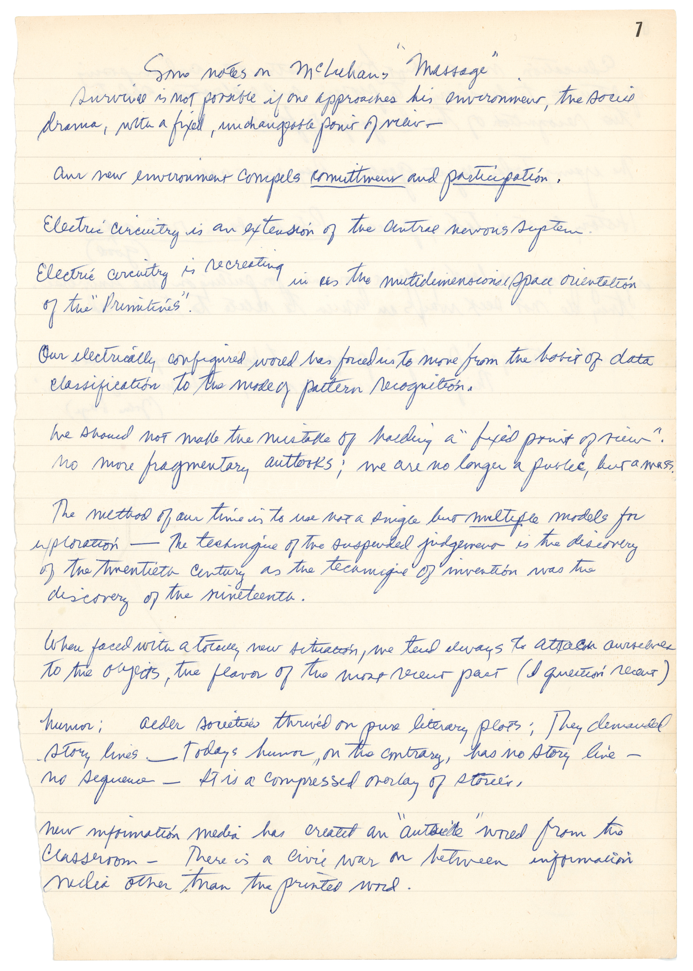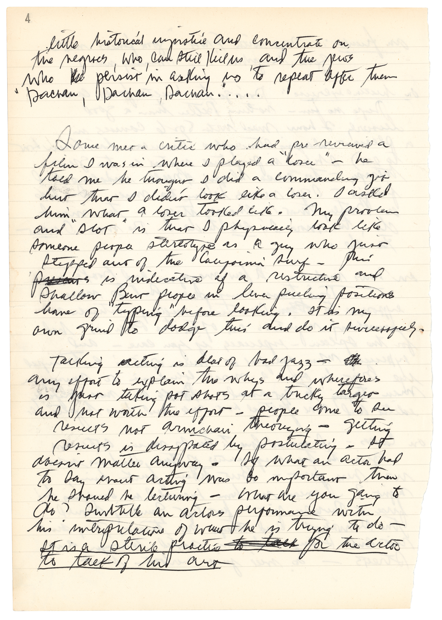 Redford follows this with sections related to ‘actor talk’ (“It is a sterile practice for the actor to talk of his art”) and the need to avoid being typecast: “My problem and ‘slot’ is that I physically look like someone people stereotype as a guy who just stepped out of the California surf…It is my own grind to dodge this and do it successfully.” The final two pages consist of “Some notes on McLuhan’s ‘Message,’” which Redford has penned neatly and concisely. In fine condition, with trivial paper loss to left edges (the result of being removed from its original notebook).