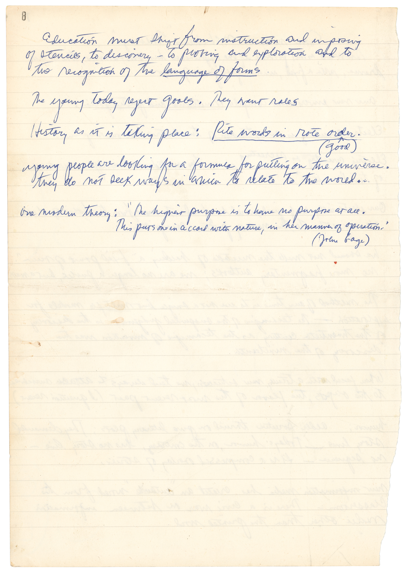 “People become successful for the wrong reasons. People praise what you throw away…Thus one reason why it is wise never to take oneself too seriously— i.e. Barefoot — I never thought much about it.” The next paragraph is in an unknown hand.