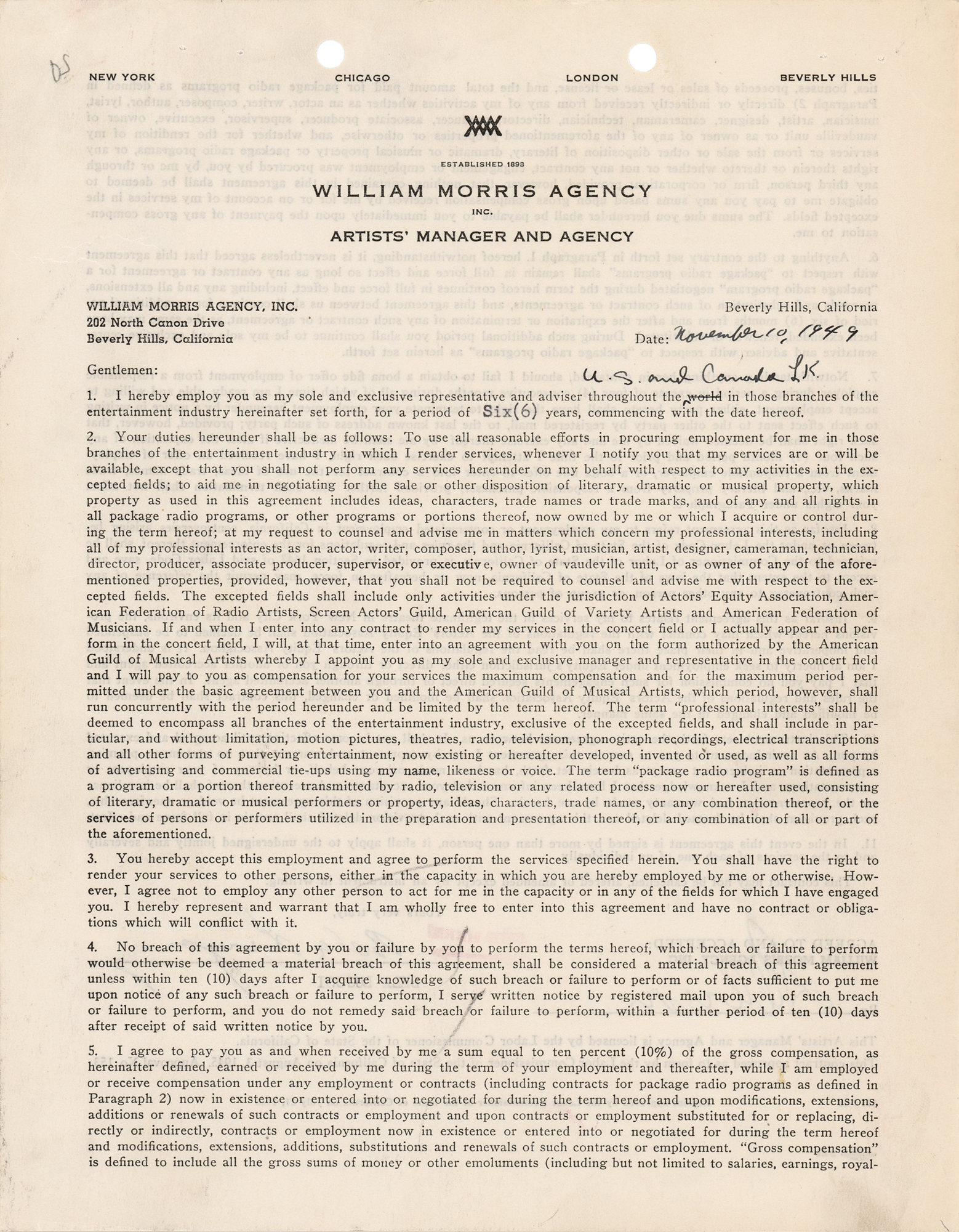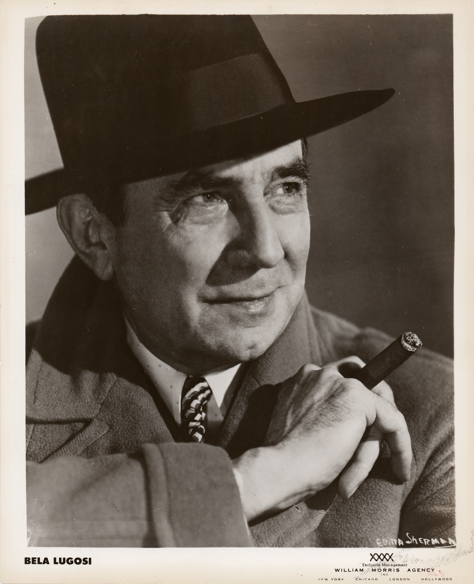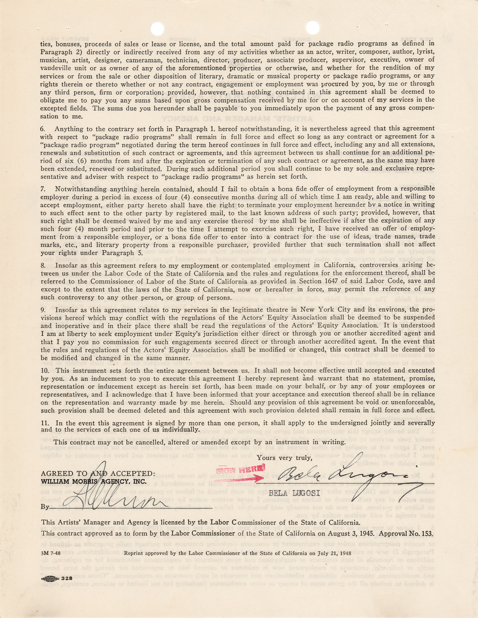 DS, one page both sides, 8.5 x 11, November 10, 1949. William Morris Agency contract by which Bela Lugosi agrees to employ the agency for a period of six years, to serve as his "sole and exclusive representative and adviser throughout the U.S. and Canada in those branches of the entertainment industry hereinafter set forth." Neatly signed at the conclusion in fountain pen by Bela Lugosi, and countersigned by a William Morris agent. In fine condition. Accompanied by an unsigned glossy 8 x 10 William Morris Agency publicity photo of Lugosi from the period.