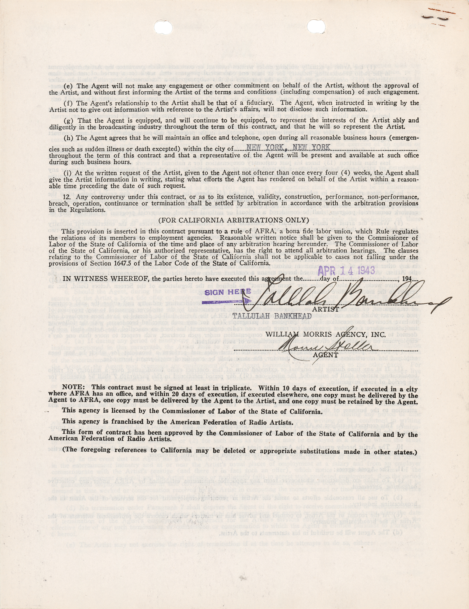DS, two pages both sides, 8.5 x 11, April 14, 1943. American Federation of Radio Artists "Standard AFRA Exclusive Agency Contract" by which Bankhead employs the William Morris Agency for a period of one year at the usual rate of 10%. Boldly signed at the conclusion in fountain pen by Tallulah Bankhead. In fine condition.