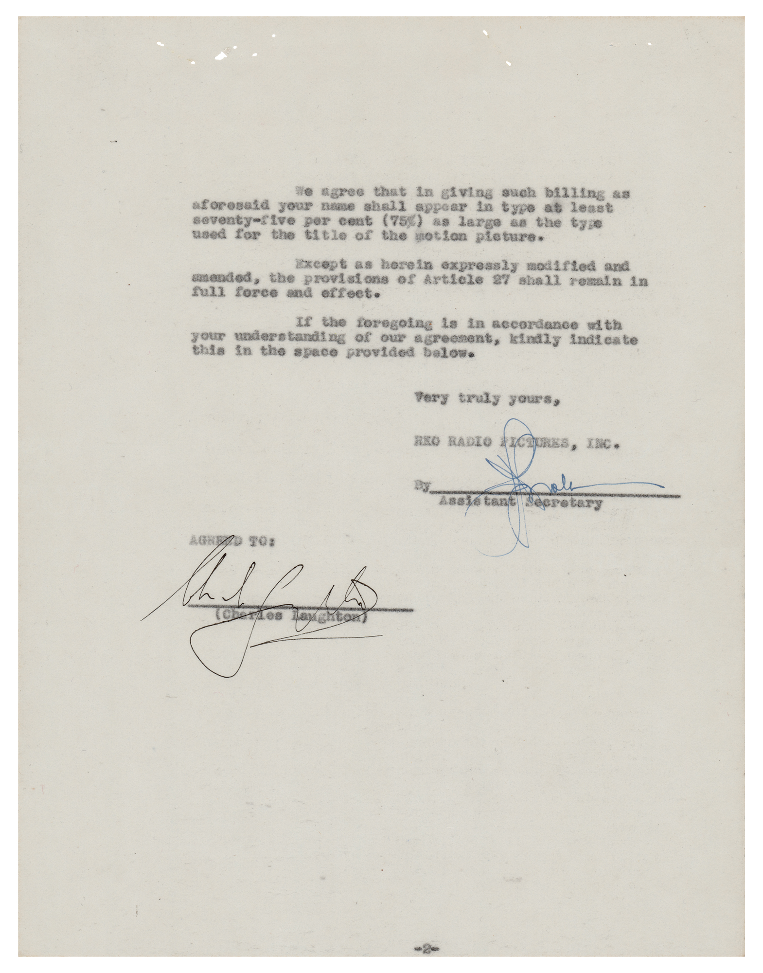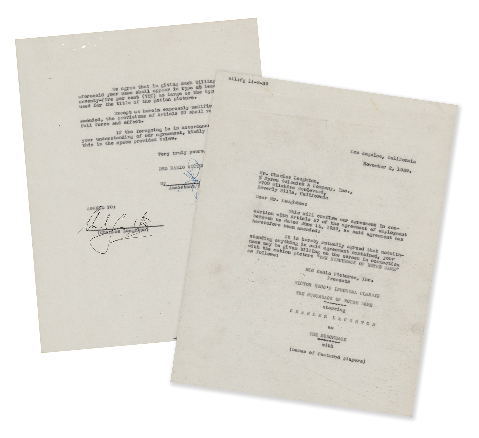 DS, one page, 8.5 x 11, November 2, 1939. Document confirming an agreement between Laughton and RKO Radio Pictures, finalizing Laughton's "billing on the screen in connection with the motion picture 'The Hunchback of Notre Dame," which starred Laughton as the titular "Hunchback." In fine condition.