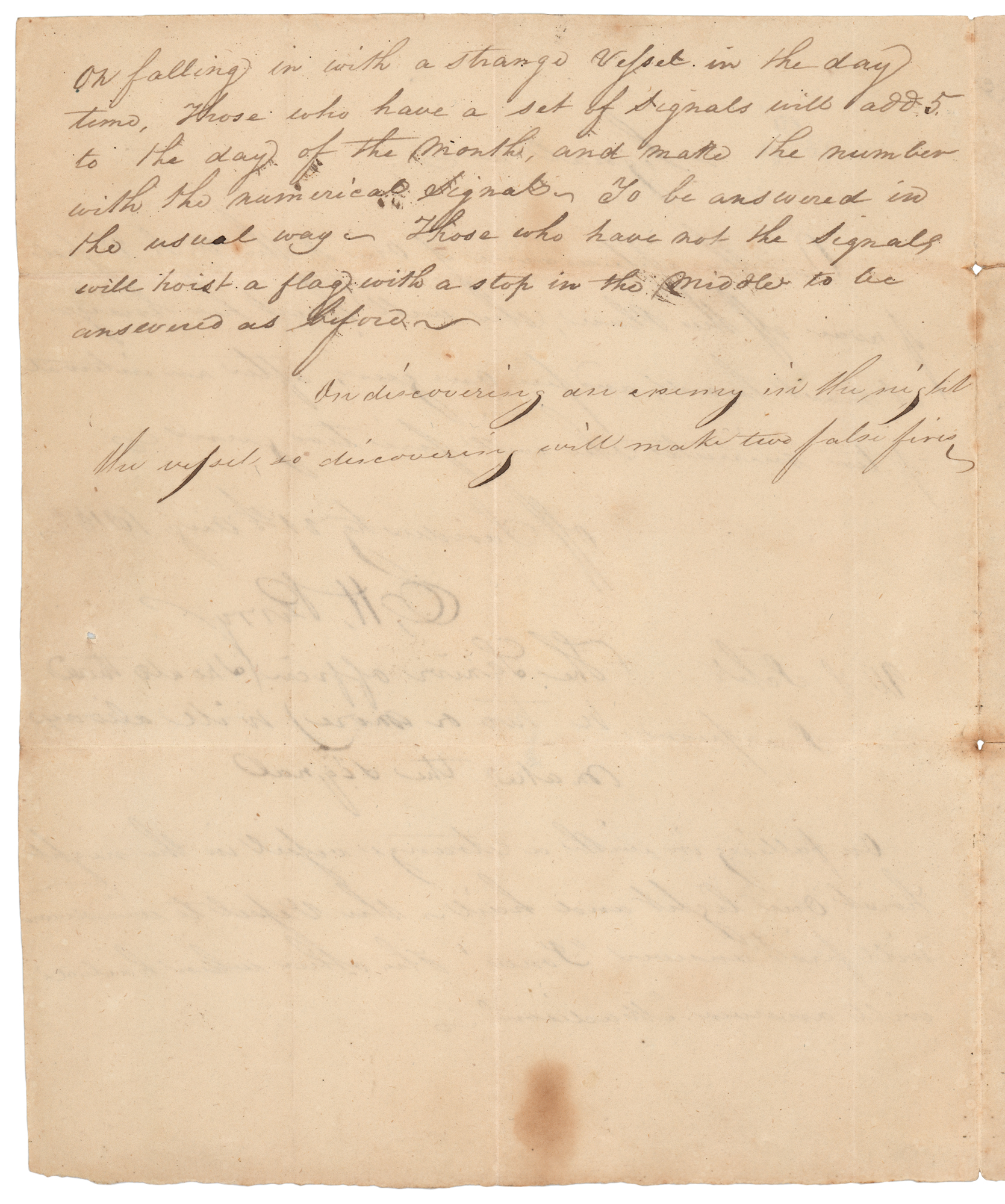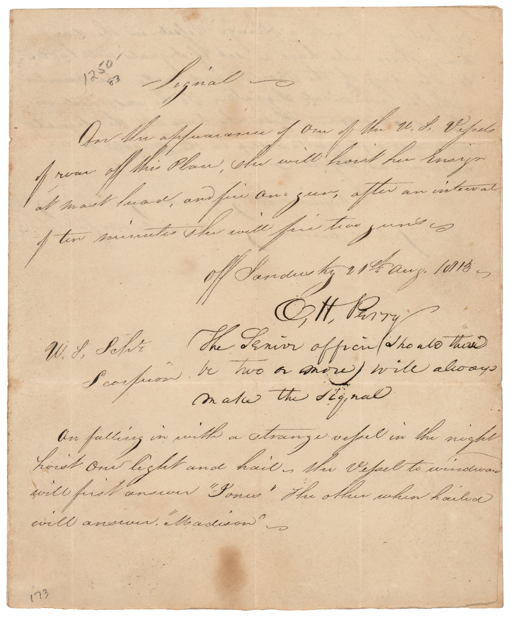 American military officer (1785–1819) who served in the War of 1812 and earned the title ‘Hero of Lake Erie’ for leading American forces in a decisive naval victory at the Battle of Lake Erie. War-dated manuscript DS signed “O. H. Perry,” one page, 6.25 x 7.5, August 21, 1813. Manuscript orders to the U.S. Schooner Scorpion, issued "off Sandusky," in full: "Signal—on the appearance of one of the U.S. Vessels of war off this Place, she will hoist her ensign at mast head, and fire one gun, after an interval of ten minutes she will fire two guns." Perry signs below, adding three lines in his own hand: "The Senior officer (should there be two or more) will always make the signal." Below (and continuing onto the reverse), in another hand, are instructions for other encounters: "On falling in with a strange vessel in the night hoist one light and hail—the vessel to windward will first answer 'Jones.' The other when hailed will answer 'Madison.' On falling in with a strange vessel in the day time, those who have a set of signals will add 5 to the day of the month, and make the number with the numerical Signal—To be answered in the usual way. Those who have not the signals will hoist a flag with a stop in the middle to be answered as before. On discovering an enemy in the night the vessel so discovering will make two false fires." In fine condition, with light soiling and a few small stains. The Battle of Lake Erie would take place just twenty days later on September 10, 1813.