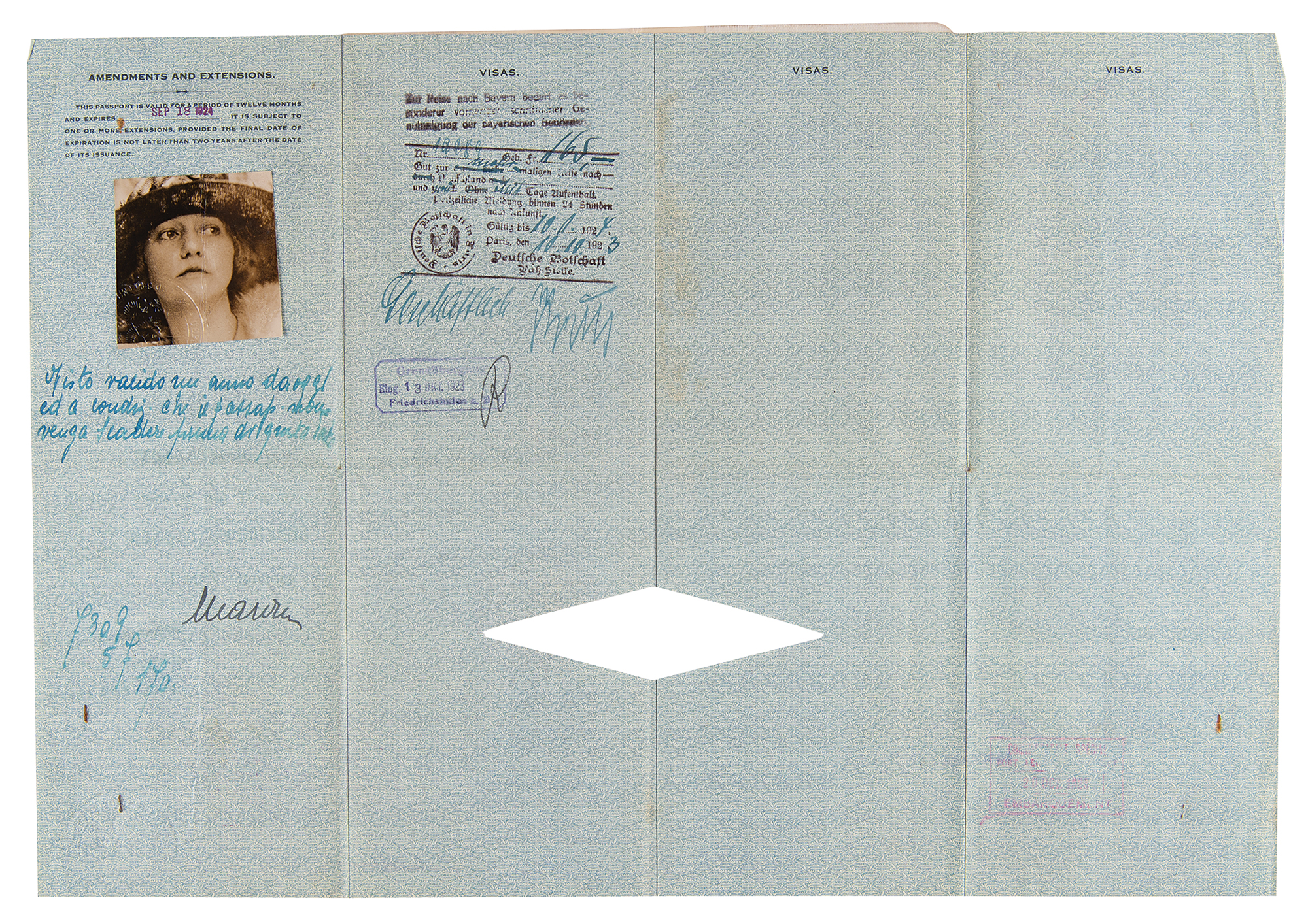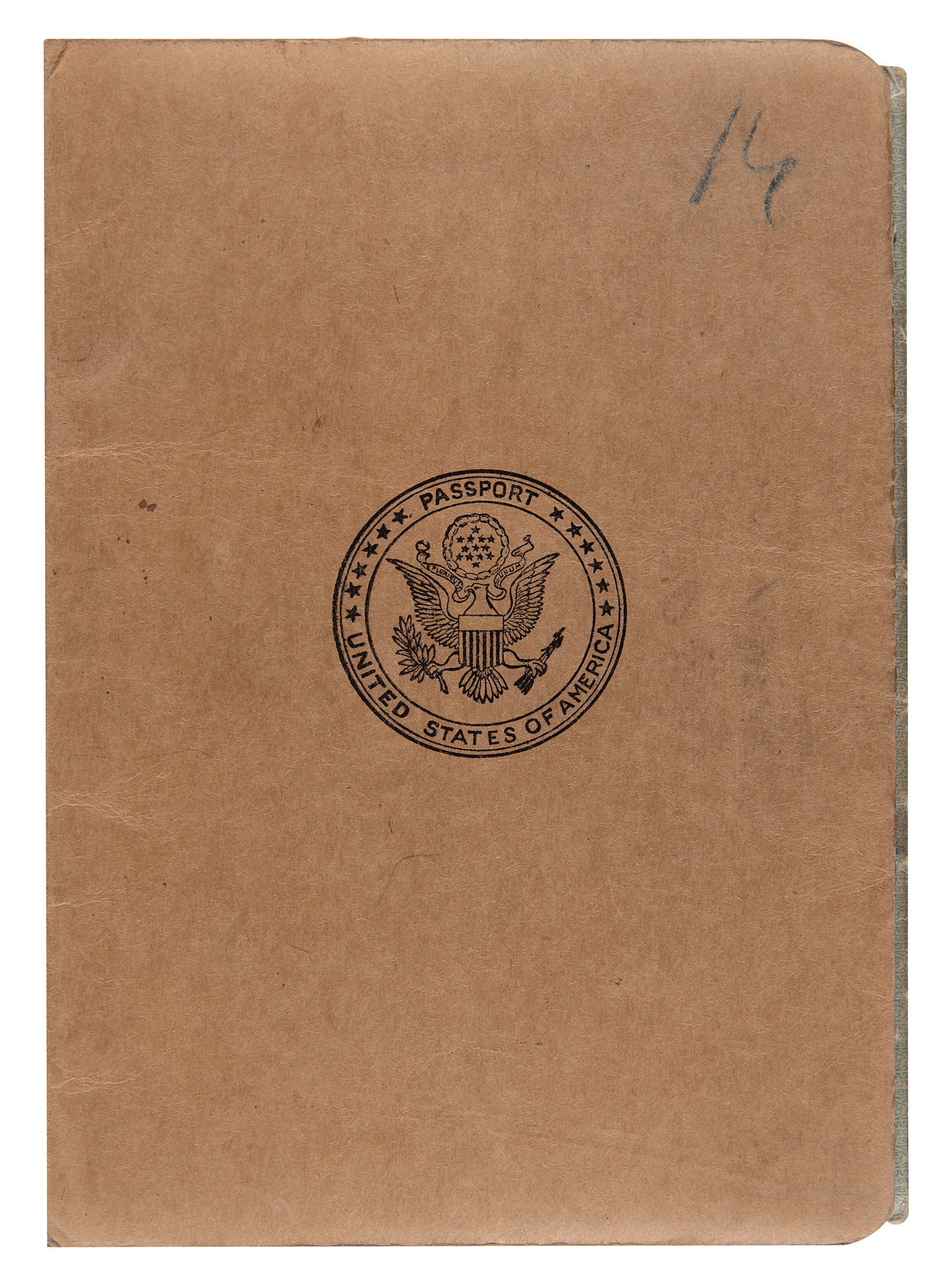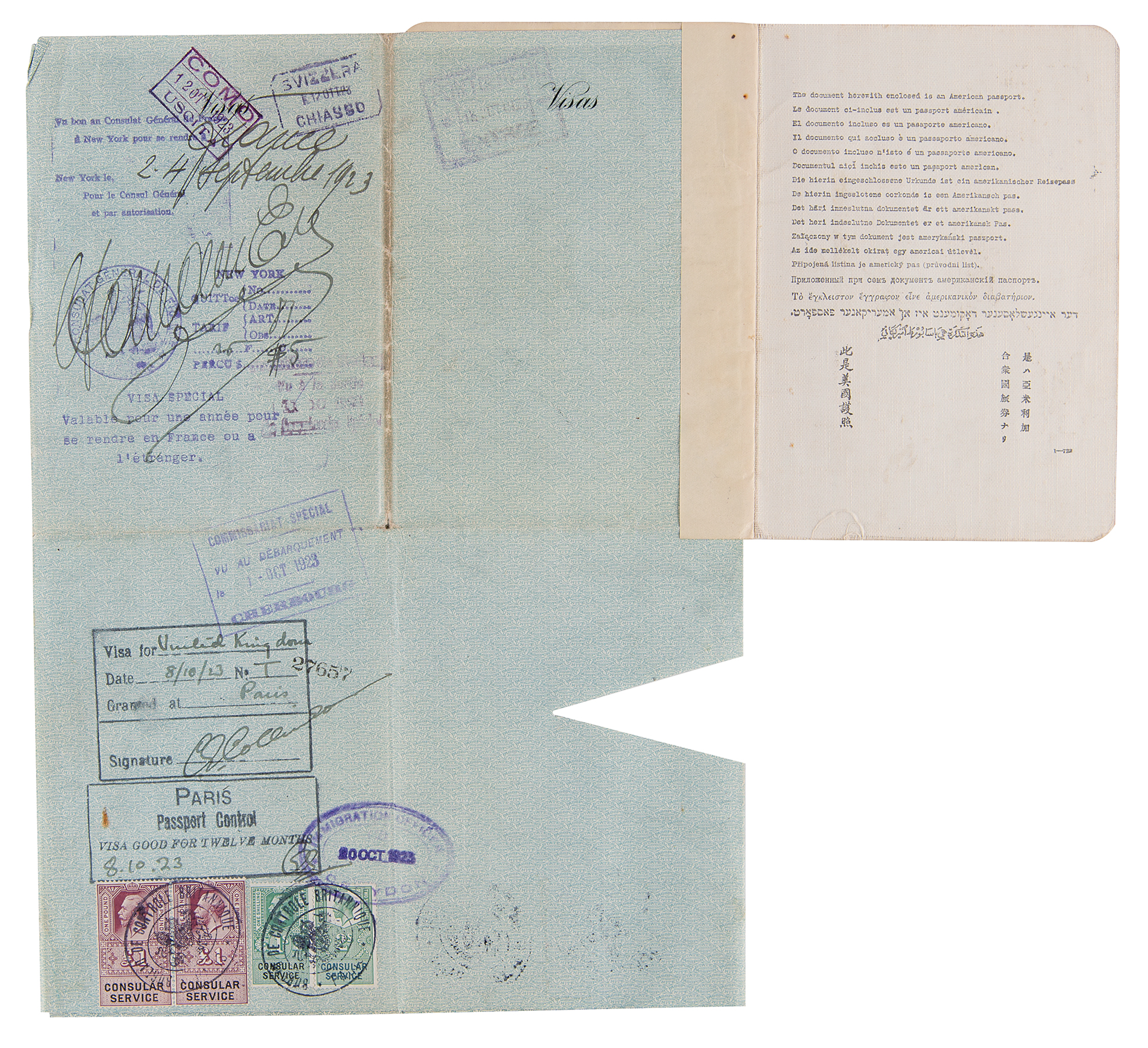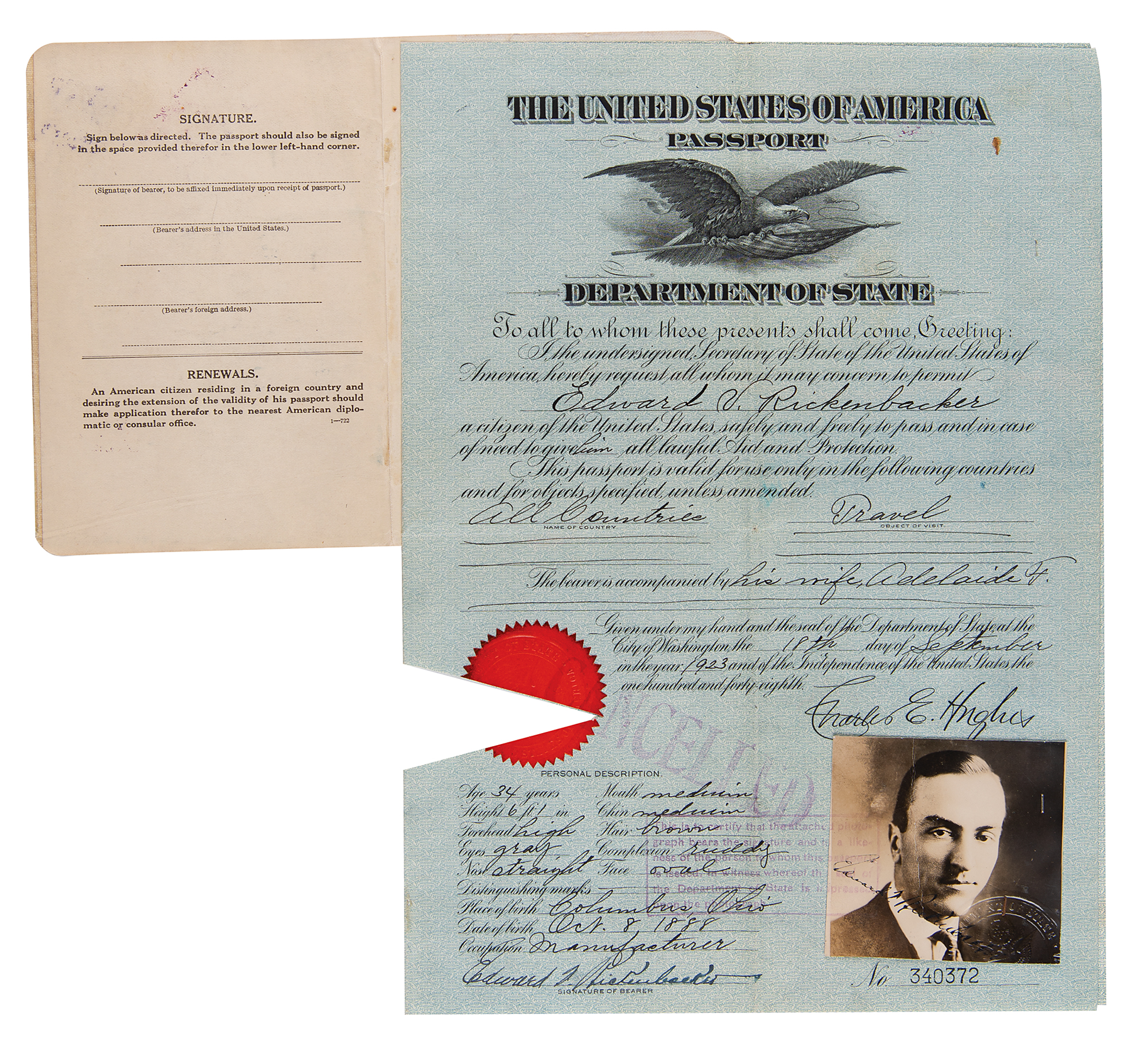 Desirable passport of the United States of America granted to "Edward V. Rickenbacker," two pages, 8.75 x 12.25, issued on September 13, 1923. The passport allows Rickenbacker to visit "All Countries" for "Travel," and notes that "his wife, Adelaide" is accompanying him. Rickenbacker's glossy passport photograph is stapled to the lower right, signed in fountain pen, "Edward V. Rickenbacker"; his personal details are filled out in the lower right. Also bears the facsimile signature of Secretary of State Charles Evans Hughes. A similar passport photo of his wife, Adelaide, is affixed to the reverse. The passport bears visa stamps from Germany, France, and the United Kingdom. Folded and held within its original cardstock folder, imprinted on the front cover with a "Passport / United States of America" seal. In very good to fine condition, with vertical creases to both photos, expected wear from use, and a cancelation cut to the left edge.