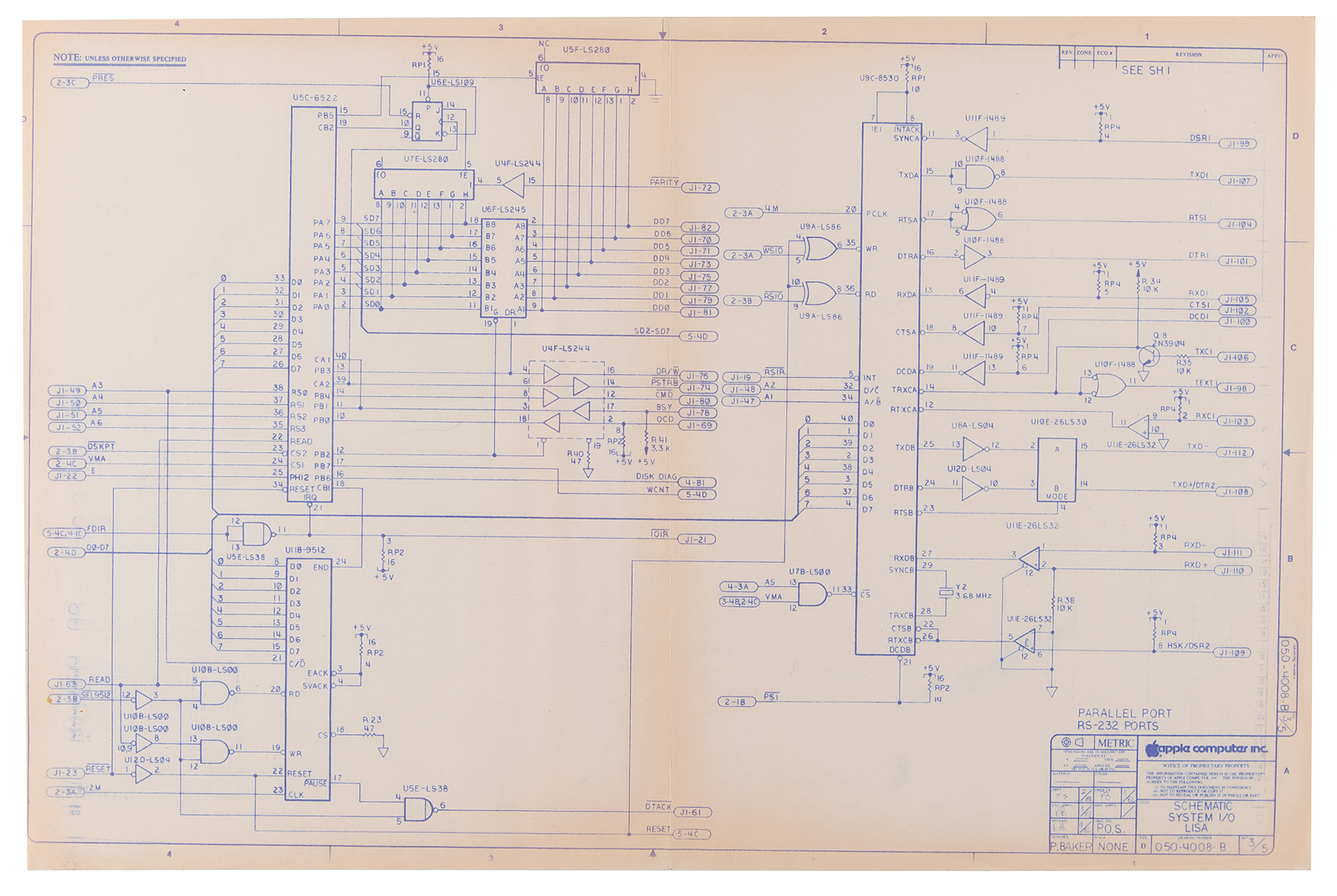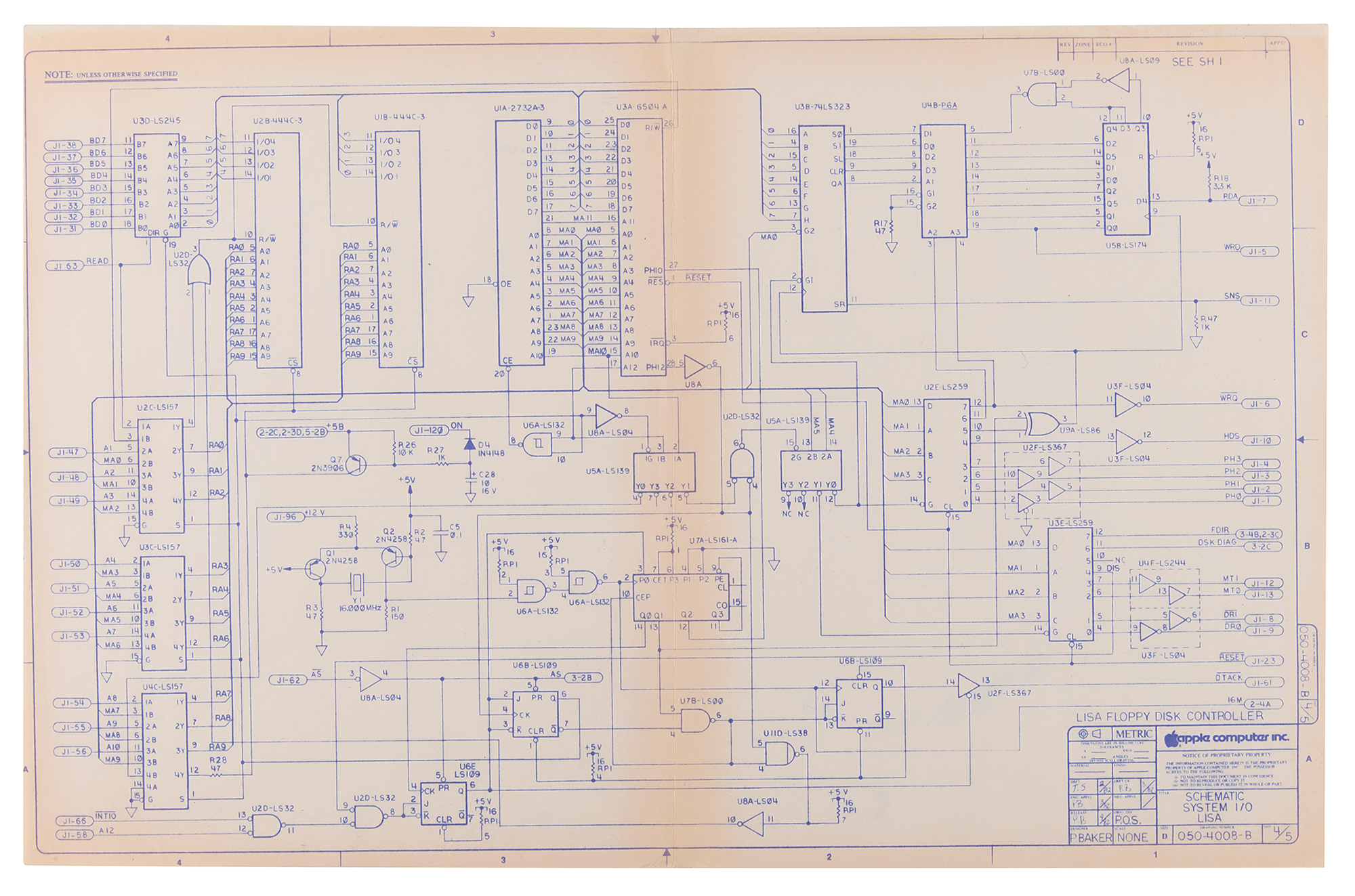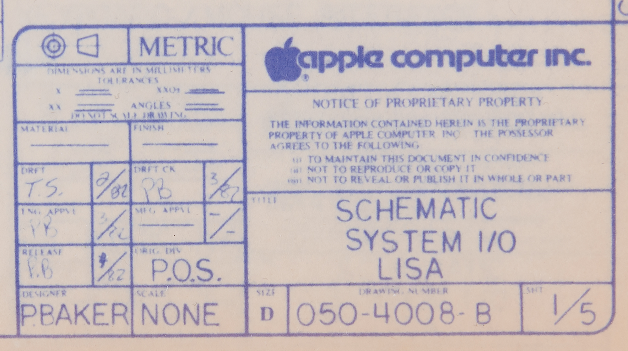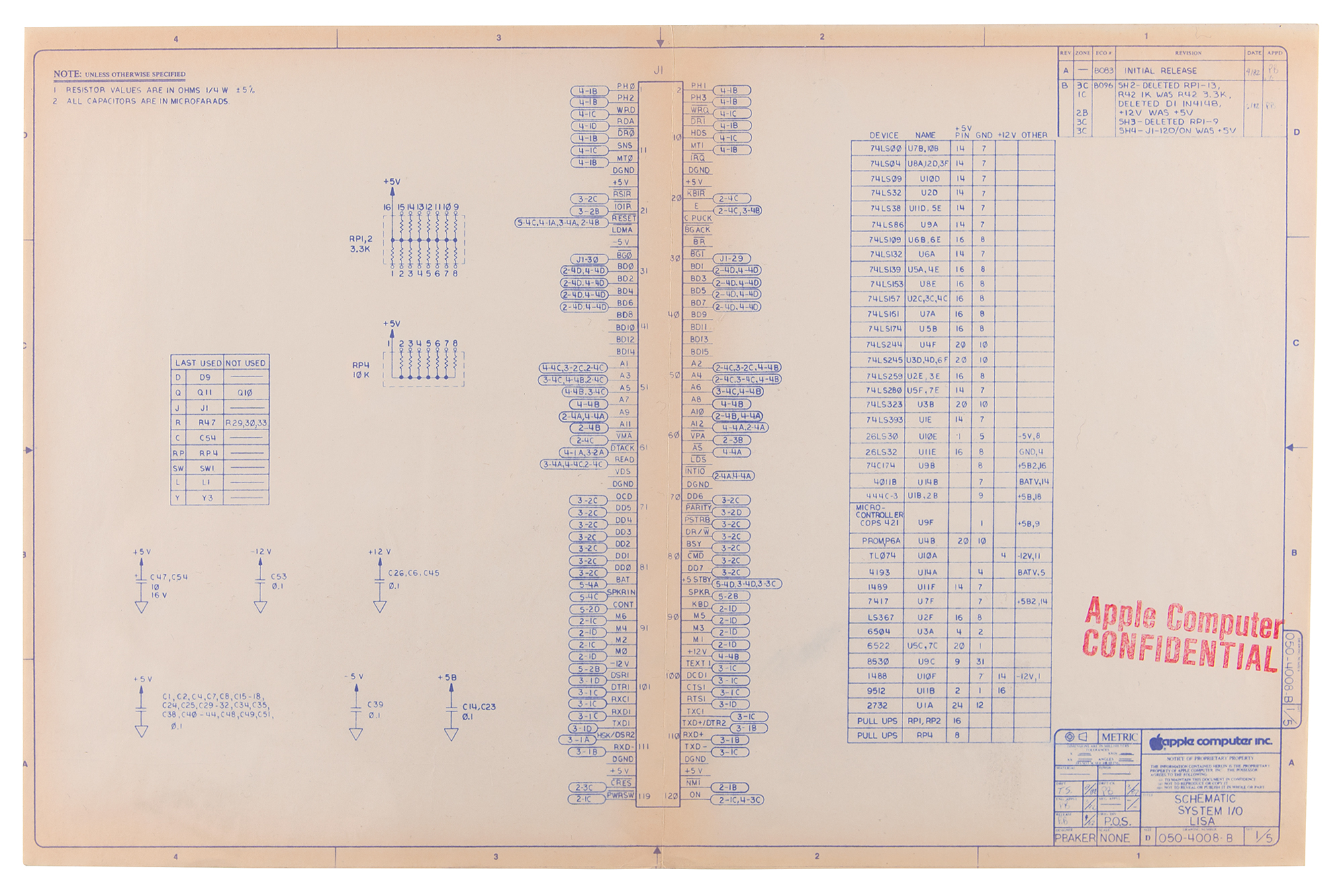 The schematics, all 17 x 11, each feature an Apple Computer, Inc. legend to the lower right, which lists the division as “P.O.S.,” an April 1982 finish date, and the drawing number as “050-4008-B,” with sheets 2 through 5 identified as “I/O Decoders, Keyboard / Mouse Interface / To D Clock,” “Parallel Port, RS-232 Ports,” “Lisa Floppy Disk Controller,” and “Analog Circuits.” The first sheet, which is stamped “Apple Computer Confidential,” features an additional legend to the upper right, identifying the packet as Revision B from June 1982.