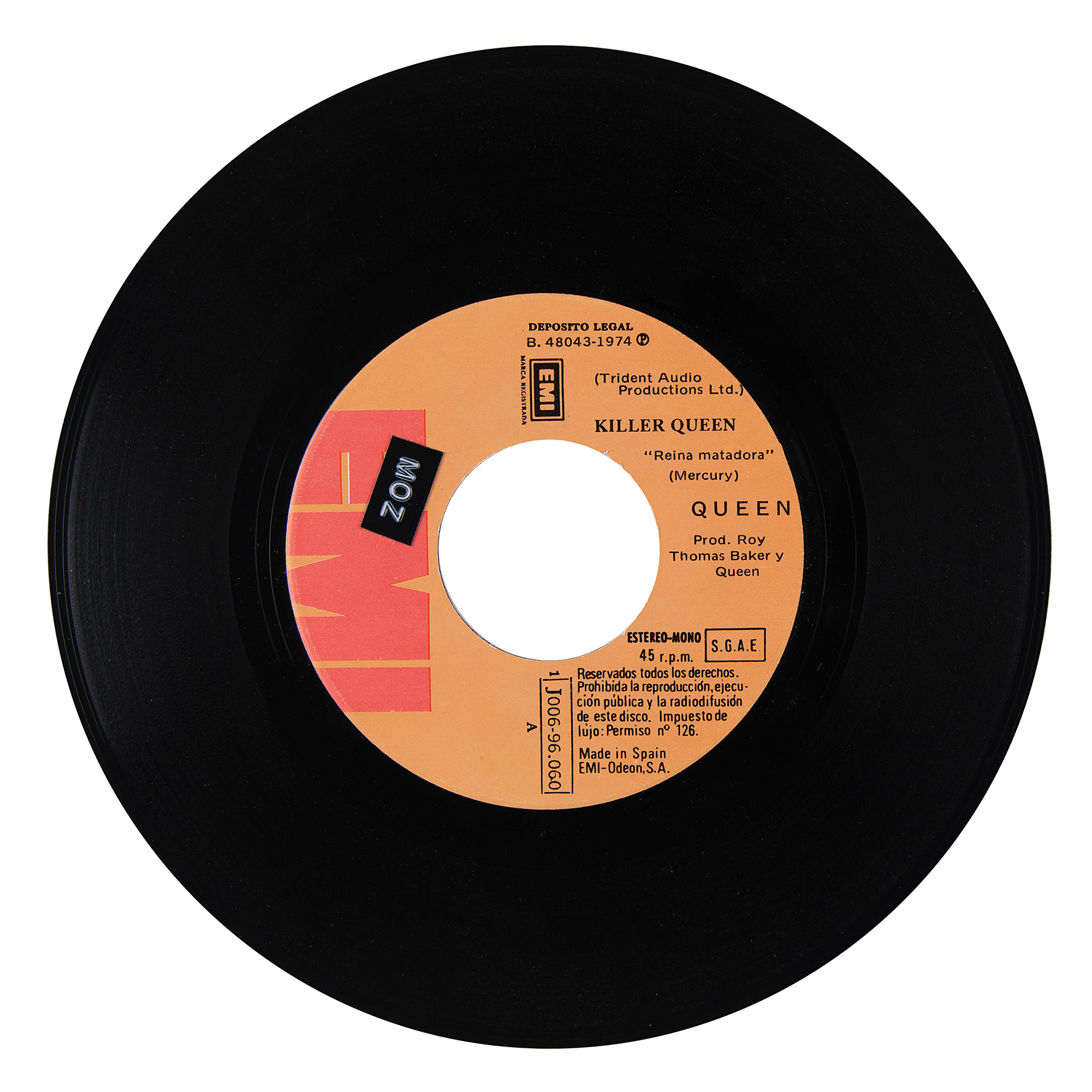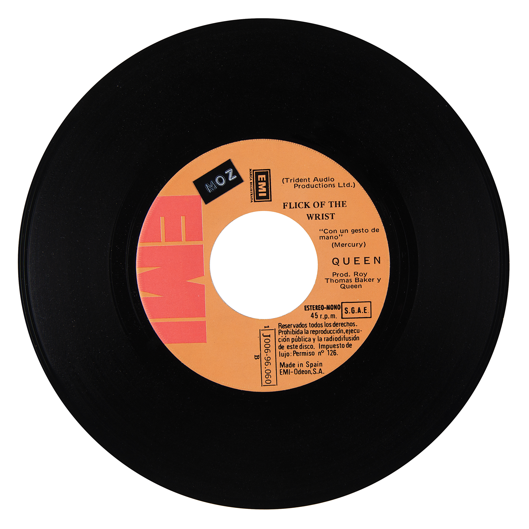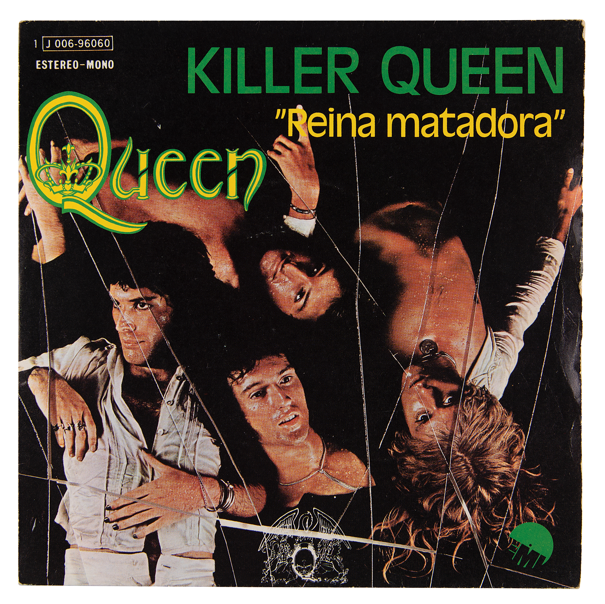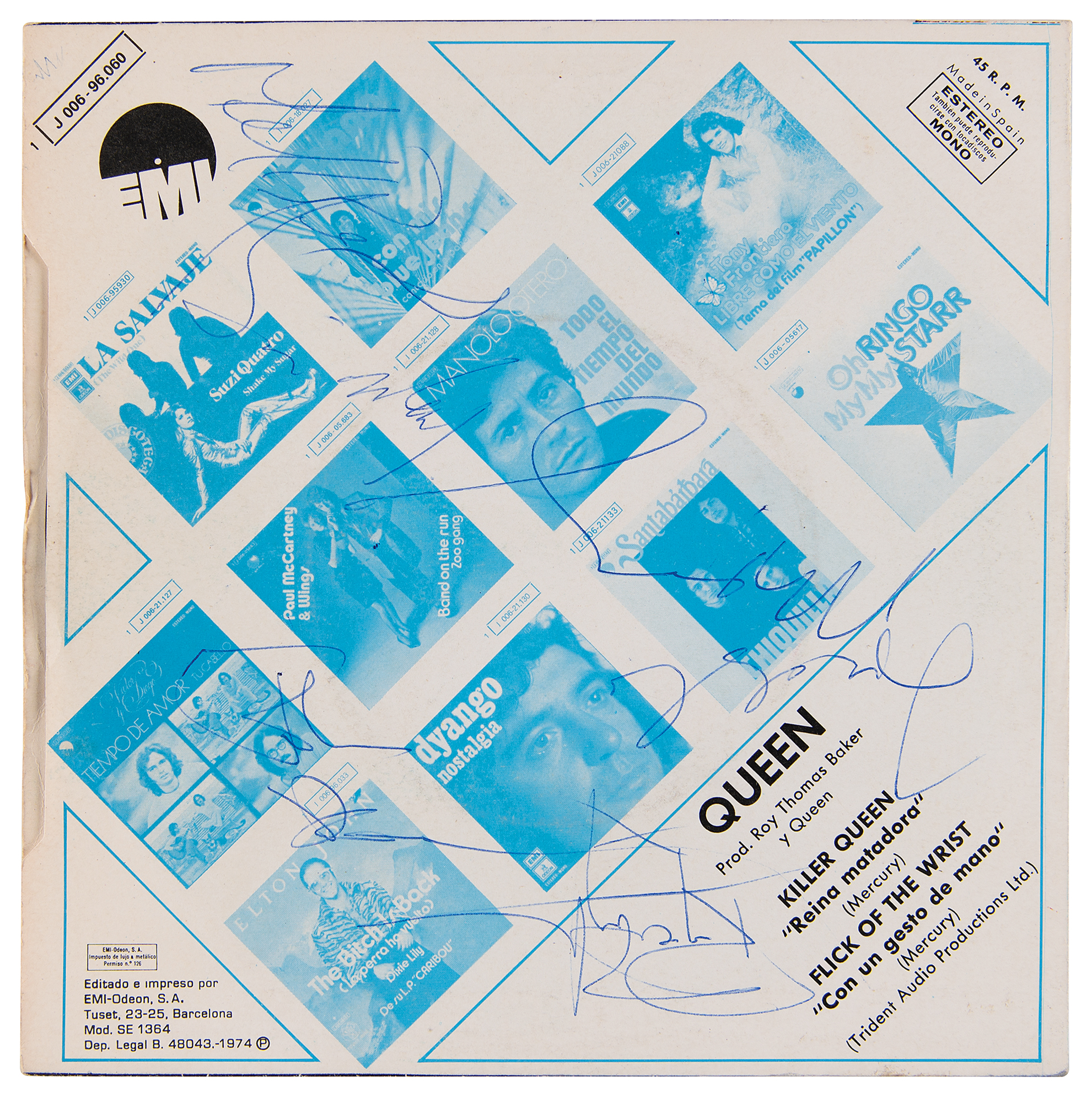 Scarce EMI (Spain) 45 RPM record for the Queen single ‘Killer Queen [Reina Matadora] / Flick Of The Wrist [Con Un Gesto De Mano],’ nicely signed on the back of the picture sleeve in blue ballpoint by Freddie Mercury, Brian May (ins), John Deacon, and Roger Taylor. In fine condition. The record is included.