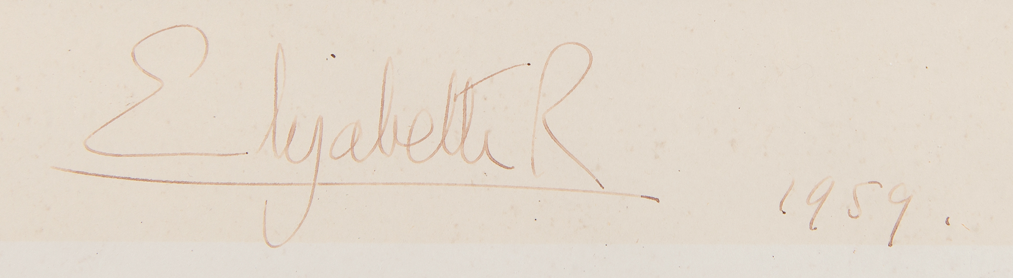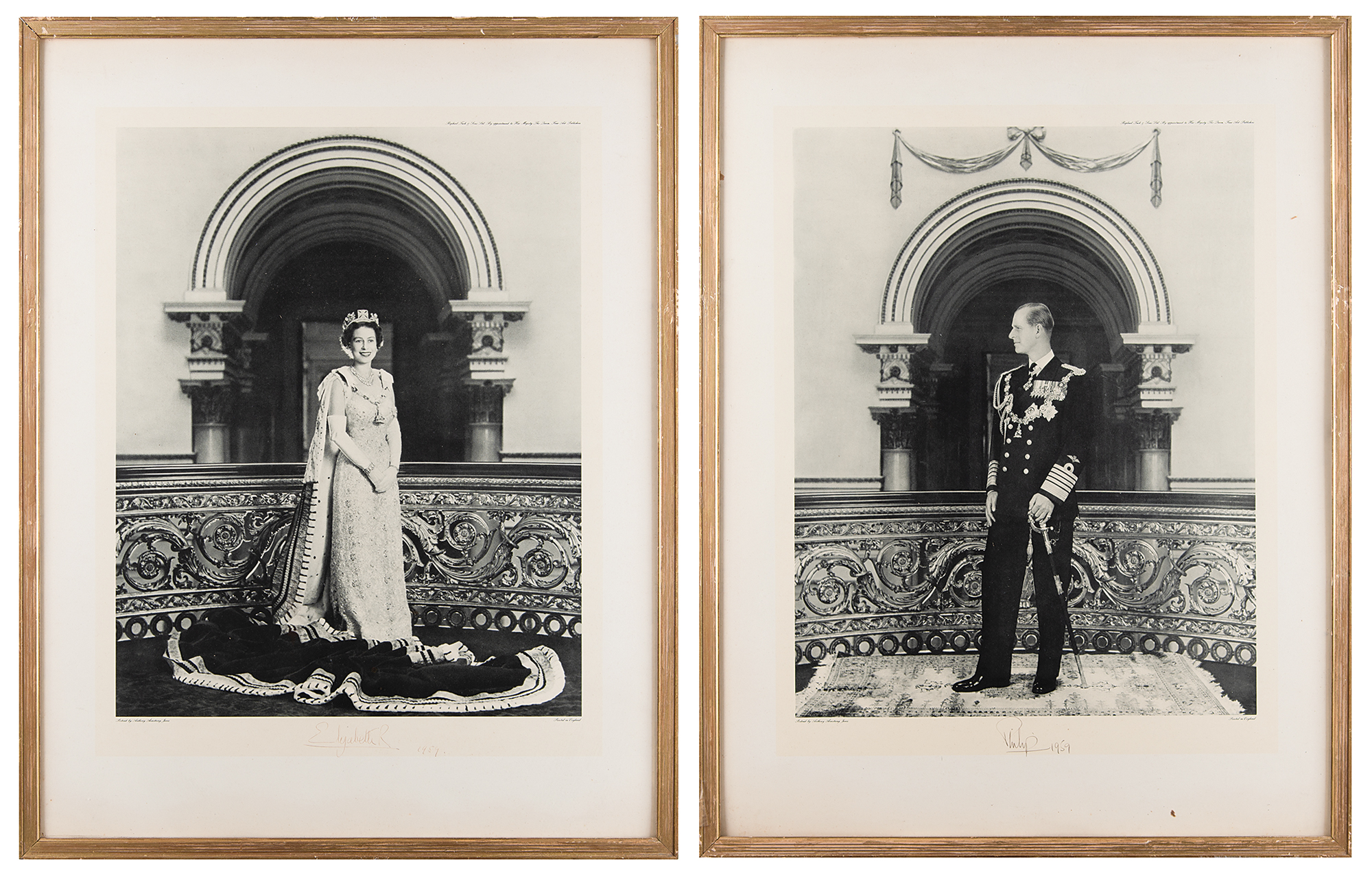 Magnificent pairing of oversized official photogravure portraits, both taken by Antony Armstrong-Jones and printed by Raphael Tuck & Sons of England: a marvelous vintage matte-finish 21 x 27.5 photogravure portrait of Queen Elizabeth II at full length, clad in the Crown Jewels, nicely signed in the lower border in fountain pen, "Elizabeth R, 1959"; and a superb vintage matte-finish 21 x 27.5 photogravure portrait of Prince Philip standing in his decorated uniform, nicely signed in the lower border in fountain pen, "Philip, 1959." Individually framed to 22.75 x 29. In fine condition, with Elizabeth's signature a few shades light, but completely legible. A particularly stunning pair of oversized royal presentation portraits, as the photographer—Antony Armstrong-Jones—would become Queen Elizabeth's brother-in-law one year later when he married Princess Margaret.
