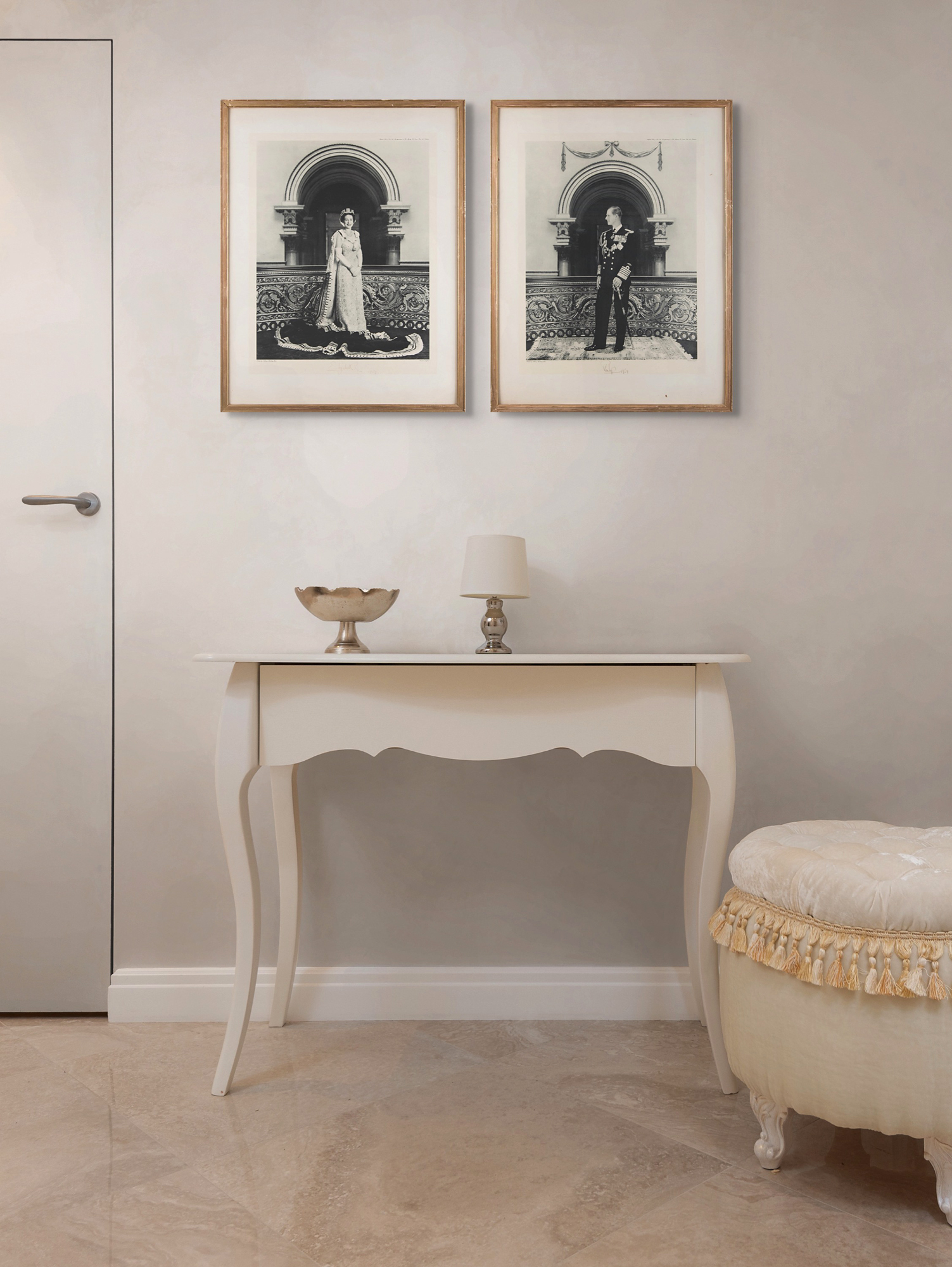 Magnificent pairing of oversized official photogravure portraits, both taken by Antony Armstrong-Jones and printed by Raphael Tuck & Sons of England: a marvelous vintage matte-finish 21 x 27.5 photogravure portrait of Queen Elizabeth II at full length, clad in the Crown Jewels, nicely signed in the lower border in fountain pen, "Elizabeth R, 1959"; and a superb vintage matte-finish 21 x 27.5 photogravure portrait of Prince Philip standing in his decorated uniform, nicely signed in the lower border in fountain pen, "Philip, 1959." Individually framed to 22.75 x 29. In fine condition, with Elizabeth's signature a few shades light, but completely legible. A particularly stunning pair of oversized royal presentation portraits, as the photographer—Antony Armstrong-Jones—would become Queen Elizabeth's brother-in-law one year later when he married Princess Margaret.