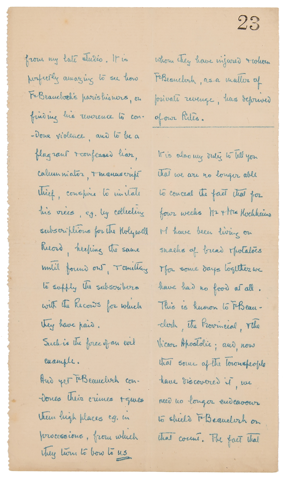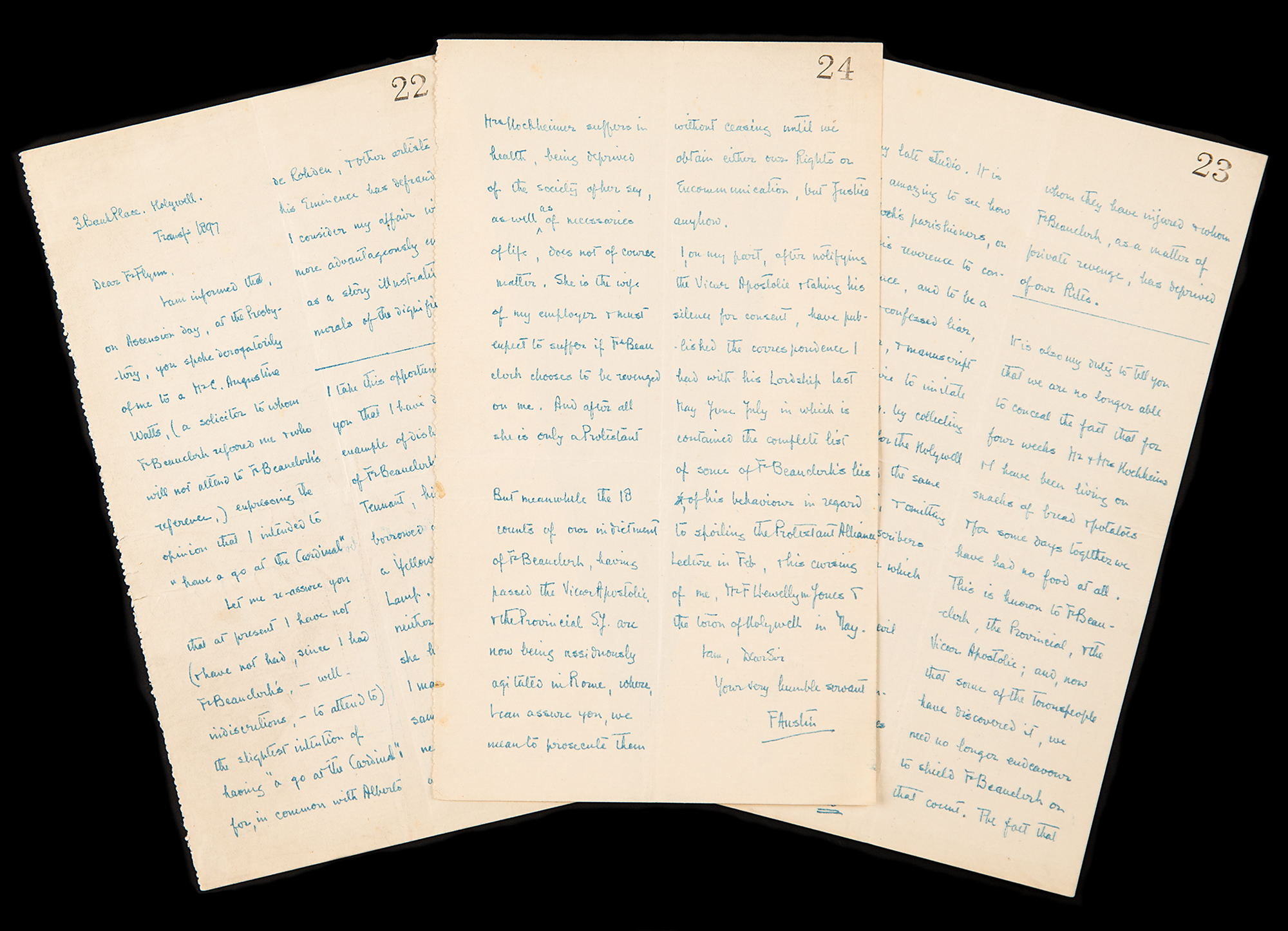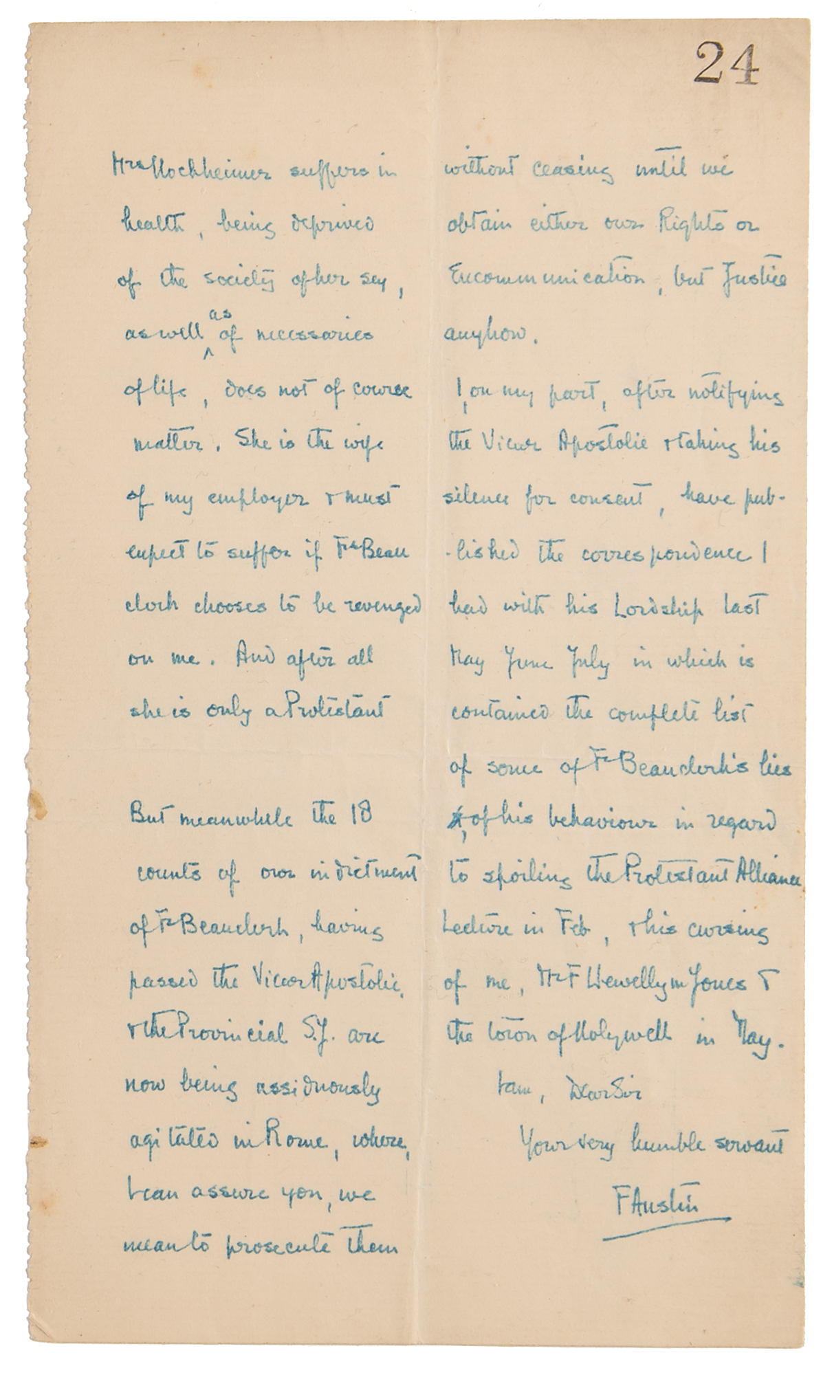 It is also my duty to tell you that we are no longer able to conceal the fact that for four weeks Mr. & Mrs. Hochheimer & I have been living on snacks of bread & potatoes & for some days together we have had no food at all. This is known to Fr. Beauclerk…and now that some of the townspeople have discovered it, we need no longer endeavour to shield Fr. Beauclerk…The fact that Mrs. Hochheimer suffers in health…as well as of necessaries of life does not of course matter…But meanwhile the 18 counts of our indictment of Fr. Beauclerk, having passed the Vicar Apostolic & the Provincial S. J. are now being assiduously agitated in Rome where, & I can assure you, we mean to prosecute them without ceasing until we obtain either our Rights or Excommunication, but justice anyhow.” In fine condition.