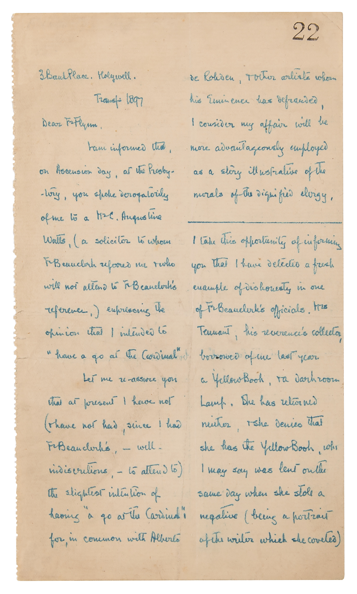 I take this opportunity of informing you that I have detected a fresh example of dishonesty in one of Fr. Beauclerk's officials. Mrs. Tennant, his reverence's collector, borrowed of me Last year a Yellow Book, & a dark room lamp. She has returned neither, & she denies that she has the Yellow Book, wh. I may say was lent on the same day when she stole a negative (being a portrait of the writer which she coveted) from my late studio. It is perfectly amazing to see how Fr. Beauclerk's parishioners, on finding his reverence to condone violence and to be a flagrant and confessed liar, calumniator, & manuscript thief, conspire to imitate his vices, e.g. by collecting subscriptions for the Holywell Record, keeping the same until found out, & omitting to supply the subscribers with the Records for which they have paid. Such is the force of an evil example.