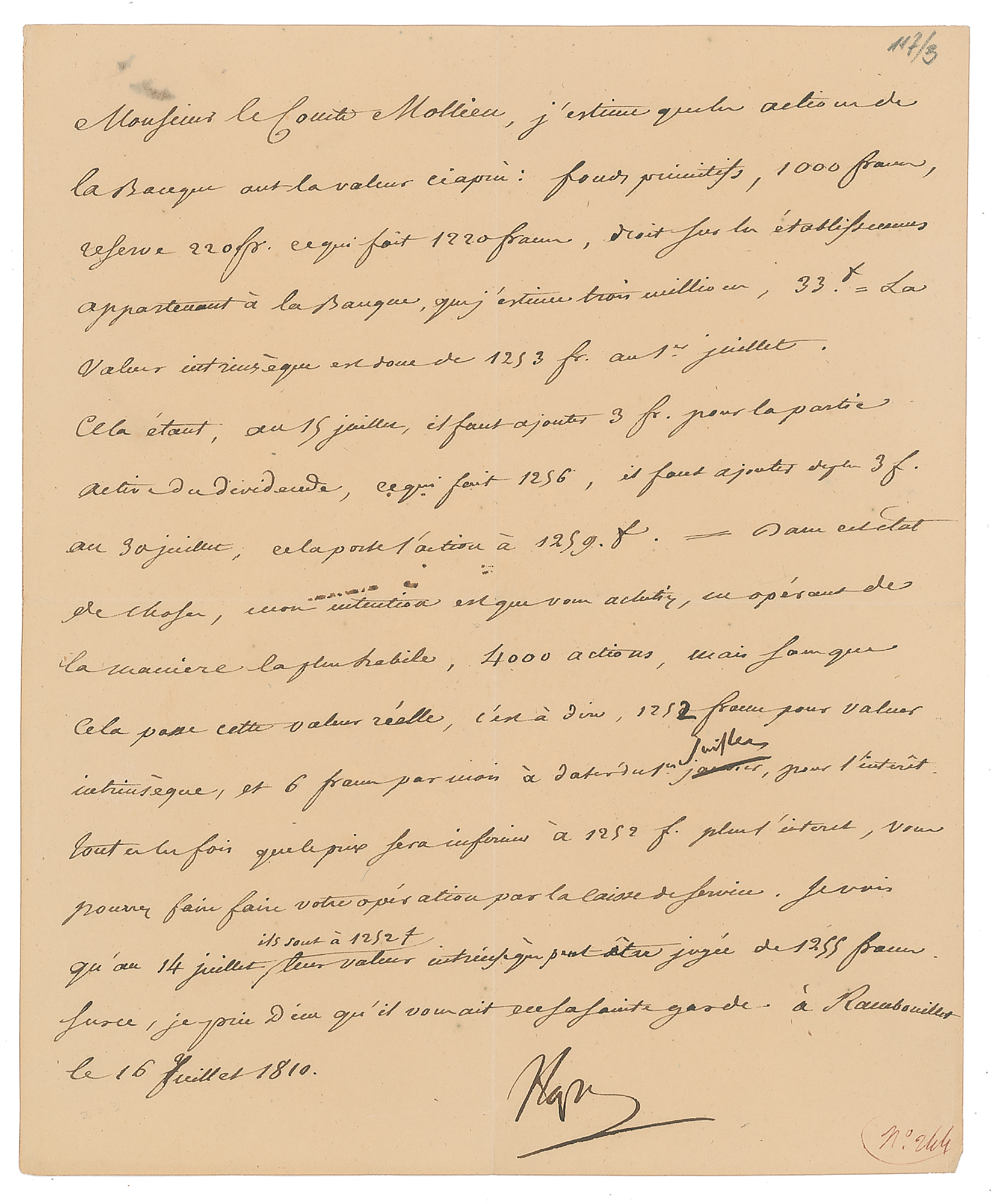 Important LS in French, signed “Nap.,” one page, 7.25 x 9, July 16, 1810. Letter to Minister of the Public Treasury Nicolas Francois, Count Mollien, written amidst the Peninsular War. In part (translated): "I estimate that Bank shares have the following values: primitive funds, 1000 francs, reserve 220 fr. which makes 1220 francs, the right on the establishment belonging to the Bank I estimate at three million, 33 f = the intrinsic value is thus 1253 fr. on July 1. That being the case, on July 15, we must add 3 fr. to the active part of the dividend, which makes 1256, we must add 3 f. on July 30, which brings the share to 1259 f. In this state of things, I want you to activate, in the easiest way possible, 4000 shares, but without surpassing their real value, that is, 1252 francs for intrinsic value, and 6 francs per month after July 1, for interest. While the price is less than 1252 f. plus interest, you will be able to conduct your operations at the service desk. I see that on July 14, they were at 1252 f., their intrinsic value thus being judged at 1255 francs." Napoleon makes one handwritten correction to the text, changing the month "January" to "July." In fine condition. A desirable letter illustrating Bonaparte's impressive grasp of economics—a necessity for financing his empire-building.