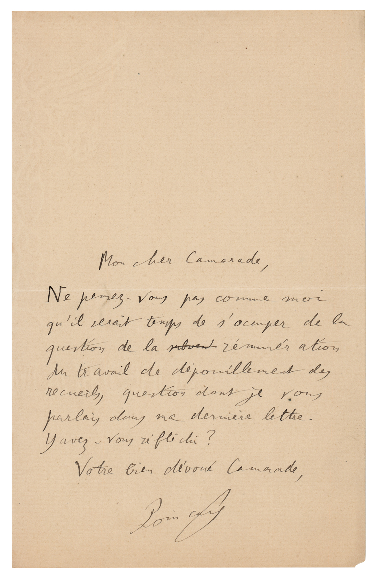 French mathematician, physicist, and philosopher of science (1854-1912) who famously formulated the 'Poincare Conjecture,' which went unsolved for nearly a century. ALS in French, signed “Poincare,” one page, 4.5 x 7, no date. Untranslated handwritten letter by the celebrated mathematician. In fine condition.