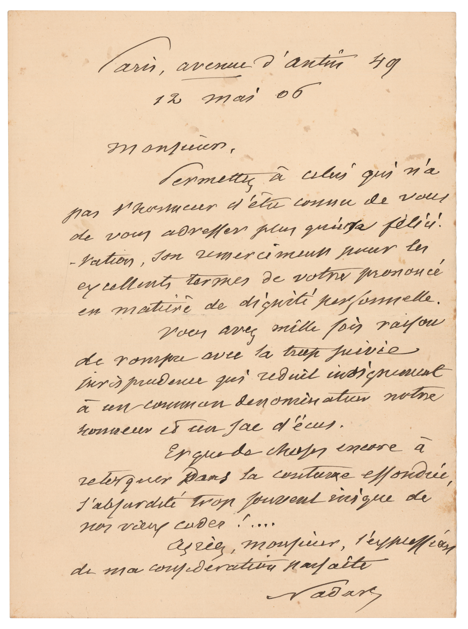 Pseudonym of Gaspard-Felix Tournachon (1820–1910), a French photographer, caricaturist, journalist, novelist, and balloonist. ALS in French, one page, 4.75 x 6.5, May 12, 1906. Addressed from Paris, an untranslated handwritten letter to a justice of the peace named “Potier.” In fine condition. Accompanied by the original hand-addressed mailing envelope.