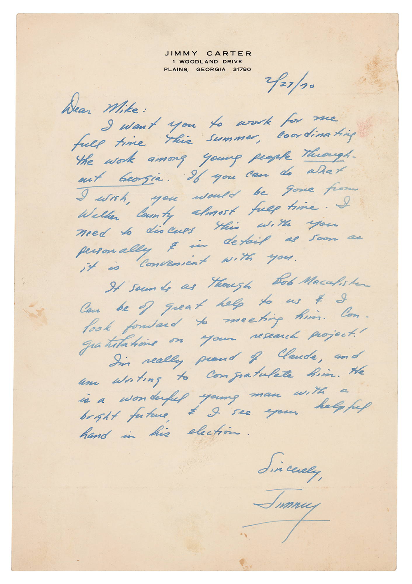 ALS signed “Jimmy,” one page, 7.25 x 10.5, personal letterhead, February 27, 1970. A handwritten letter to “Mike,” in full: “I want you to work for me full time this summer, coordinating the work among young people throughout Georgia. If you can do what I wish, you would be gone from Walker County almost full time. I need to discuss this with you personally & in detail as soon as it is convenient for you. It sounds as though Bob Macalister can be of great help to us & I look forward to meeting him. Congratulations on your research project! I’m really proud of Claude, and am writing to congratulate him. He is a wonderful young man with a bright future, & I see your helpful hand in his election.” In fine condition, with some faint stains in the margins. An uncommon early example—Carter would be elected Governor of Georgia in November of that year.
