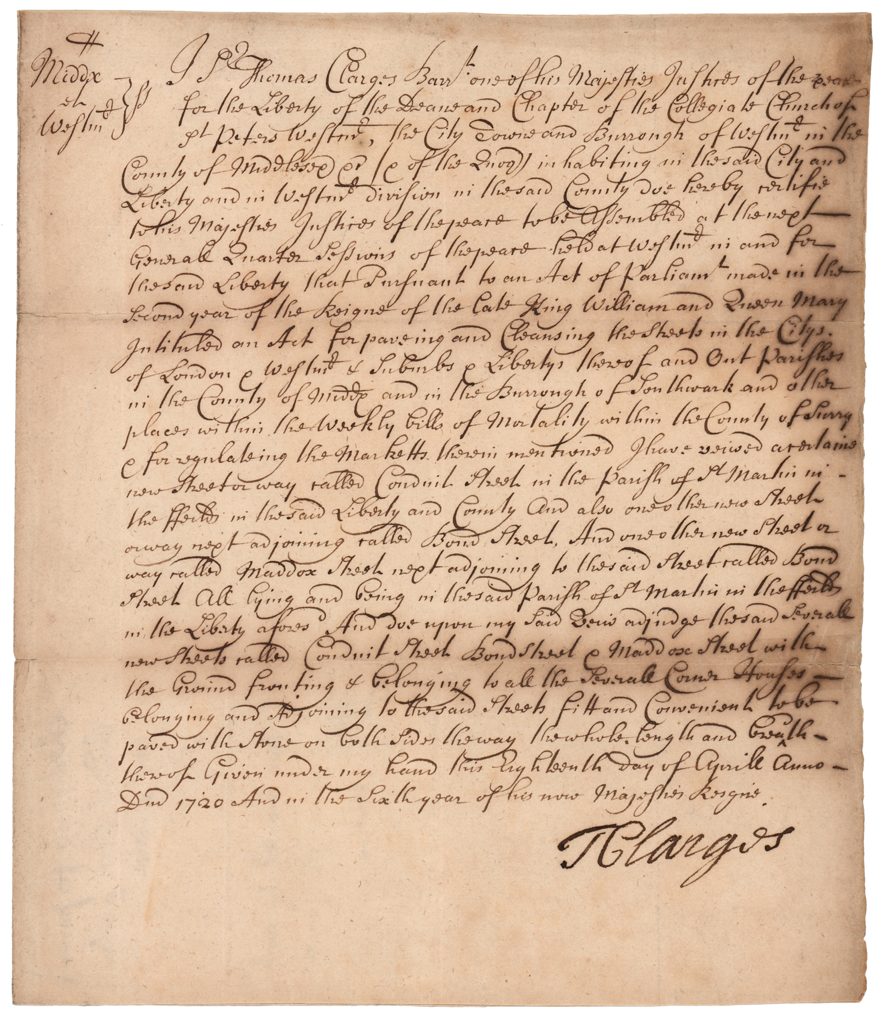 Manuscript DS, signed “T. Clarges,” one page, 7.75 x 9, April 18, 1720. A ‘certificate’ for paving new streets in London, which reads, in part: “Pursuant to an Act of Parliam’t made in the second year of the Reigne of the late King William and Queen Mary…for paveing and Cleansing the Streets in the Citys of London & Westm’r & Suburbs…& for regulating the marketts therein mentioned I have viewed a certaine new Street or way called Conduit Street in the parish of St Martin in the Fields…And also one other new Street or way next adjoining called Bond Street, And one other new Street or way called Maddox Street next adjoining to…Bond Street…And doe…adjudge the said severall new Streets…within the Ground fronting & belonging to all the Several Corner Houses belonging and Adjoining to the said Streets fitt and Convenient to be paved with Stone on both Sides [of] the way the whole length and breath.” Signed at the conclusion by Thomas Clarges, Baronet. A docket on the reverse of the integral leaf notes that the streets are “To be paved within—two months the same order as for George Street.” In fine condition, with staining to the right edge and fold ends.