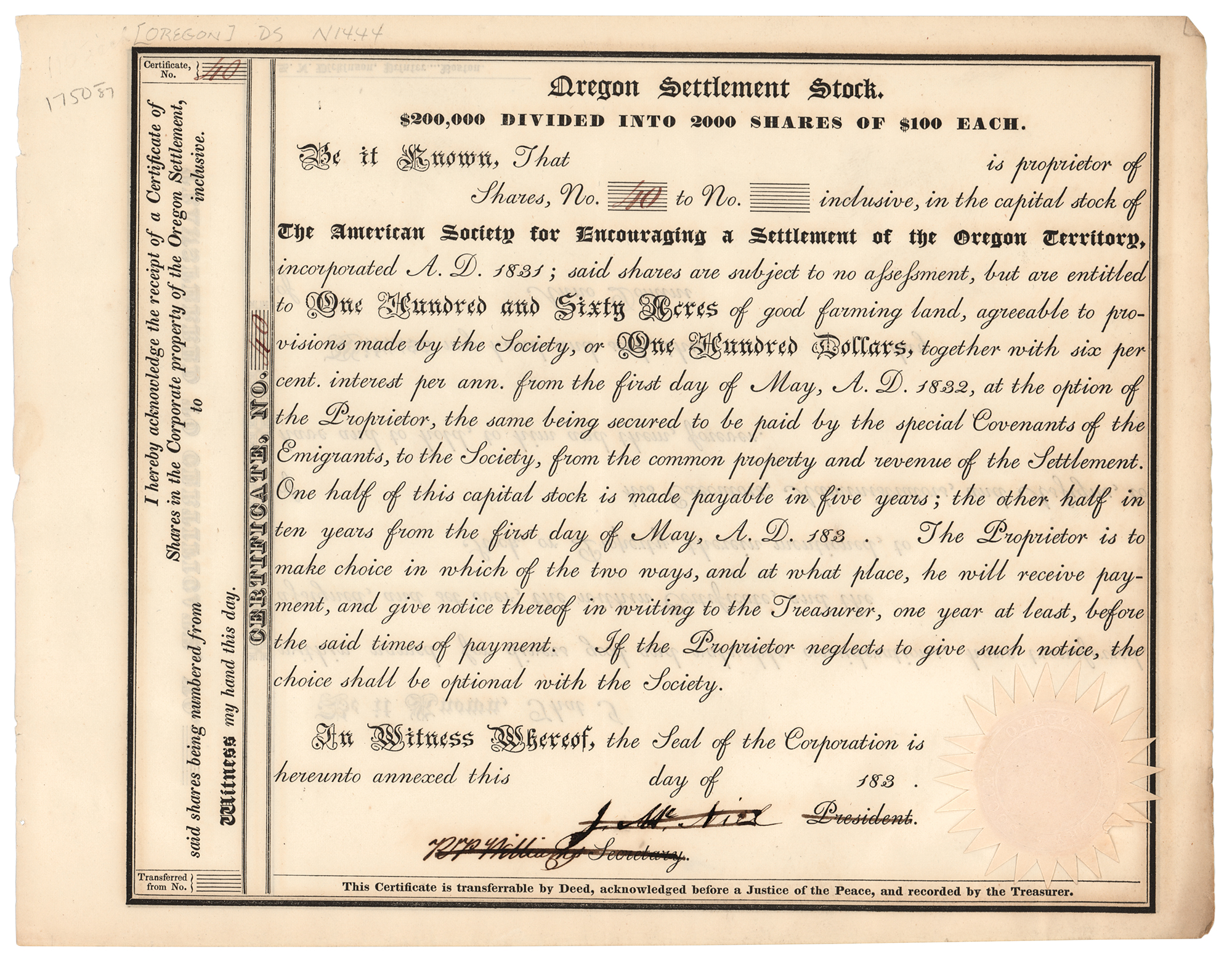Partly-printed document, one page, 10.5 x 8.25, no date [circa 1831]. Unissued early stock certificate from “The American Society for Encouraging the Settlement of Oregon Territory,” signed at the conclusion by J. McNeil as president and R. P. Williams as secretary. The certificate reads, in part: “Be it known that…is the proprietor of shares No. 40…in the capital stock of the American Society for Encouraging a Settlement of the Oregon Territory, incorporated A.D. 1831: said shares are subject to no assessment, but are entitled to one hundred and sixty acres of good farming land, agreeable to provisions made by the Society, or one hundred dollars, together with six per cent interest per ann. from the first day of May, A.D. 1832, at the option of the proprietor, the same being secured to be paid by the special covenants of the emigrants to the Society from the common property and revenue of the settlement. One half of this capital stock is made payable in five years; the other half in ten years…The proprietor is to make choice in which of the two ways, and at what place, he will receive payment, and give notice thereof in writing to the treasurer one year at least before the said times of payment. If the proprietor neglects to give such notice, the choice shall be optional with the Society.” The lower right bears an affixed "Society Oregon Territory, 1831" seal. In fine condition.