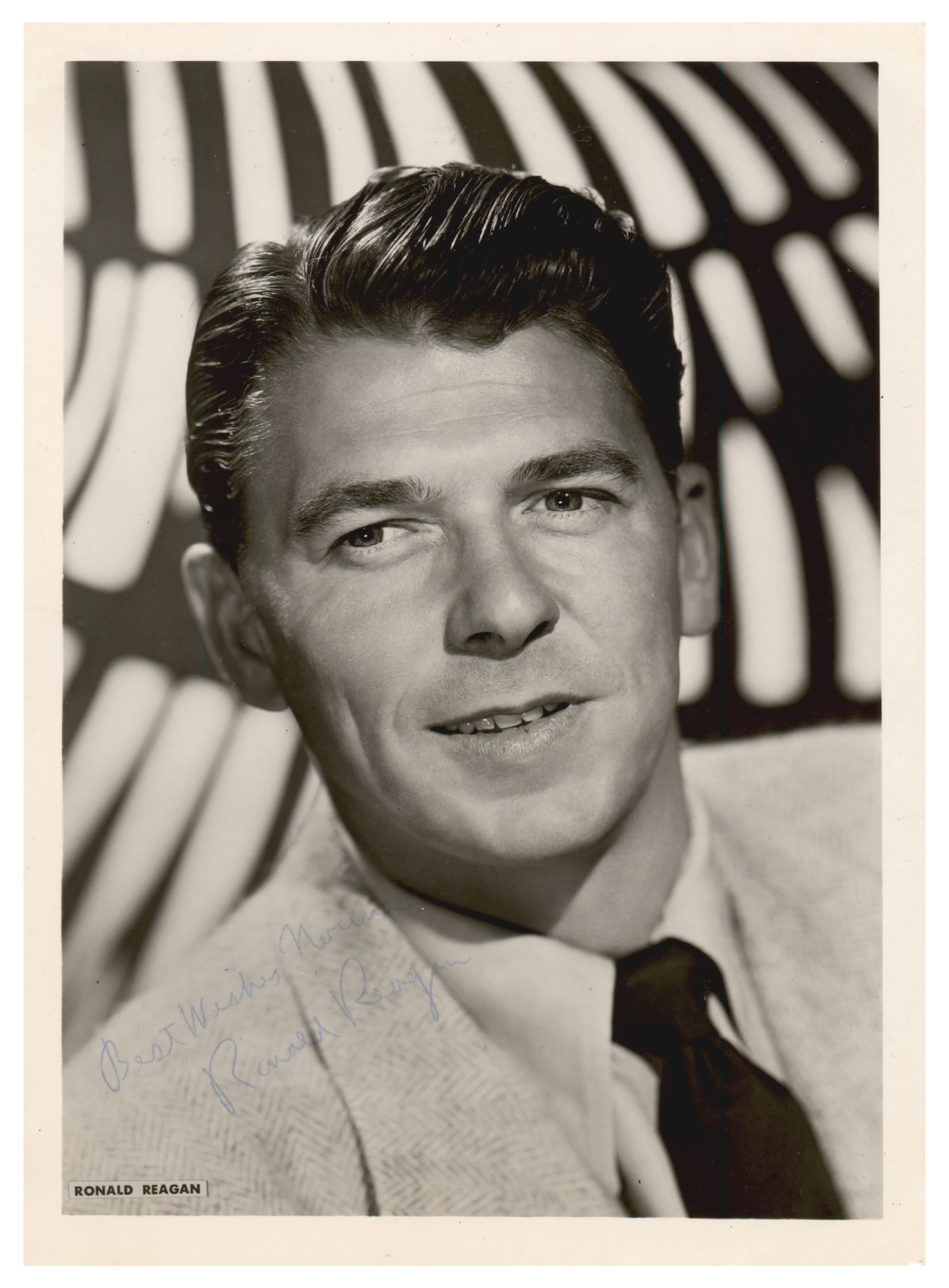 Vintage glossy 5 x 7 head-and-shoulders photo of Reagan during his Hollywood years, signed and inscribed in blue ballpoint, "Best Wishes Norma, Ronald Reagan.” In fine condition, with a very faint diagonal bend.
