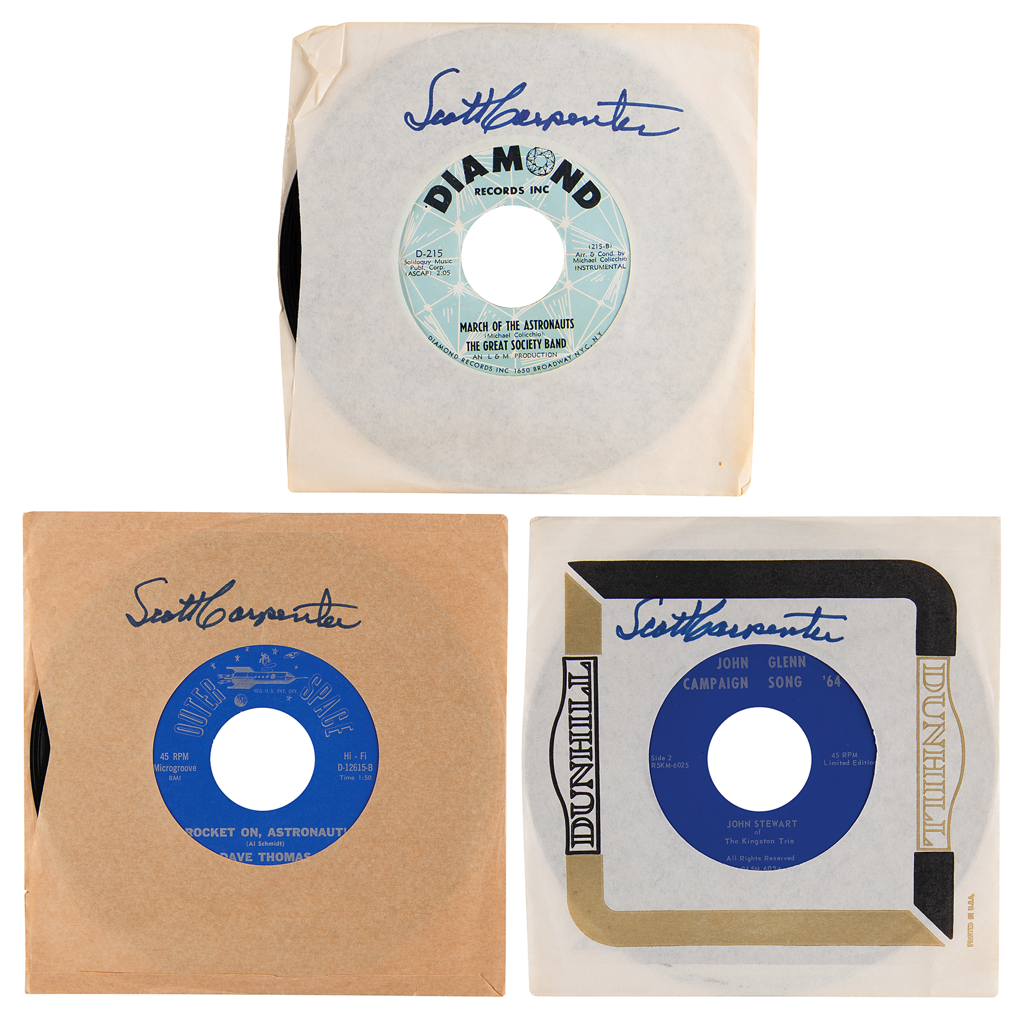 Three space-themed 45 RPM records from the personal collection of Mercury astronaut Scott Carpenter, each signed on the paper sleeve in blue felt tip, "Scott Carpenter." Includes: 'March of the Astronauts' by The Great Society Band; 'Rocket On, Astronauts' by Dave Thomas; and 'John Glenn Campaign Song '64'' by John Stewart of The Kingston Trio. In fine condition, with some light creasing to the sleeves. Accompanied by a certificate of authenticity from Farthest Reaches LLC, stating: "These records were a part of Scott's personal collection…obtained directly from the Carpenter family via special arrangement."