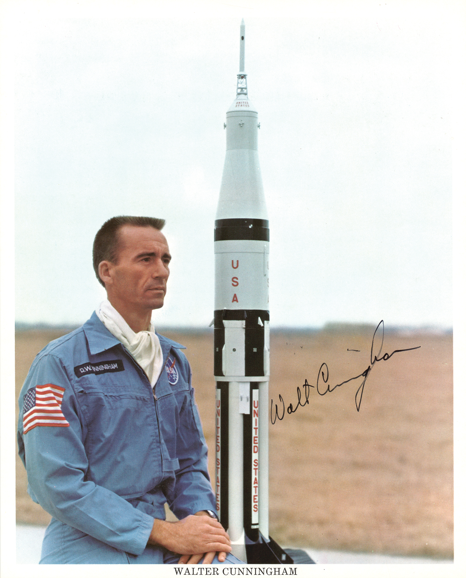 Official color 8 x 10 NASA lithograph of the Apollo 7 astronaut posing in front of a large model of the Saturn V, signed in black felt tip, "Walt Cunningham." In very fine condition. Accompanied by a full letter of authenticity from Zarelli Space Authentication.