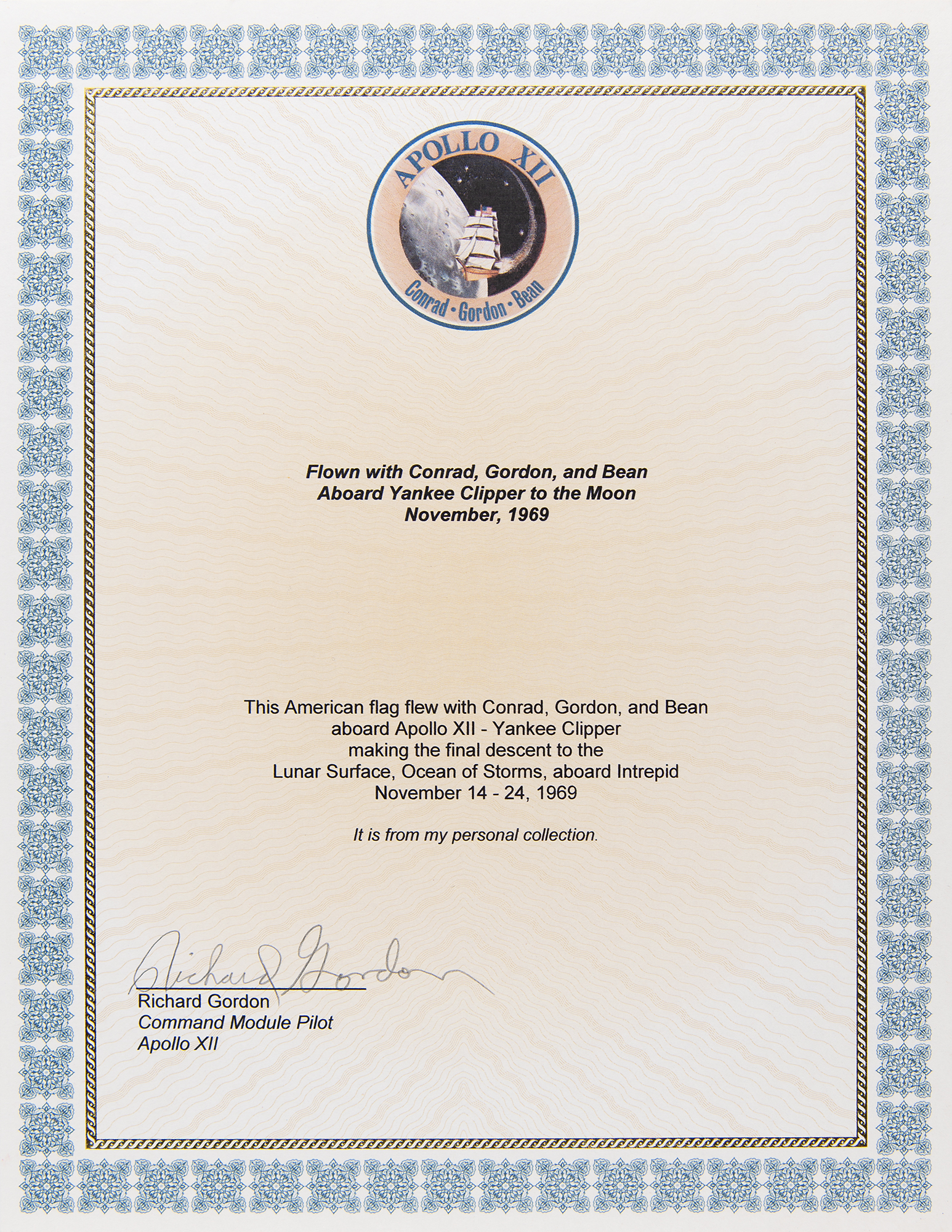Fantastic mid-size American flag carried to the lunar surface on Apollo 12, 11.5 x 8, affixed to a 14 x 18 presentation mat, signed on the mount in ink by the entire crew, "Charles Conrad, Jr.," "Dick Gordon," and "Alan Bean." Affixed below is a caption, "Sailed with Yankee Clipper and Intrepid to the Ocean of Storms, November 1969." Inset within the mat is a 4˝ 'quarantine' crew patch, as worn on the crew's flight suits within the Mobile Quarantine Facility. In very good to fine condition, with a prominent split to the surface of the mount (not breaking through), affecting neither the artifacts nor the signatures. Accompanied by a letter of provenance signed by CMP Richard Gordon, in part: "This American flag flew with Conrad, Gordon, and Bean aboard Apollo XII - Yankee Clipper, making the final descent to the Lunar Surface, Ocean of Storms, aboard Intrepid, November 14–24, 1969. It is from my personal collection."