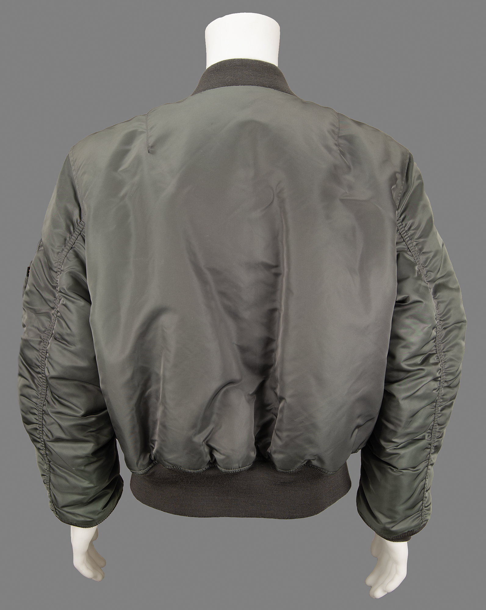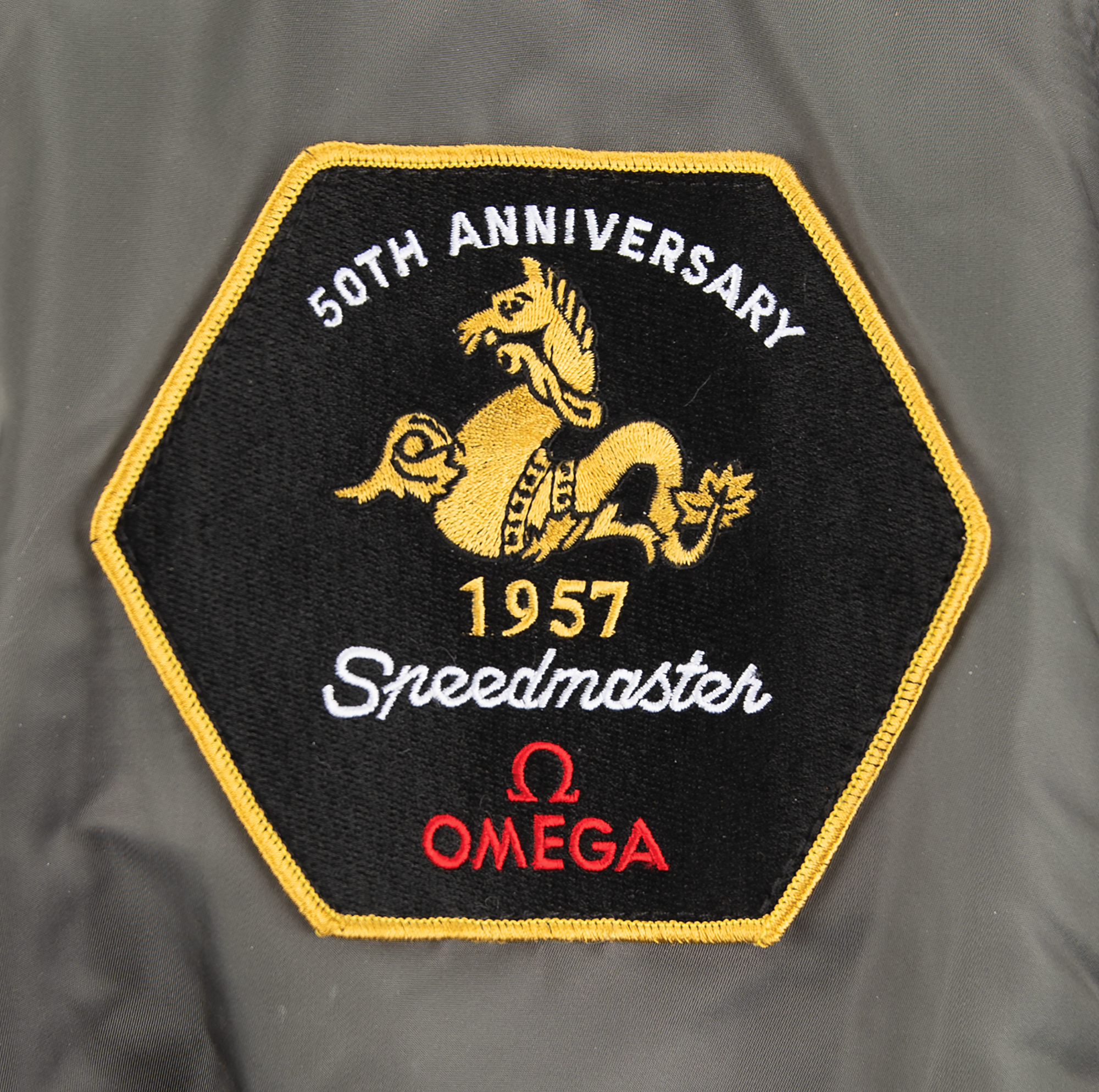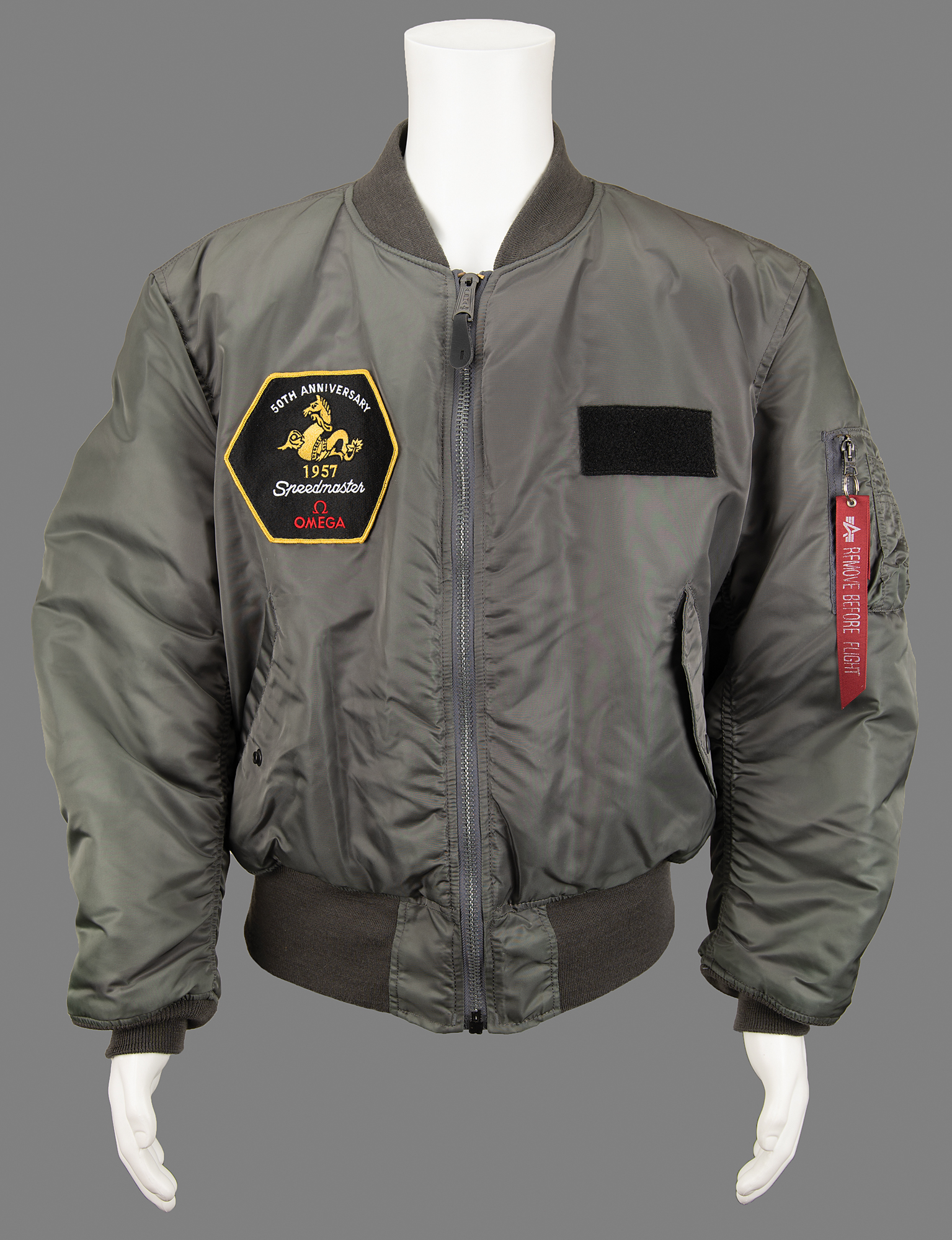 Wally Schirra's gray nylon flight jacket that was produced for the 50th anniversary of the Omega watch company. An embroidered 50th anniversary 1957 Speedmaster Omega patch is sewn onto the right breast, and the left breast features a black female-loop pad designed to attach a Velcro name patch. The left arm bears an Alpha Industries manufacturer's tag and a maroon "Remove Before Flight" ribbon attached to a zipper. In fine condition. Accompanied by a certificate of authenticity from Stephen Hankow of Farthest Reaches stating that the jacket was obtained from Wally Schirra.
