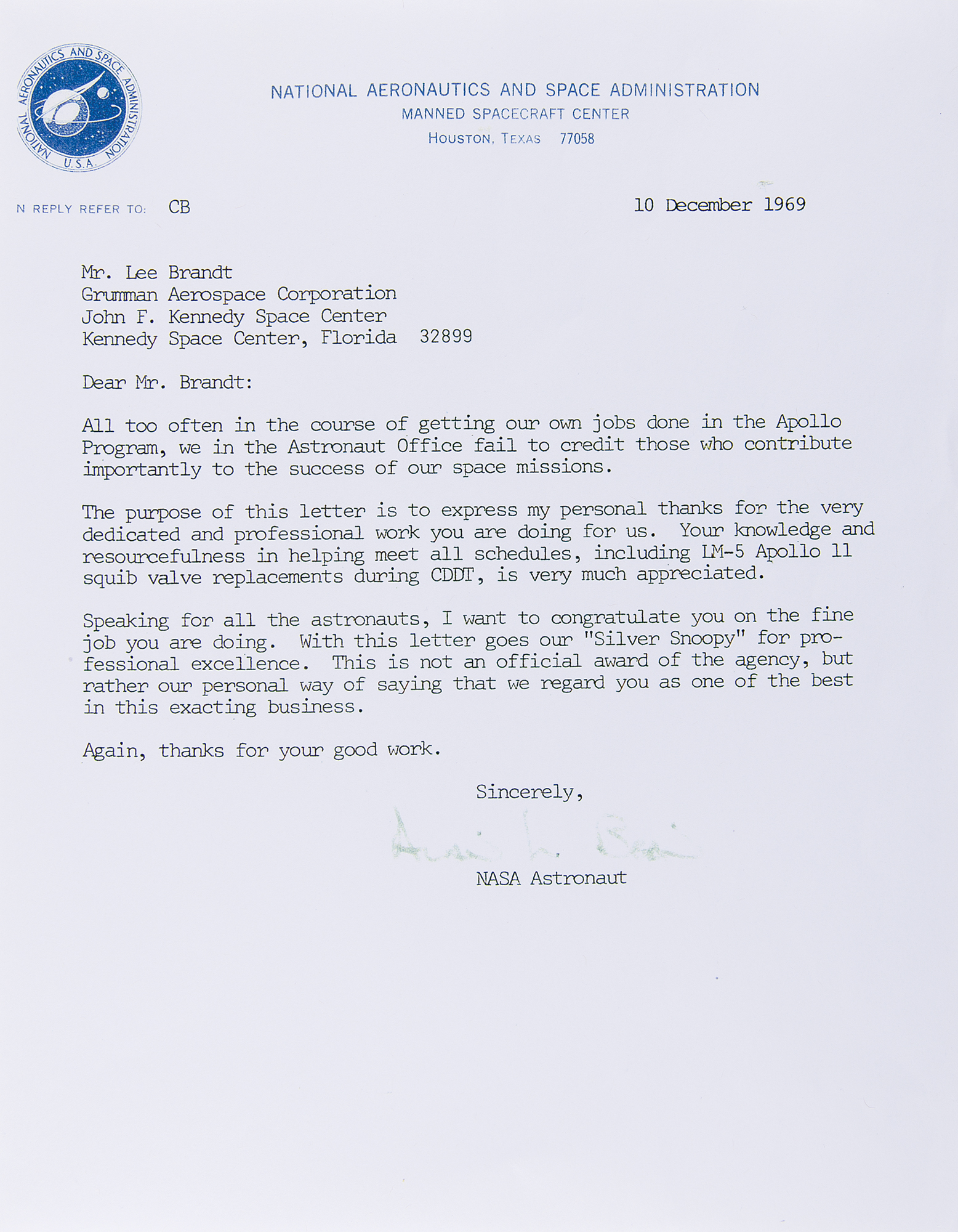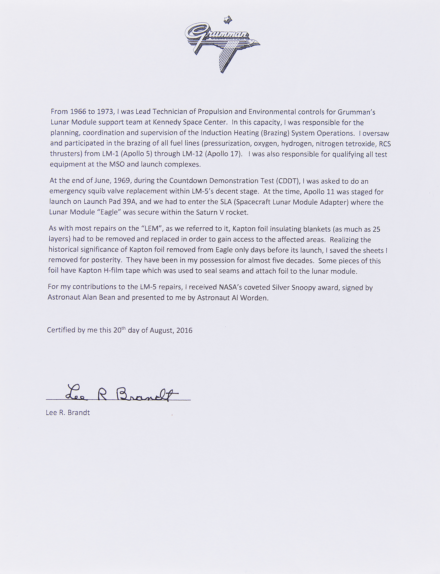 Accompanied by a letter of provenance from Lee R. Brandt, the lead technician of Propulsion and Environmental controls for Grumman's lunar module support team at the Kennedy Space Center, who notes: "At the end of June, 1969, during the Countdown Demonstration Test…I was asked to do an emergency squib valve replacement within LM-5's descent stage. At the time, Apollo 11 was staged for launch on Launch Pad 39A, and we had to enter the SLA…where the Lunar Module 'Eagle' was secure within the Saturn V rocket. As with most repairs on the 'LEM,' as we referred to it, Kapton foil insulating blankets (as much as 25 layers) had to be removed and replaced in order to gain access to the affected areas. Realizing the historical significance of Kapton foil removed from Eagle only days before its launch, I saved the sheets I removed for posterity…For my contributions to the LM-5 repairs, I received NASA's coveted Silver Snoopy award." Also accompanied by a copy of a letter from future Apollo 12 moonwalker Alan Bean, conveying to Brandt the referenced 'Silver Snoopy' award.