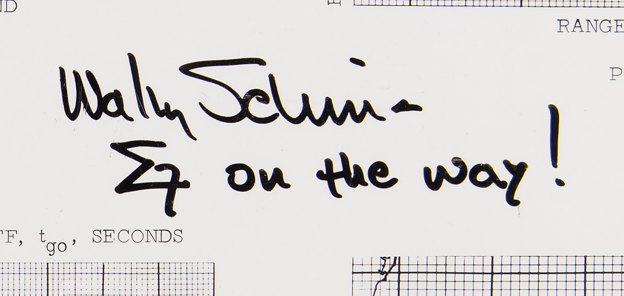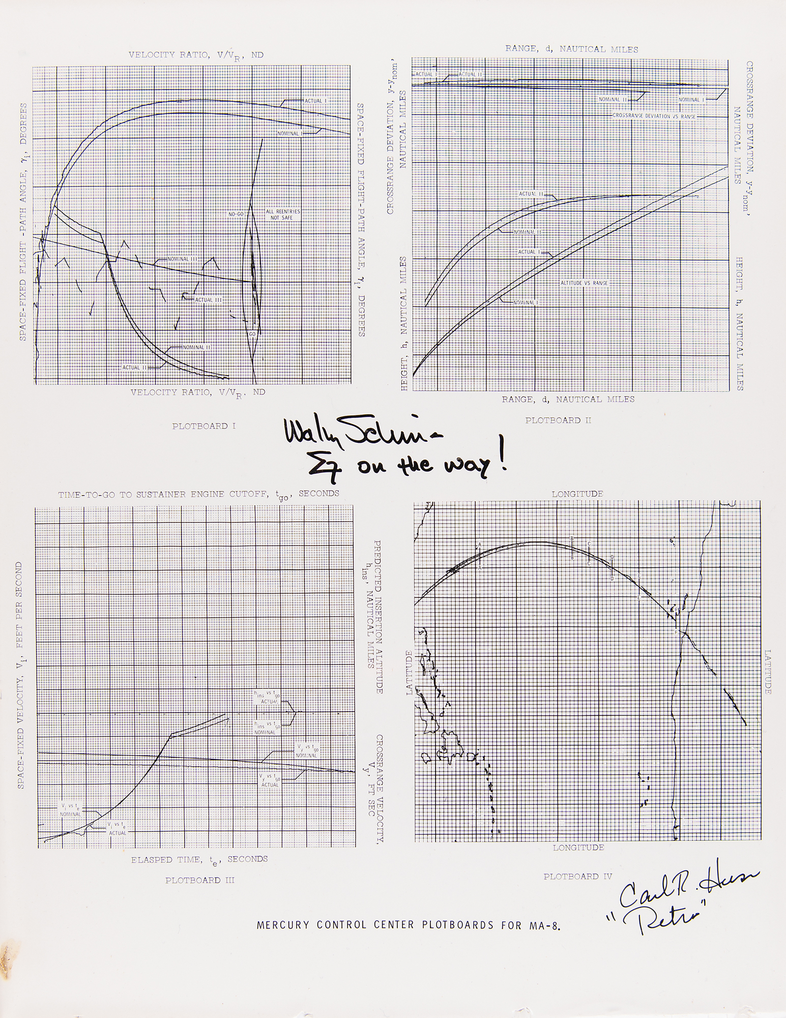 Glossy 10.5 x 13.5 photo of the “Mercury Control Center Plotboards for MA-8,” the Mercury-Atlas 8 mission, containing four plotboards for Velocity Ratio, Range, Elapsed Time, and Longitude, signed in the center in black felt tip, “Wally Schirra, [Sigma]7 on the way!” This photo was presented to Schirra by NASA Retrofire Controller Carl R. Huss, who signed the lower right in black ink. In fine condition, with some small edge dings. Accompanied by a certificate of authenticity from Stephen Hankow of Farthest Reaches, who states that the photo “comes from the Schirra Family Collection and was obtained via special arrangement.”