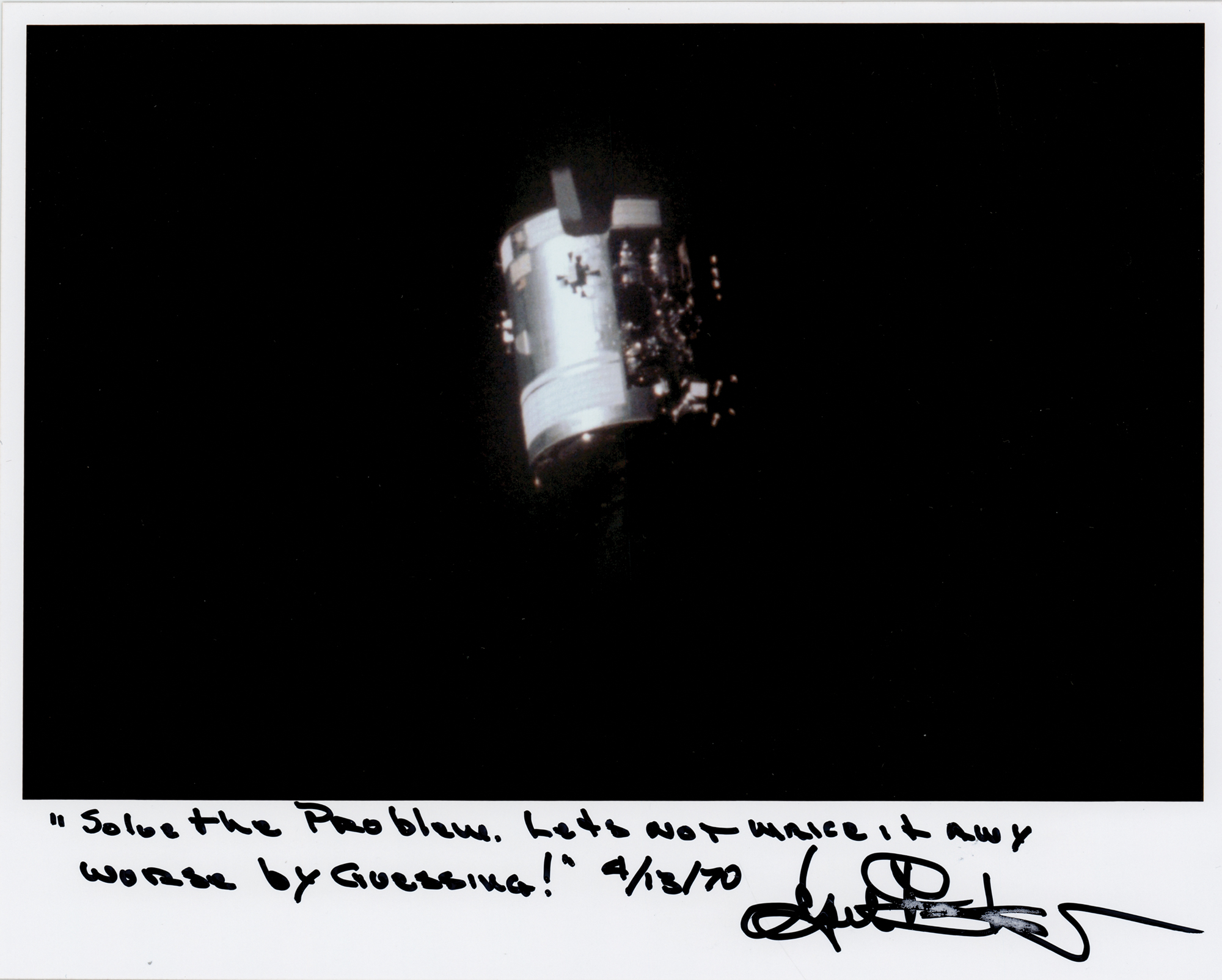 Color glossy 10 x 8 photo of the damaged Apollo 13 spacecraft, signed in the lower border in black felt tip, "'Solve the problem. Let's not make it any worse by guessing!' 4/13/70, Eugene F. Kranz." In fine condition, with a bit of irregular adhesion to his surname.