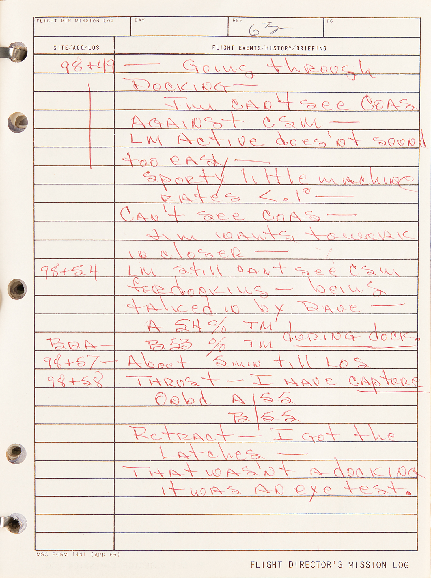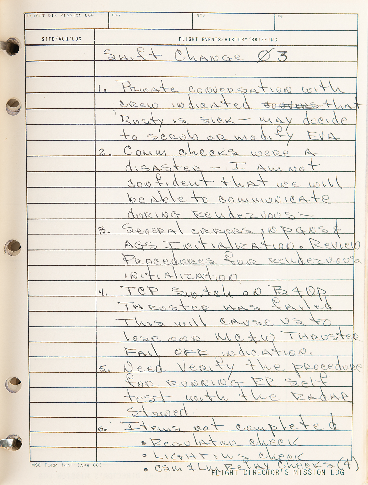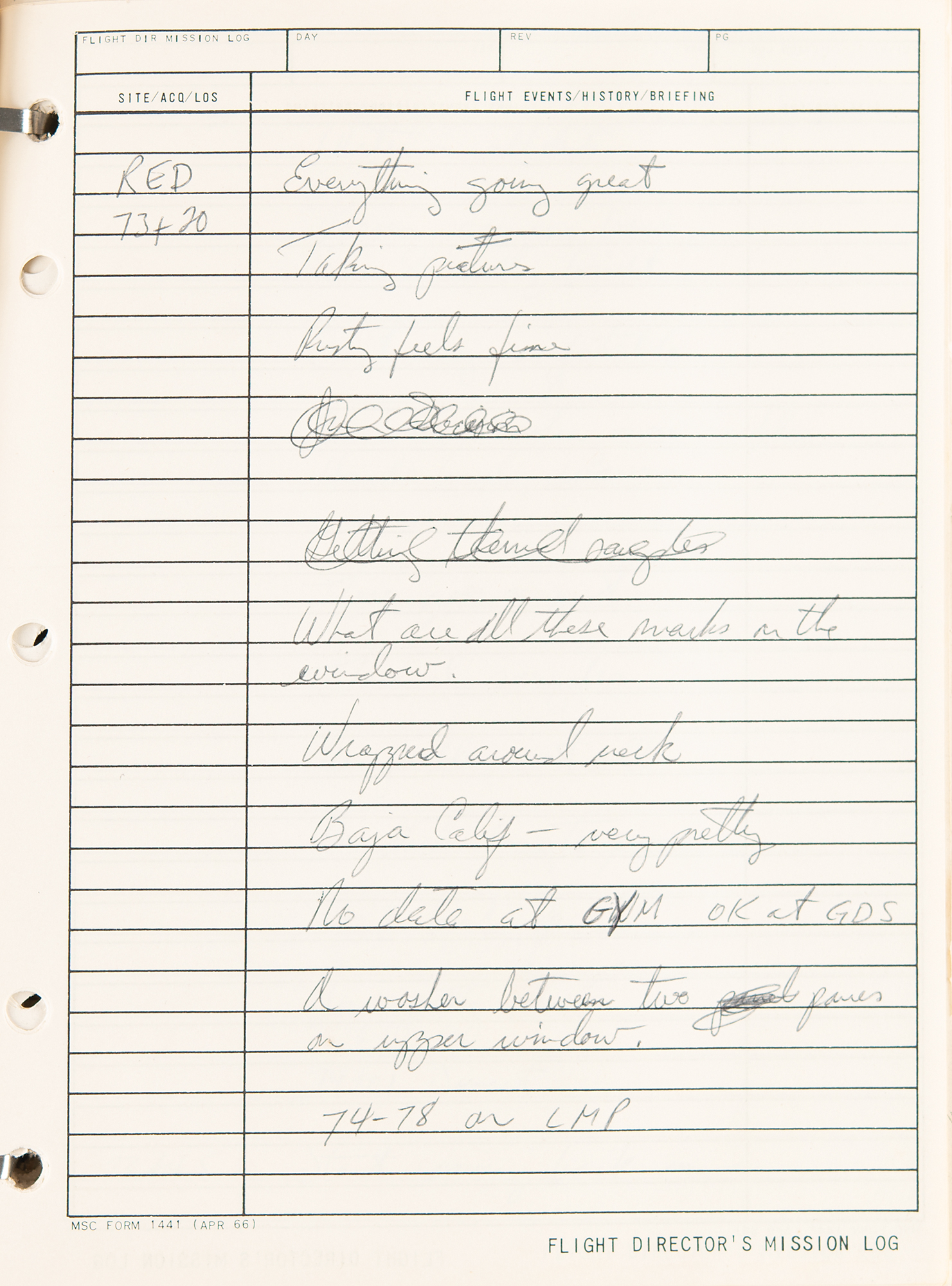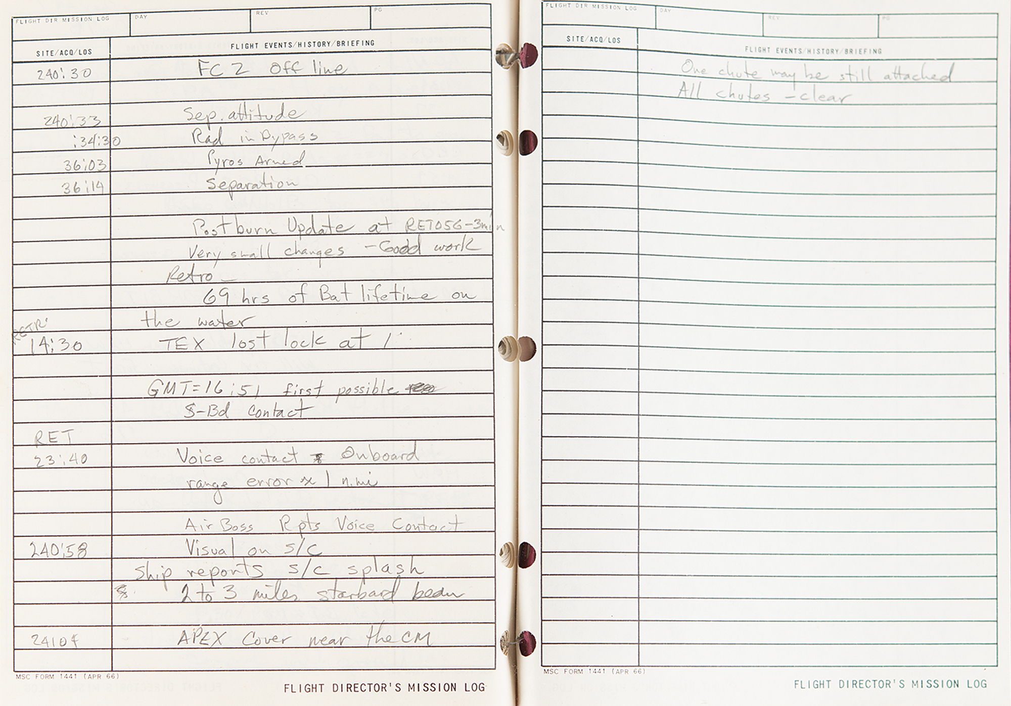 Gene Kranz’s official flight director’s logbook for the historic Apollo 9 mission, containing extensive handwritten notes made in real-time by Kranz and other flight personnel at Houston’s Mission Control Center. The bracket-bound manual, 9 x 11.5, 100+ pages, annotated on the front cover in black felt tip, “A9 F.D. Log” and “Apollo 9/4, 1-4-8,” contains comprehensive documentation on the Apollo 9 mission with numerous pages annotated in ballpoint or pencil in Kranz’s recognizable blocky handwriting. From launch to splashdown, the manual covers all key events of the mission, including EVA procedures, docking reports between the CSM Gumdrop and LM Spider, and ample instrument and crew updates; both Rusty Schweickart and Jim McDivitt became ill during the flight. In overall fine condition. Accompanied by a certificate of authenticity from Stephen Hankow of Farthest Reaches, which states that this manual “was obtained directly from Flight Director Kranz.” Packed with fascinating, unabashed mission-critical notes, this Kranz-used MCC logbook is of immense appeal and significance—the Apollo 9 mission is historic as it is the first flight of a lunar module, and the first full shakeout test flight in Earth orbit of all the major Apollo equipment, including the command module, command service module, and lunar module.