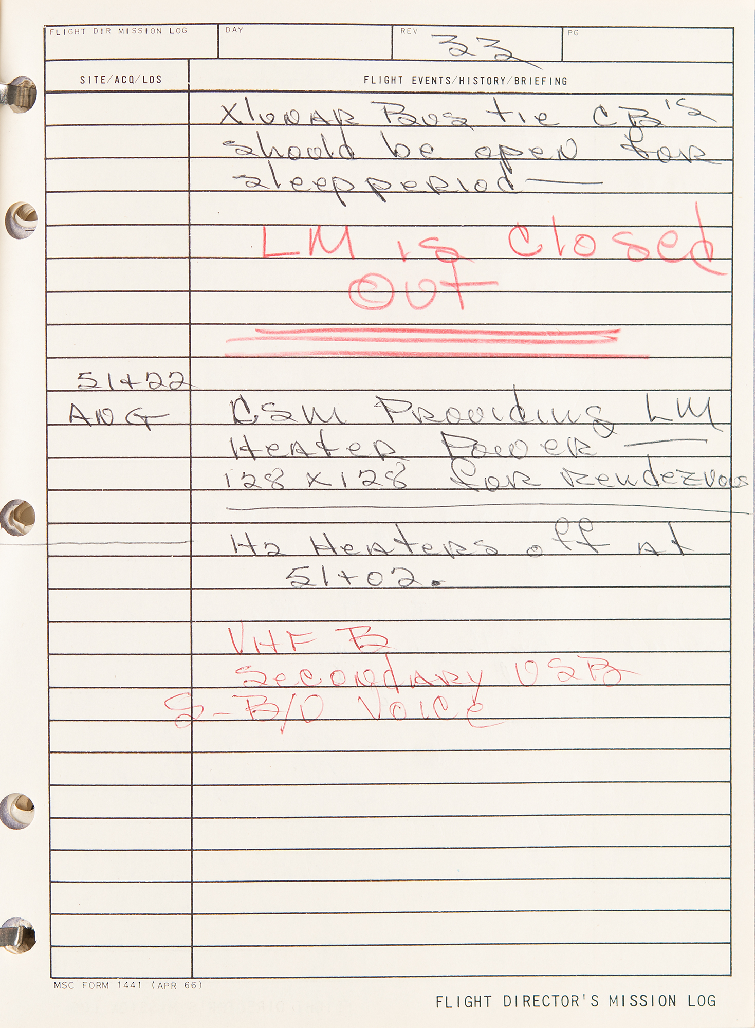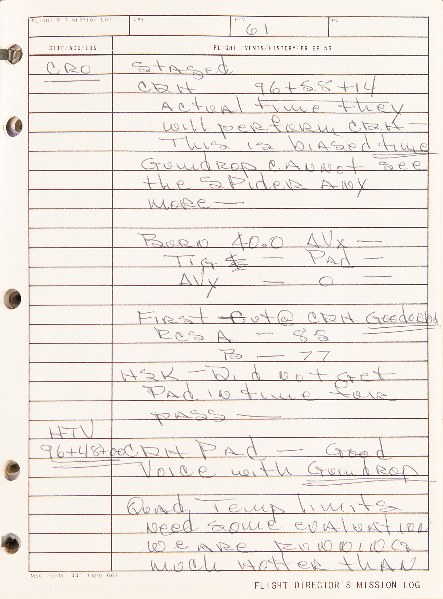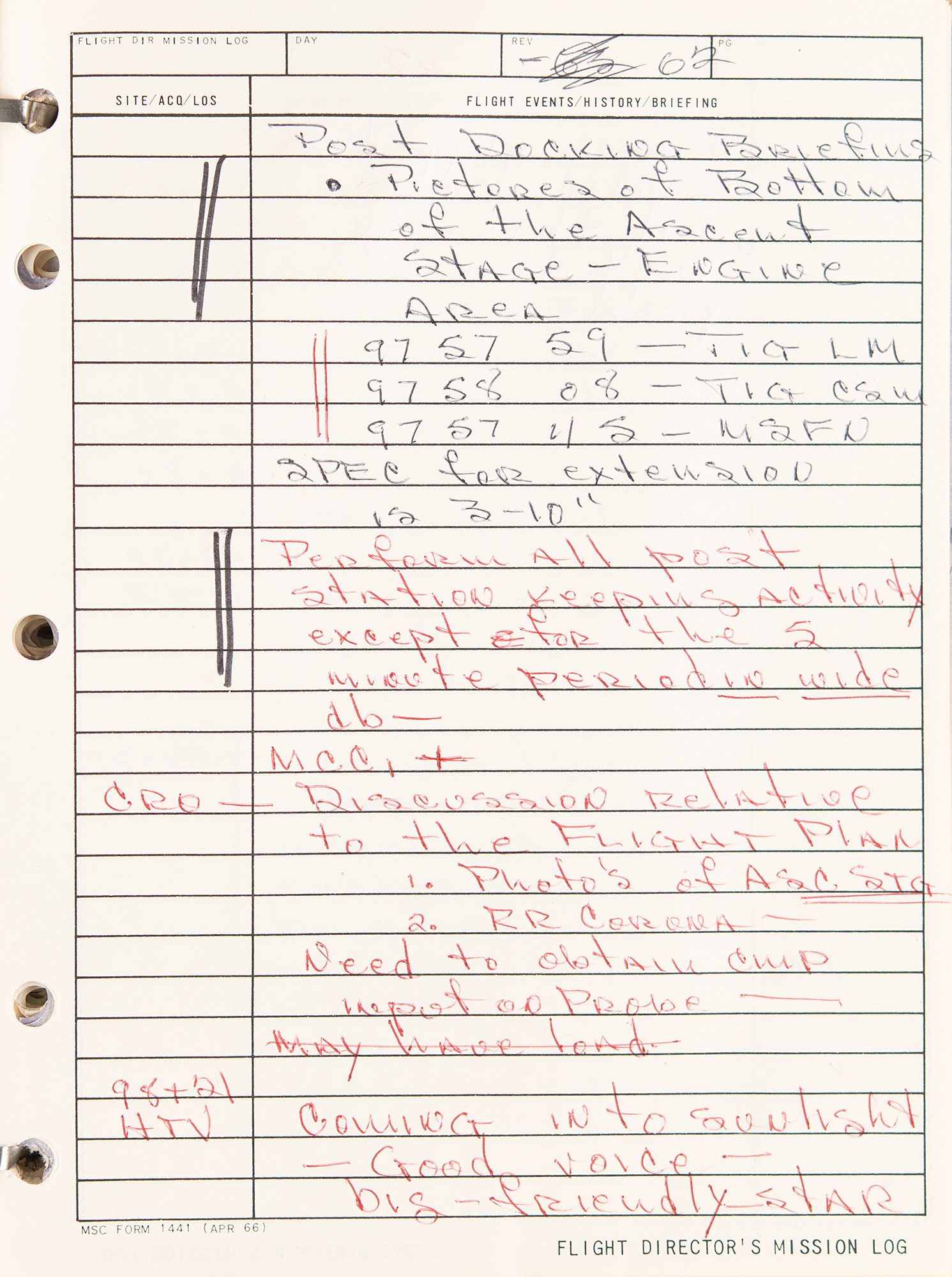 Gene Kranz’s official flight director’s logbook for the historic Apollo 9 mission, containing extensive handwritten notes made in real-time by Kranz and other flight personnel at Houston’s Mission Control Center. The bracket-bound manual, 9 x 11.5, 100+ pages, annotated on the front cover in black felt tip, “A9 F.D. Log” and “Apollo 9/4, 1-4-8,” contains comprehensive documentation on the Apollo 9 mission with numerous pages annotated in ballpoint or pencil in Kranz’s recognizable blocky handwriting. From launch to splashdown, the manual covers all key events of the mission, including EVA procedures, docking reports between the CSM Gumdrop and LM Spider, and ample instrument and crew updates; both Rusty Schweickart and Jim McDivitt became ill during the flight. In overall fine condition. Accompanied by a certificate of authenticity from Stephen Hankow of Farthest Reaches, which states that this manual “was obtained directly from Flight Director Kranz.” Packed with fascinating, unabashed mission-critical notes, this Kranz-used MCC logbook is of immense appeal and significance—the Apollo 9 mission is historic as it is the first flight of a lunar module, and the first full shakeout test flight in Earth orbit of all the major Apollo equipment, including the command module, command service module, and lunar module.