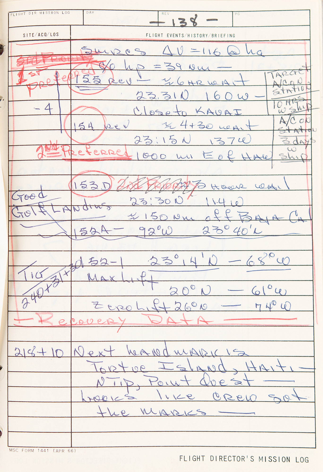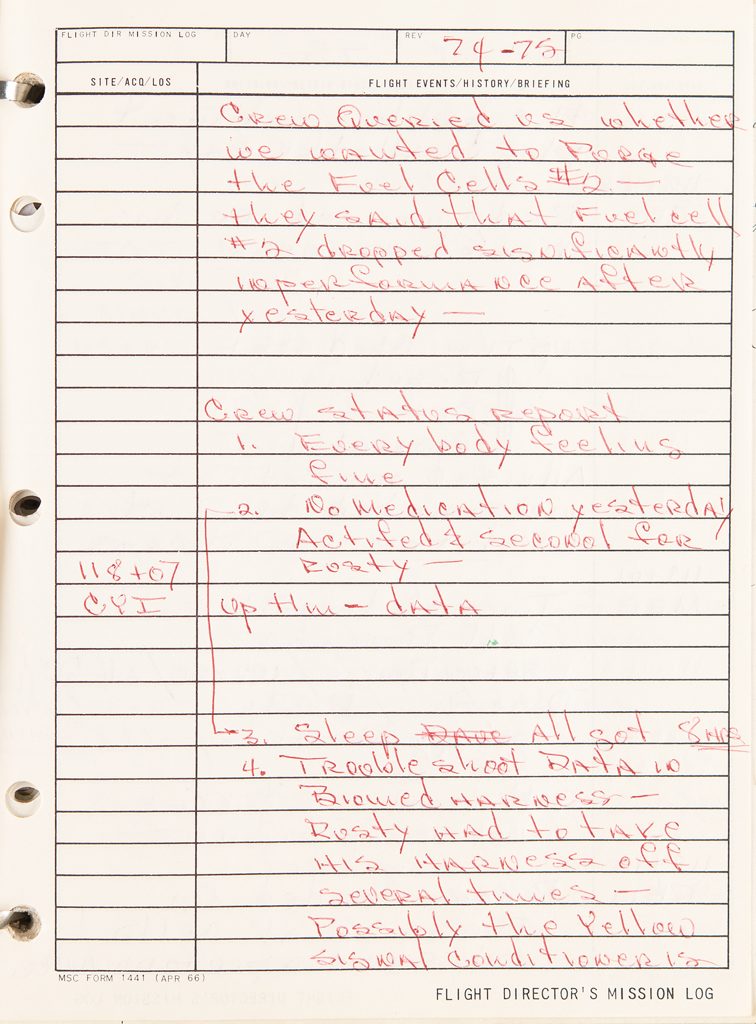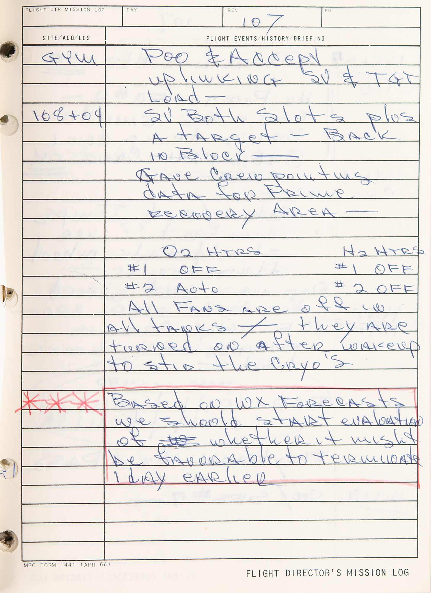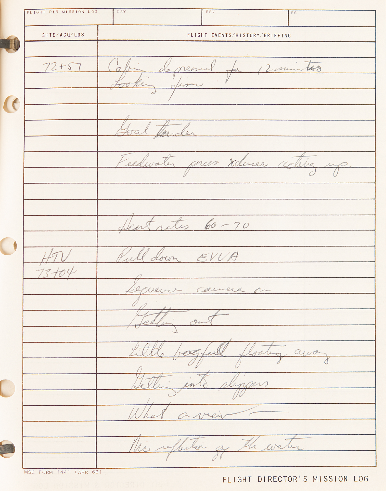 Gene Kranz’s official flight director’s logbook for the historic Apollo 9 mission, containing extensive handwritten notes made in real-time by Kranz and other flight personnel at Houston’s Mission Control Center. The bracket-bound manual, 9 x 11.5, 100+ pages, annotated on the front cover in black felt tip, “A9 F.D. Log” and “Apollo 9/4, 1-4-8,” contains comprehensive documentation on the Apollo 9 mission with numerous pages annotated in ballpoint or pencil in Kranz’s recognizable blocky handwriting. From launch to splashdown, the manual covers all key events of the mission, including EVA procedures, docking reports between the CSM Gumdrop and LM Spider, and ample instrument and crew updates; both Rusty Schweickart and Jim McDivitt became ill during the flight. In overall fine condition. Accompanied by a certificate of authenticity from Stephen Hankow of Farthest Reaches, which states that this manual “was obtained directly from Flight Director Kranz.” Packed with fascinating, unabashed mission-critical notes, this Kranz-used MCC logbook is of immense appeal and significance—the Apollo 9 mission is historic as it is the first flight of a lunar module, and the first full shakeout test flight in Earth orbit of all the major Apollo equipment, including the command module, command service module, and lunar module.
