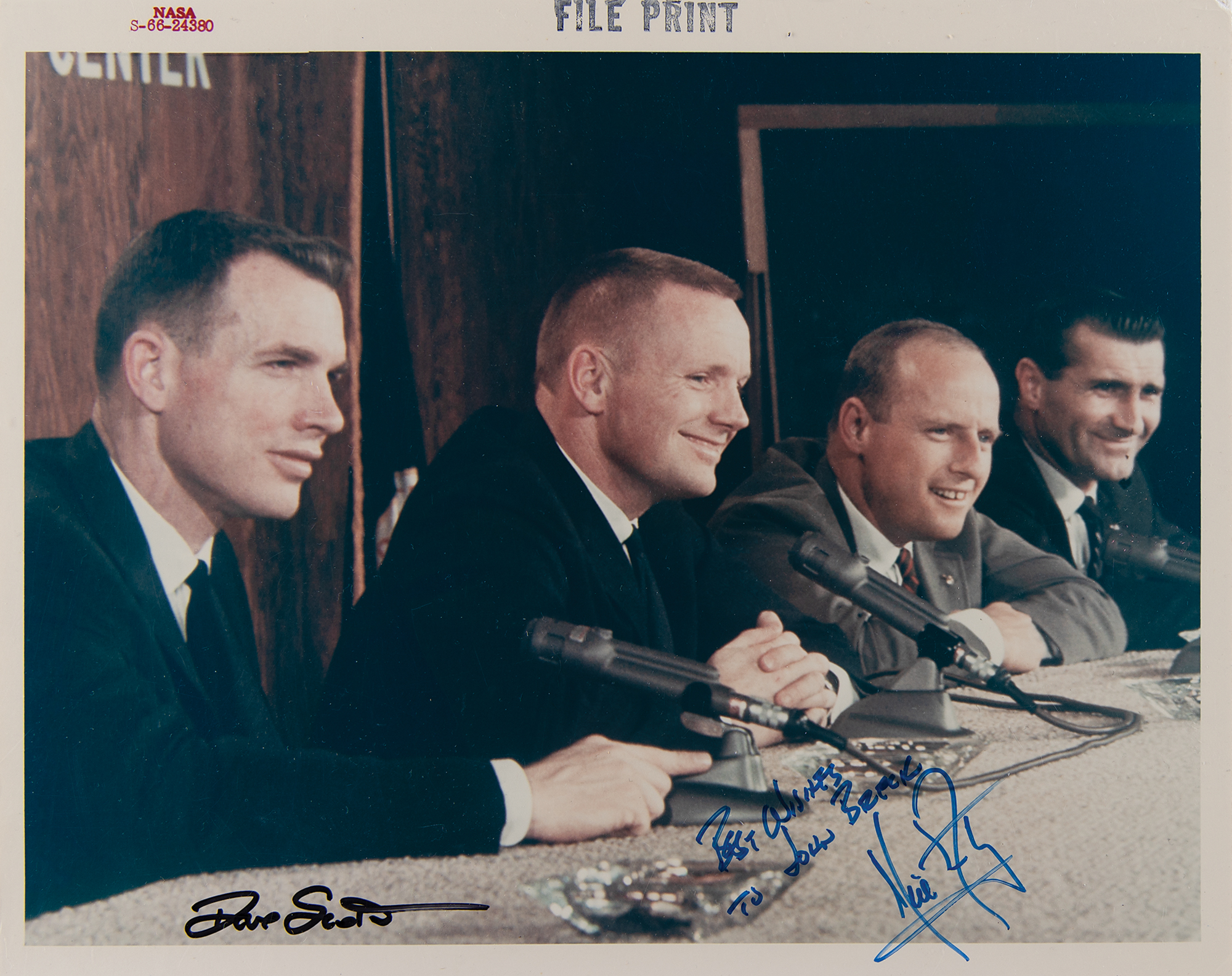 Scarce official color glossy 10 x 8 red-numbered Type 1 NASA photo (S-66-24380) of a press conference with the Gemini 8 prime and backup crews, signed and inscribed in blue felt tip, "Best wishes to John Breck, Neil Armstrong" and in black felt tip, "Dave Scott.” Stamped "File Print" in the upper border, and bears “A Kodak Paper” watermarks on the reverse. In fine condition.