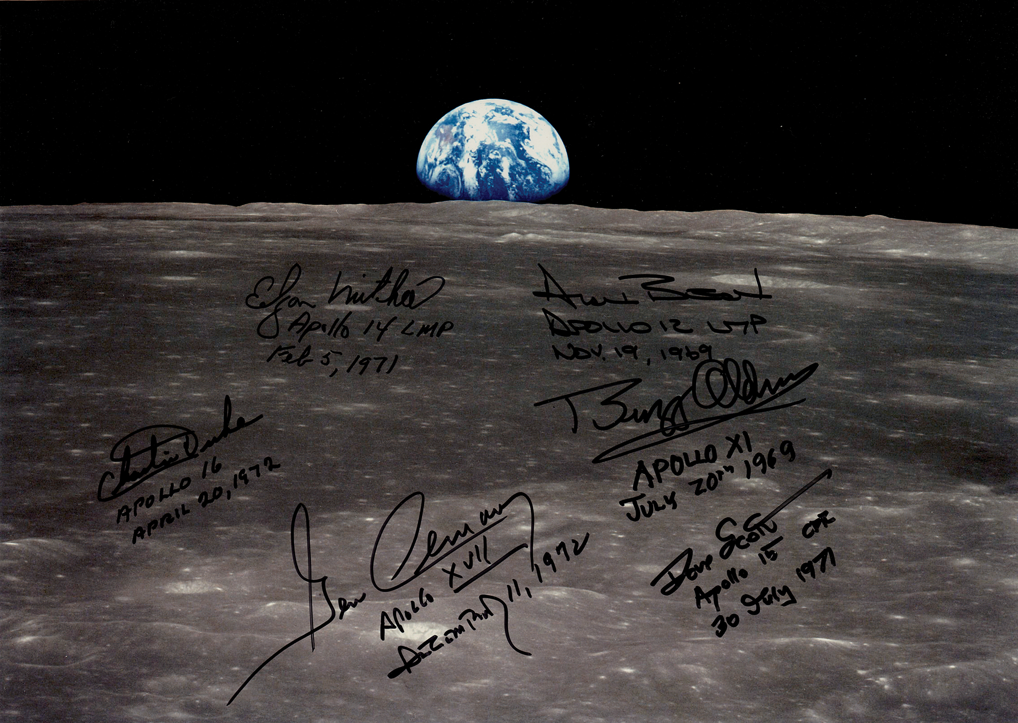 Amazing color glossy 14 x 11 photo of an 'Earthrise' as seen from the moon, signed in black felt tip by a moonwalker from every successful lunar landing mission, all adding their mission and the landing date: "Buzz Aldrin, Apollo XI, July 20th 1969," "Alan Bean, Apollo 12 LMP, Nov. 19, 1969," "Edgar Mitchell, Apollo 14 LMP, Feb. 5, 1971," "Dave Scott, Apollo 15 CDR, 30 July 1971," "Charlie Duke, Apollo 16, April 20, 1972," and "Gene Cernan, Apollo XVII, December 11, 1972." In very fine condition.