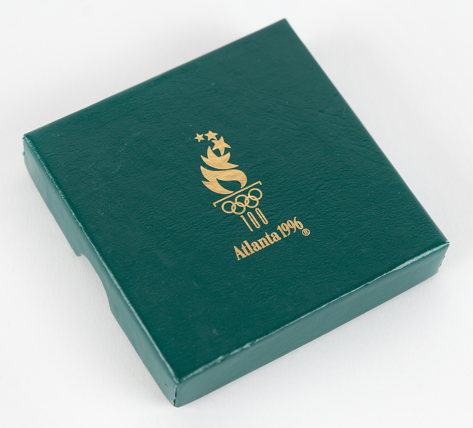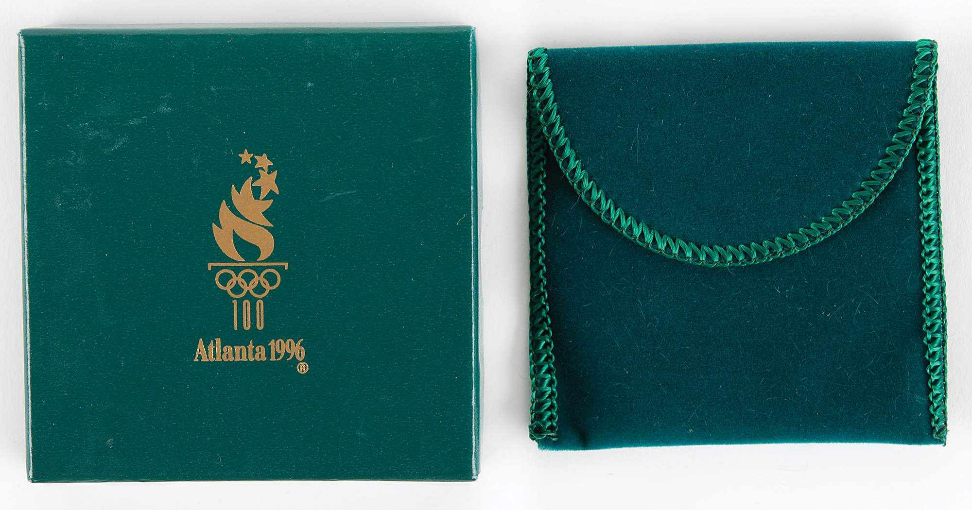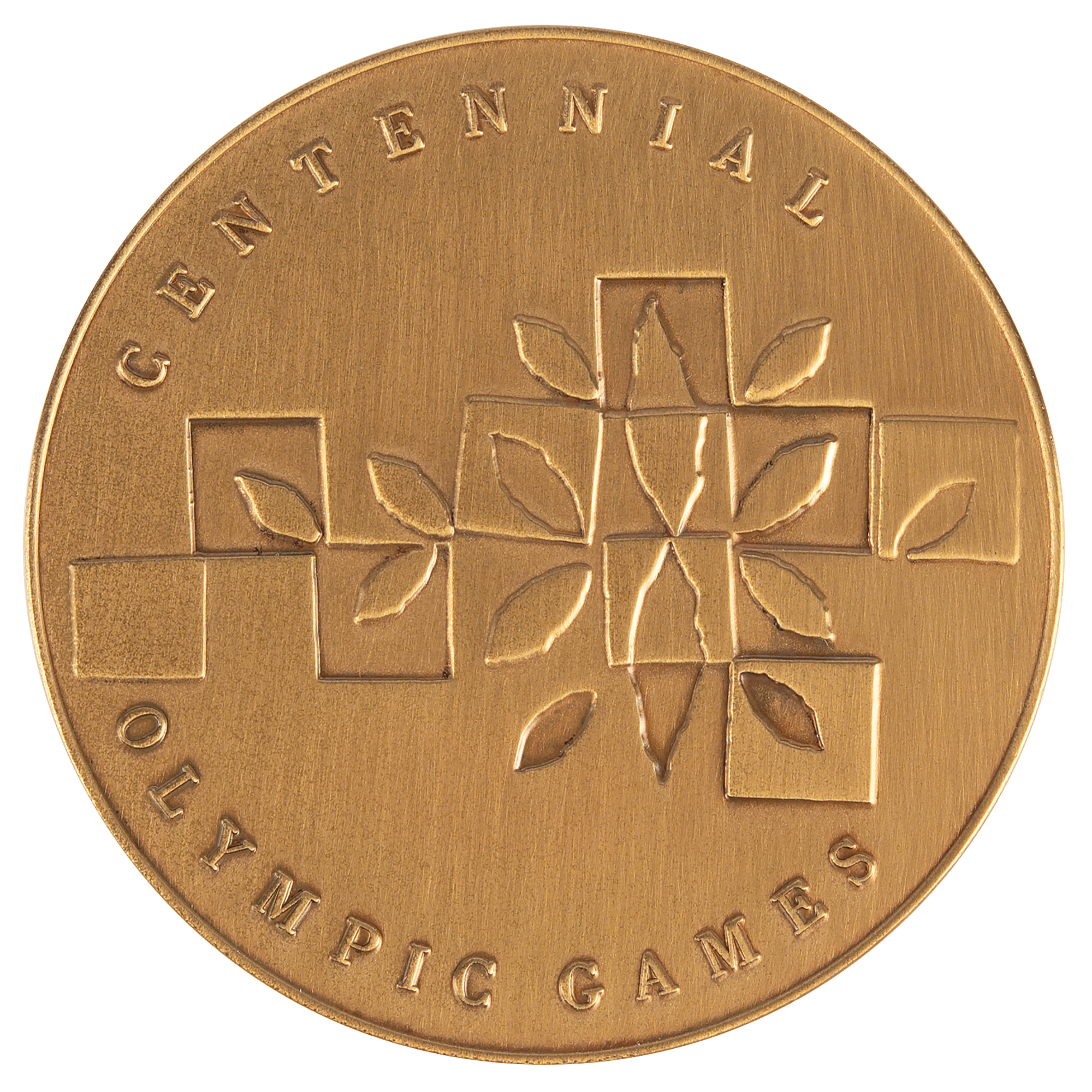 Participation medal issued for the 1996 Atlanta Summer Olympics. Bronze, 60 mm, 57 gm, by Malcolm Grear Designers. The front features the Atlanta Games emblem under raised text, "Games of the XXVI Olympiad"; the reverse bears a quilt of leaves and the raised text, "Centennial Olympic Games." Complete with its green box and pouch.